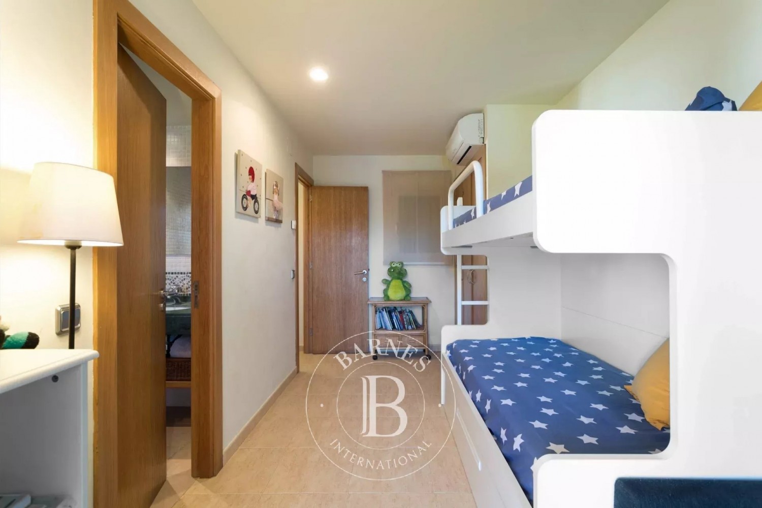 On the ground floor, there is a spacious living room with access to the terrace and pool, a modern fully equipped kitchen, two bedrooms, and a laundry room.