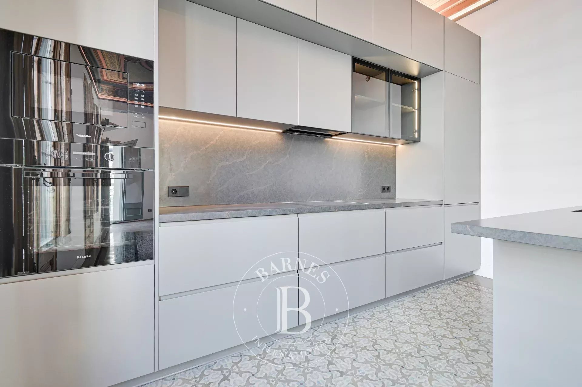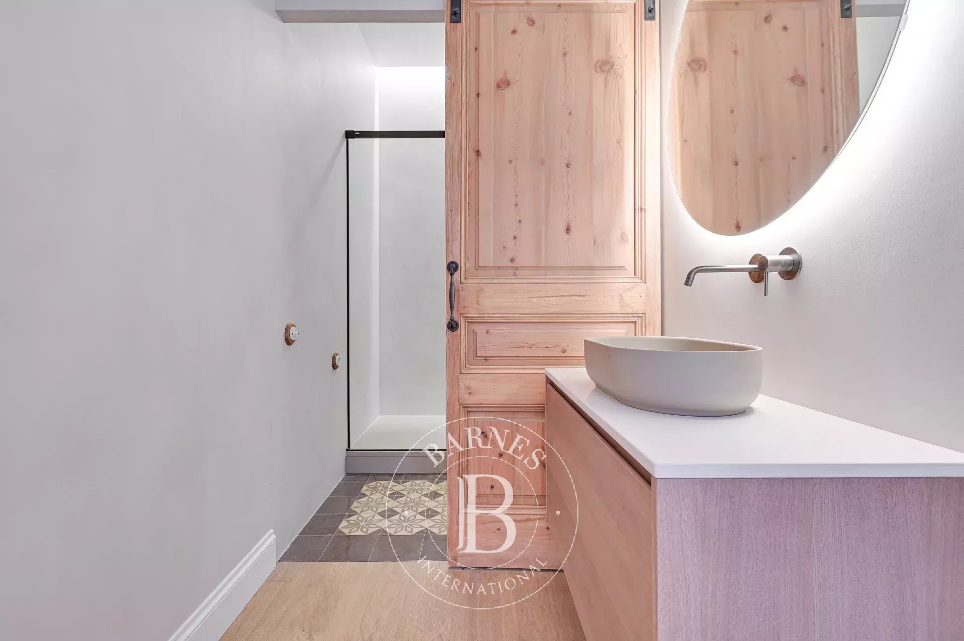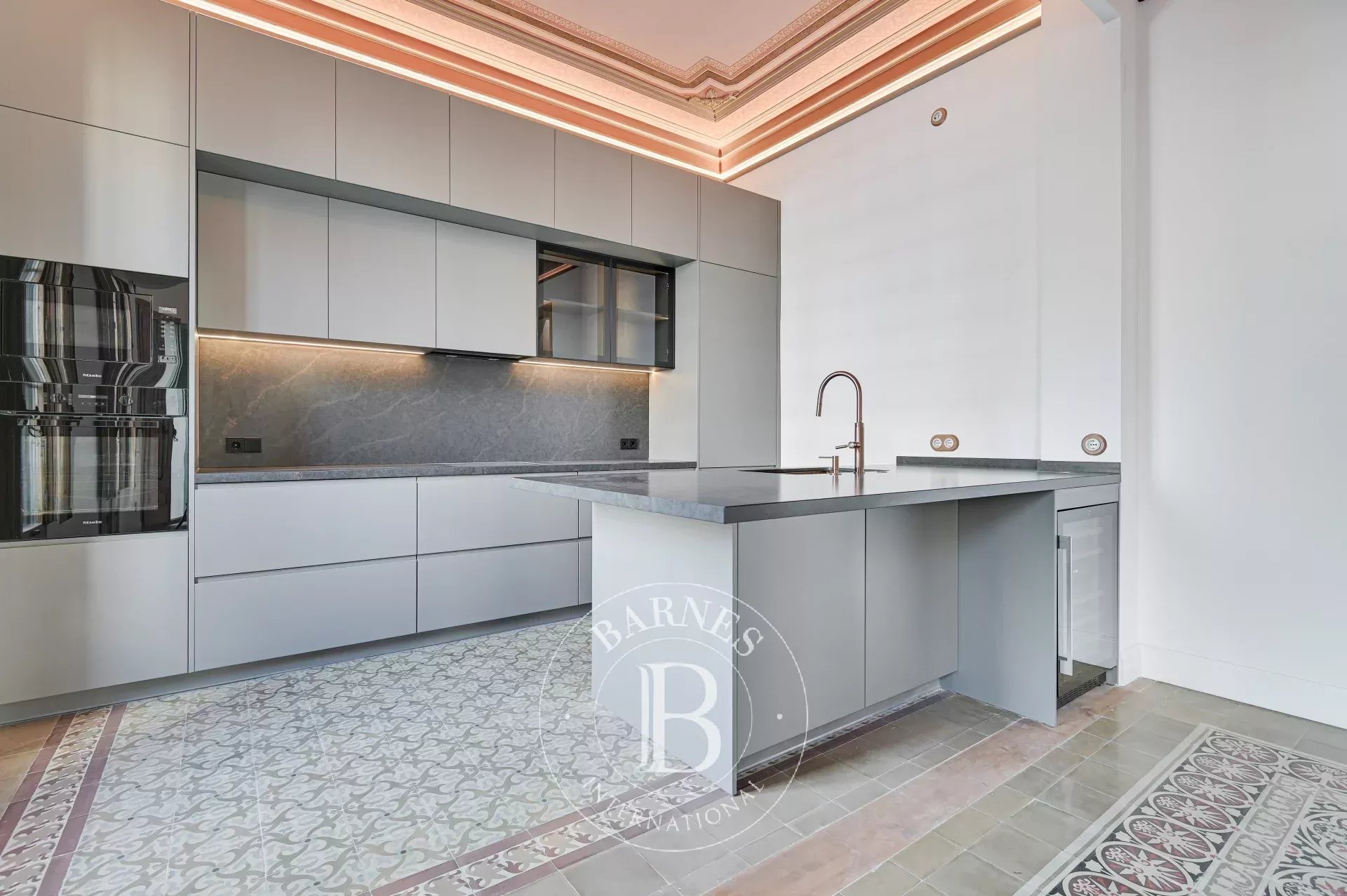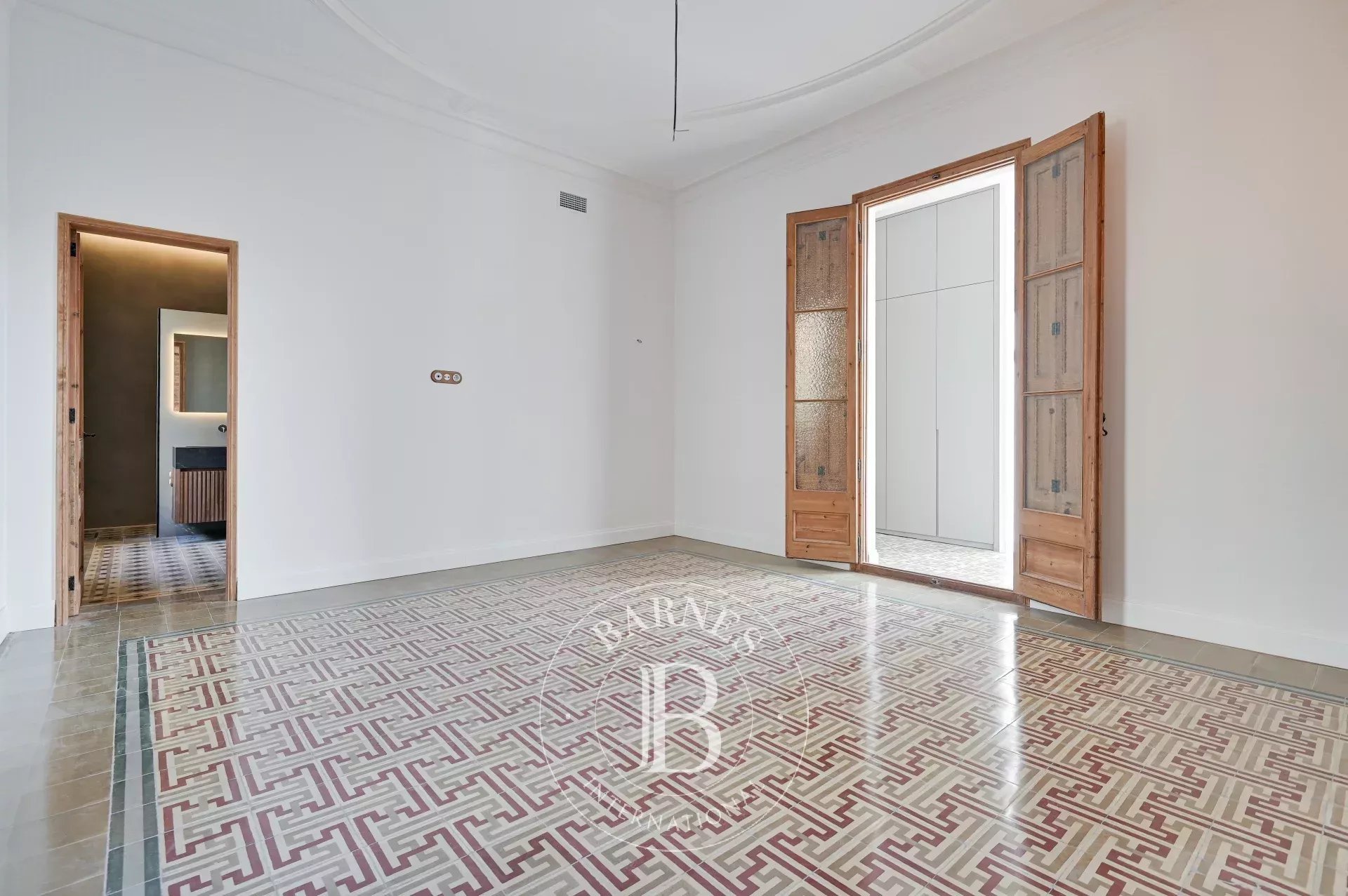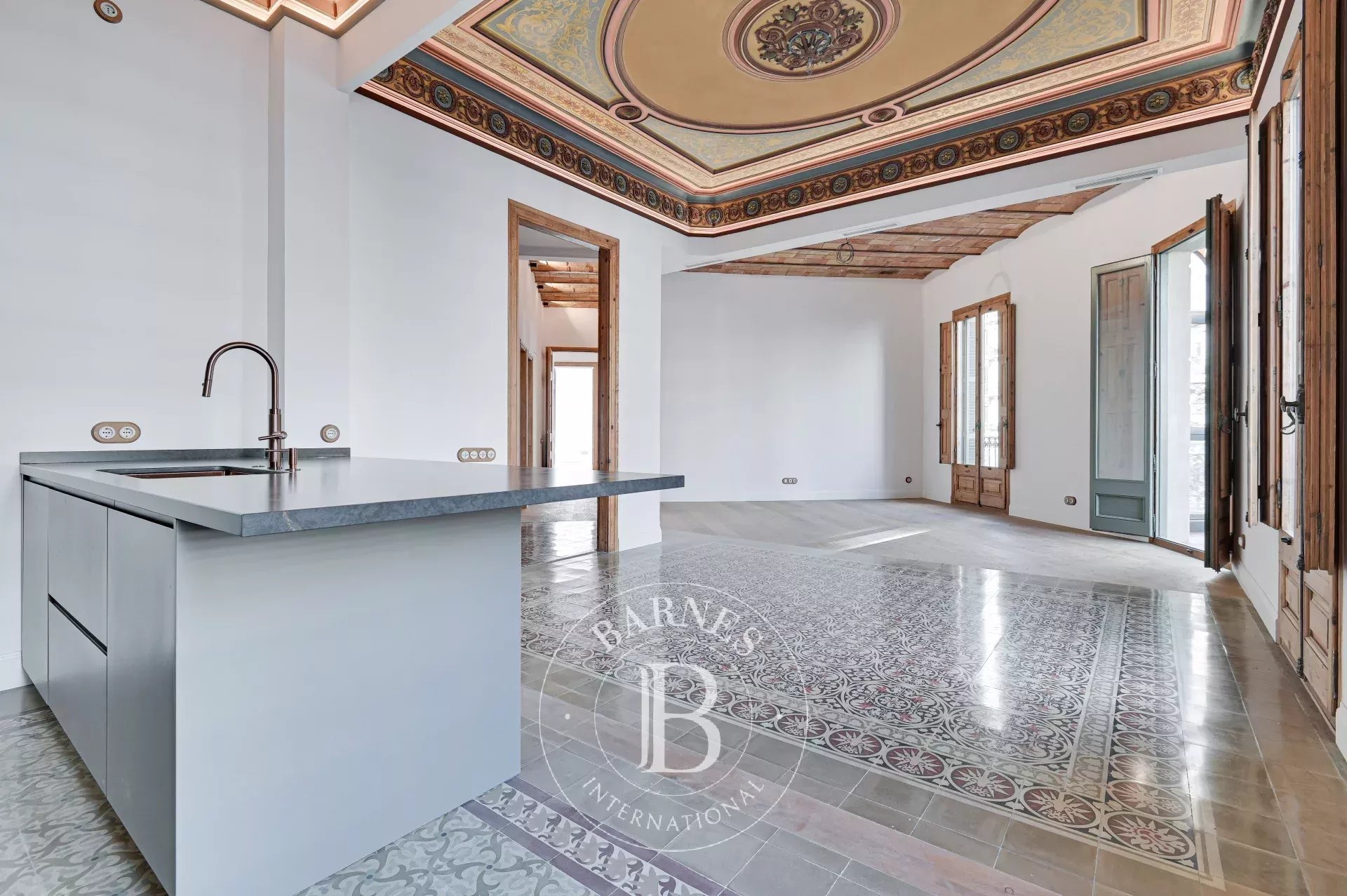 L'ànima de l'habitatge és el seu espaiós saló menjador amb cuina integrada, un espai que fusiona a la perfecció elements històrics amb tocs contemporanis. Els sòls de mosaïc hidràulic originals, combinats amb elegants sòls de parquet, creen un ambient clàssic i acollidor. Els sostres alts, recuperats i curosament restaurats, juntament amb la volta catalana tradicional i les grans finestres de fusta, inunden l'estança de llum natural, creant un espai ple de vida i sofisticació. Per a una major comoditat, al costat d'aquesta àrea hi ha un lavabo de cortesia.