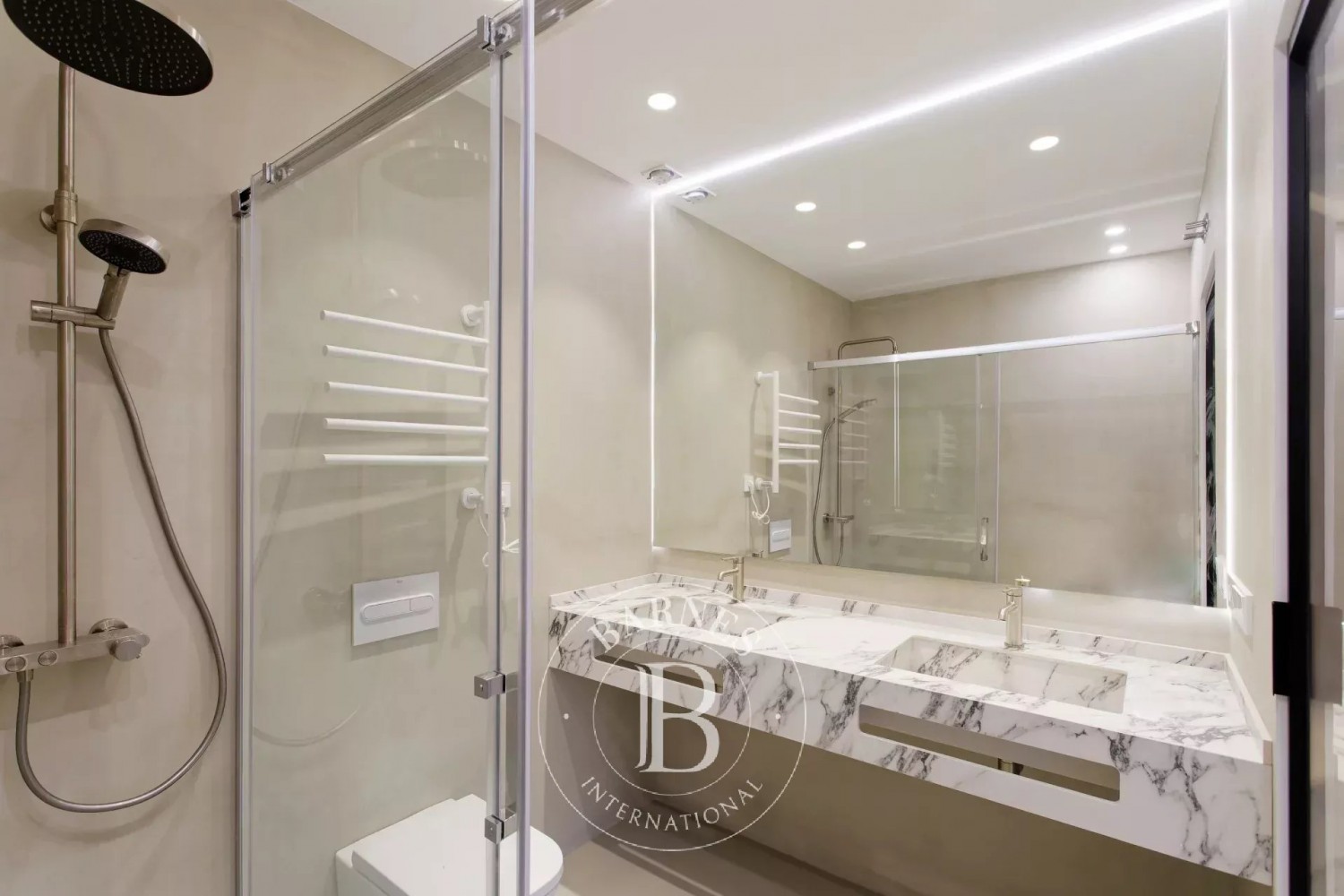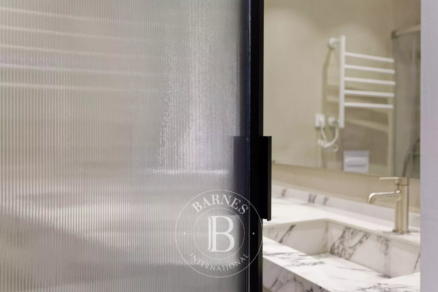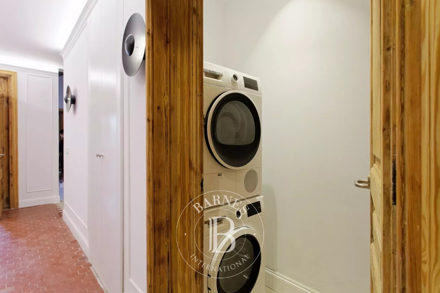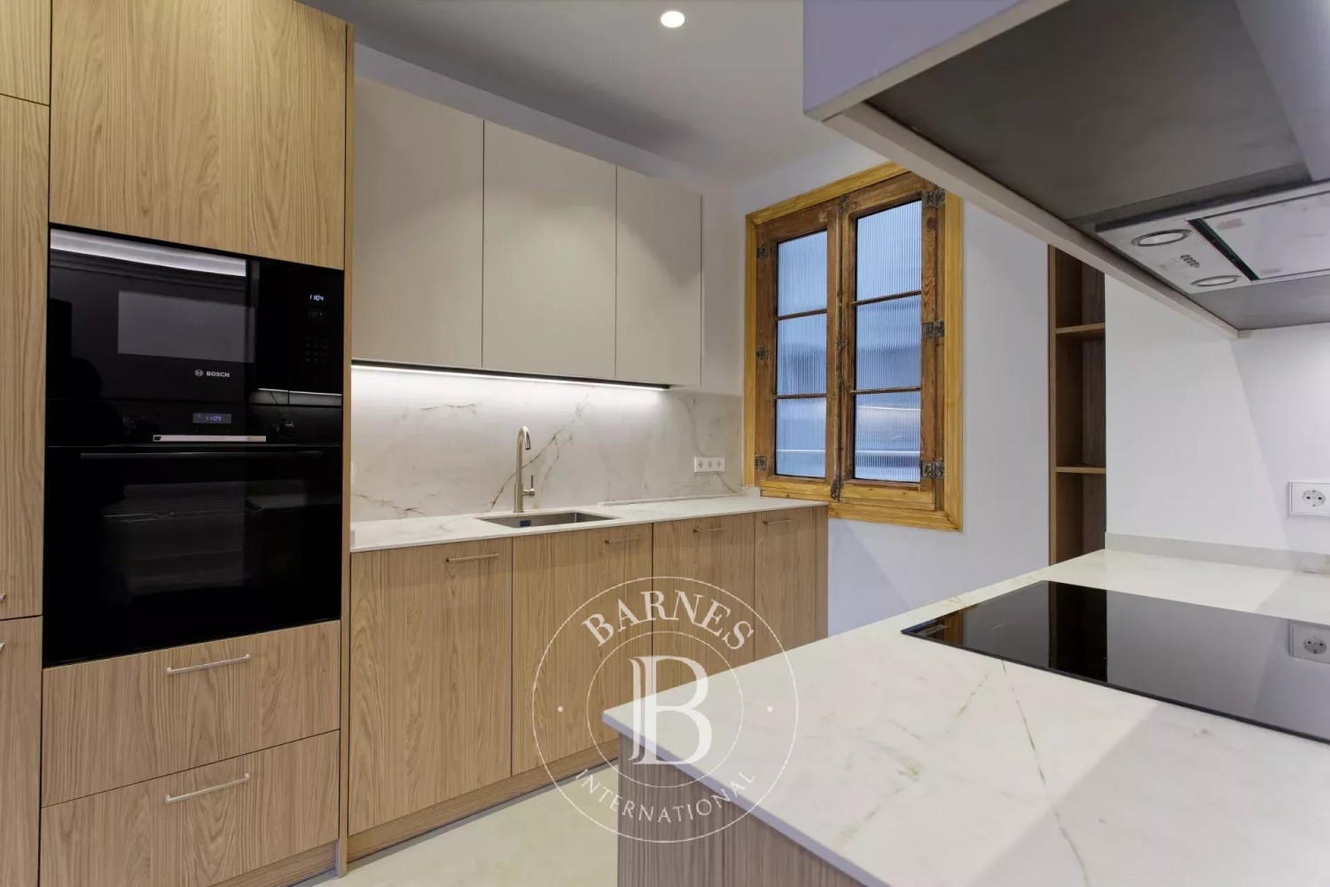 L’accés a l’habitatge es fa a través d’un ampli rebedor amb armari de cortesia que condueix a un elegant i lluminós saló–menjador. Aquest espai espectacular conserva elements originals com el paviment hidràulic, la volta catalana i les motllures restaurades, que aporten caràcter i autenticitat. La cuina oberta, completament equipada amb electrodomèstics integrats i un disseny de línies depurades, s’integra a la perfecció en la zona social, creant un ambient càlid i funcional. L’habitatge disposa de sistema d’aire condicionat i calefacció per conductes per garantir el màxim confort.