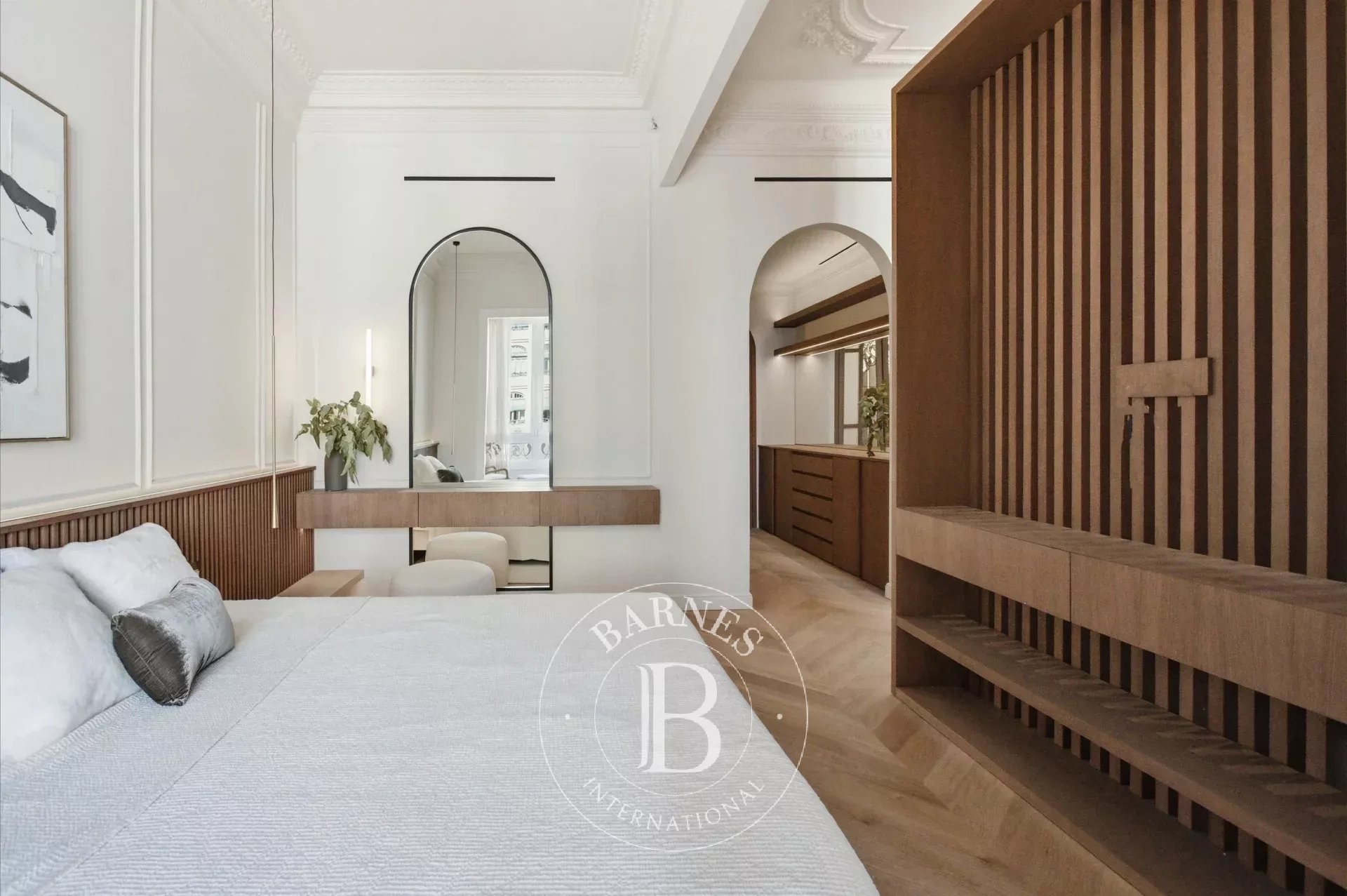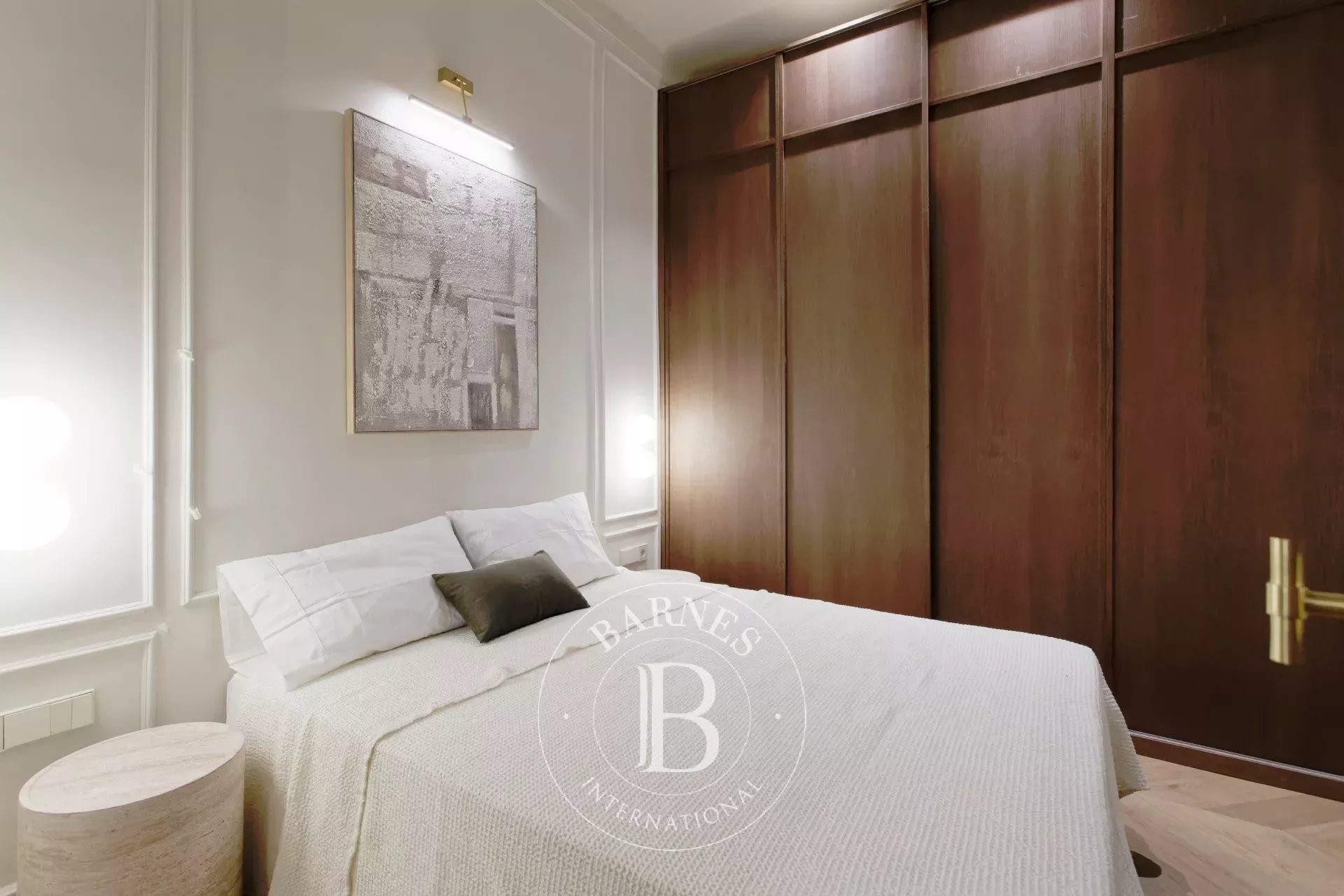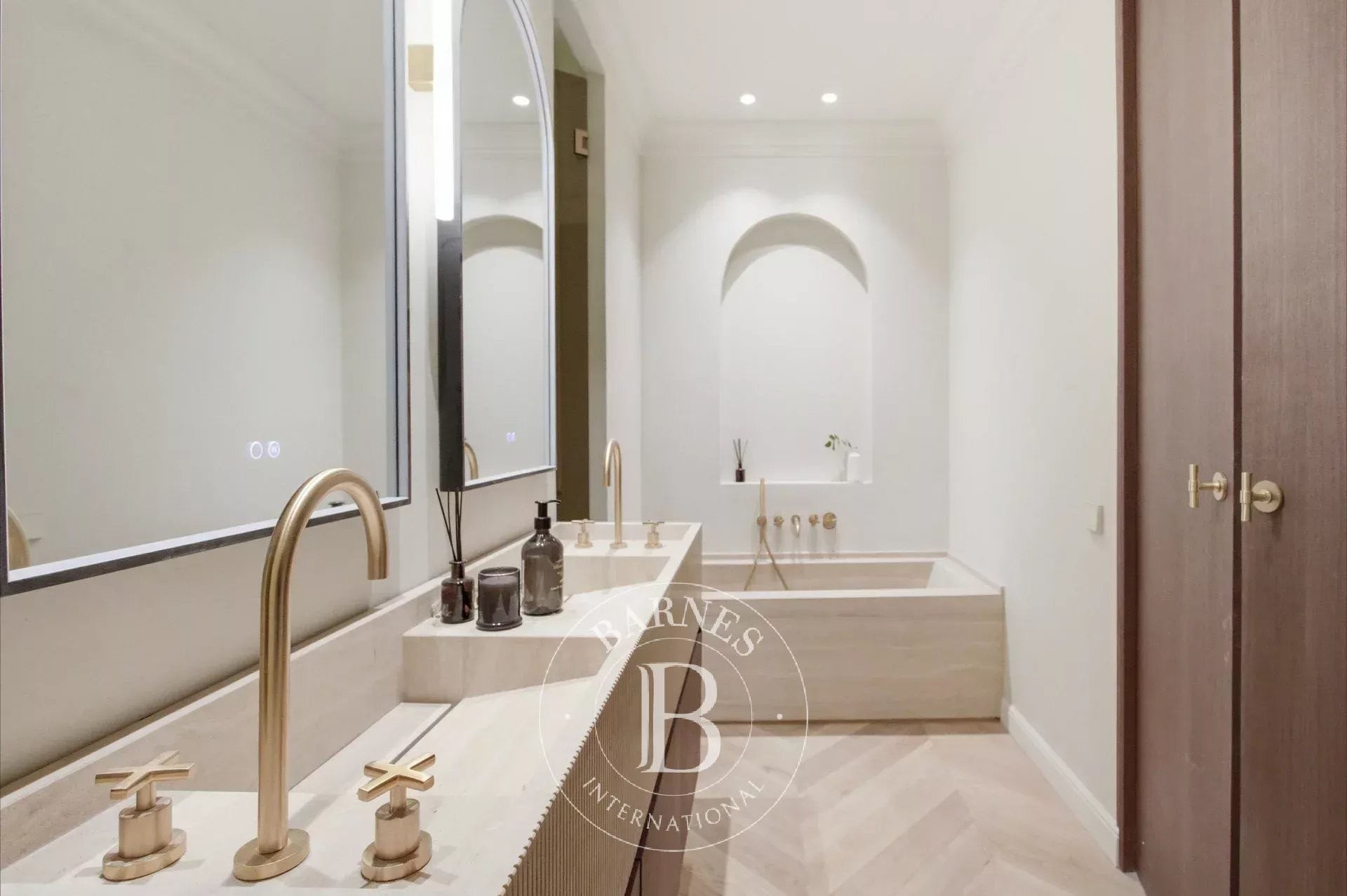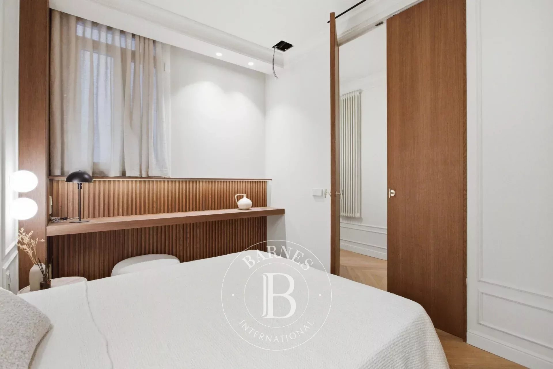 La suite principal és un espai íntim i sofisticat, amb llum natural i motllures originals restaurades. Inclou un vestidor de fusta amb il·luminació integrada. El bany en suite, revestit en travertí i microciment, ofereix banyera, dutxa independent i aixetes de disseny en acabats metàl·lics càlids.