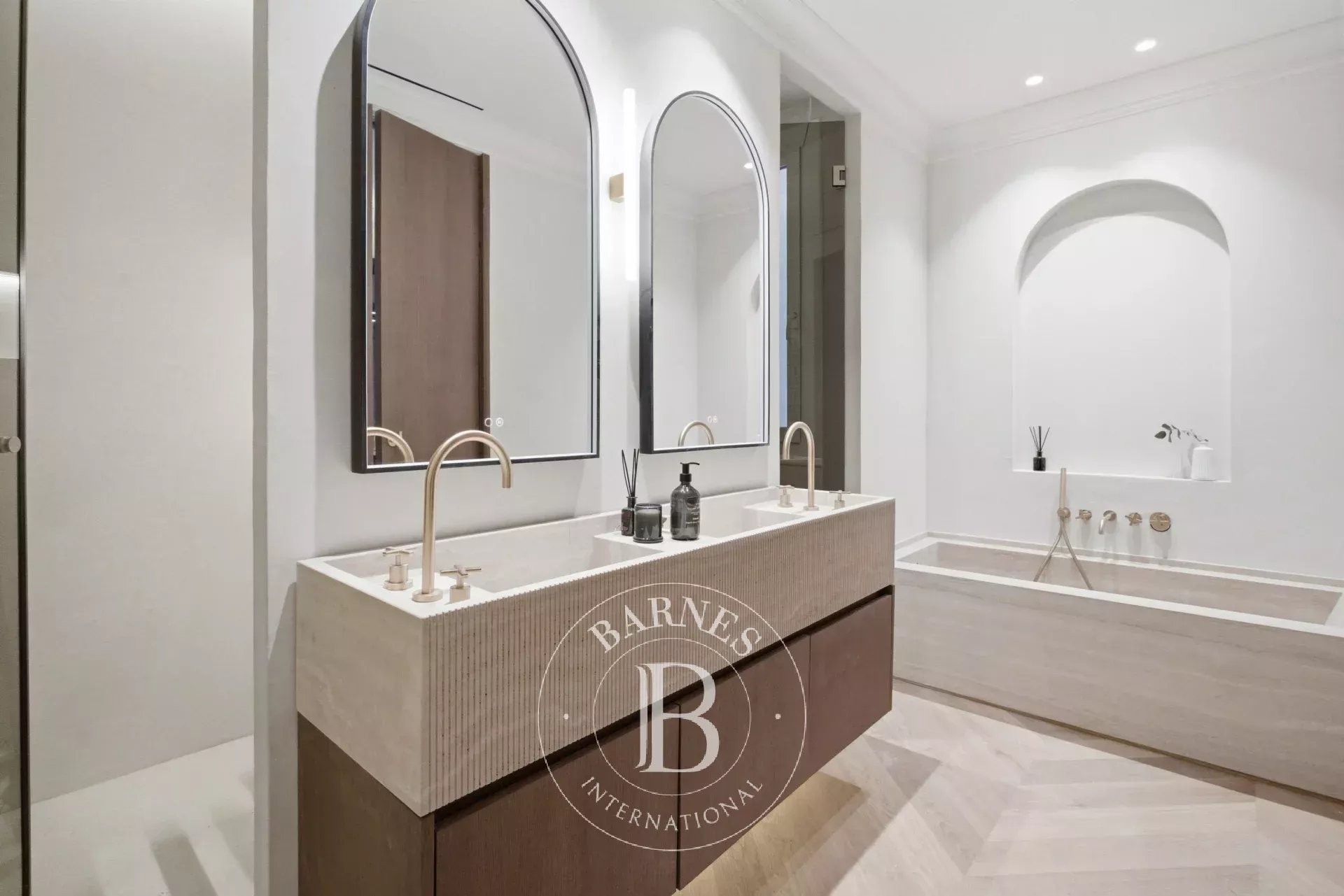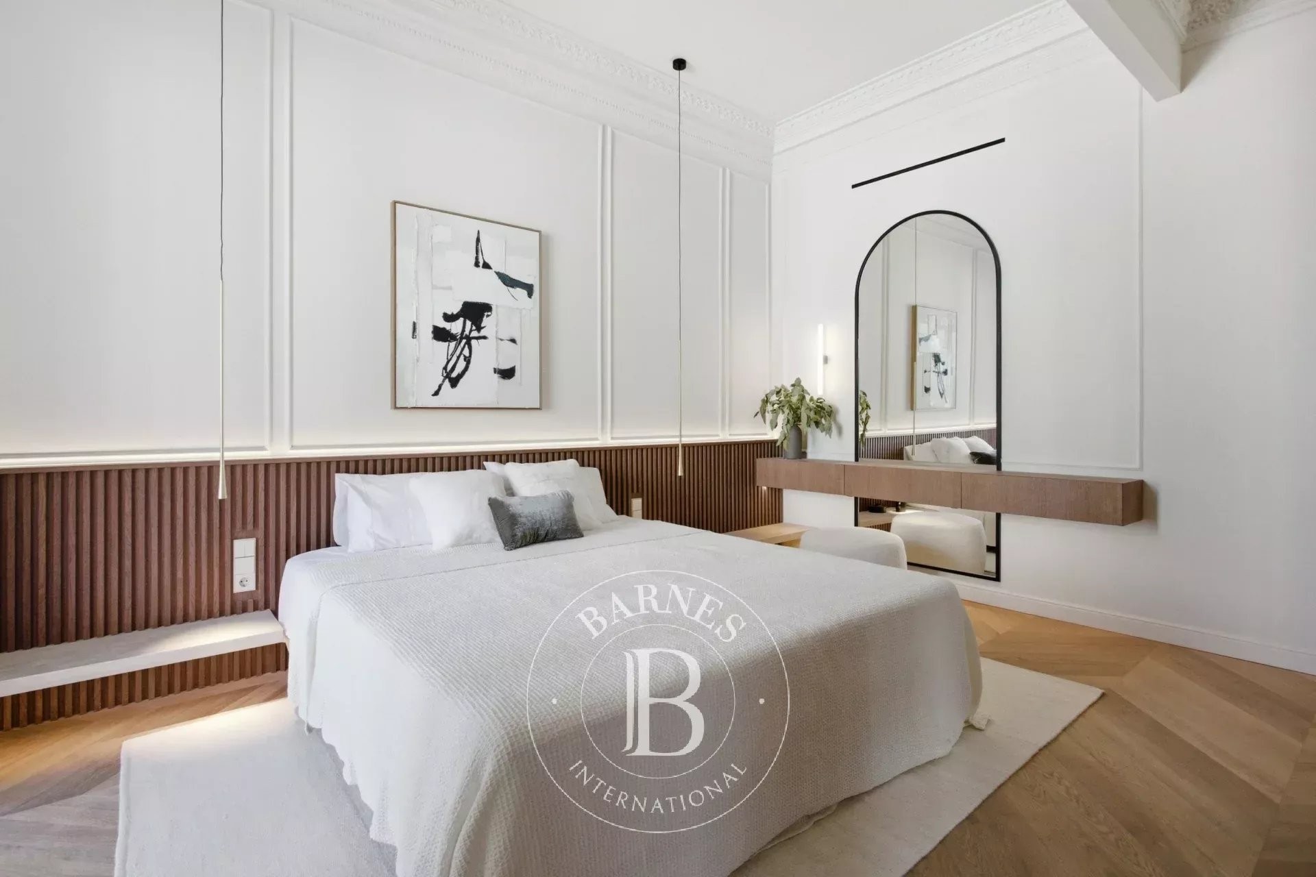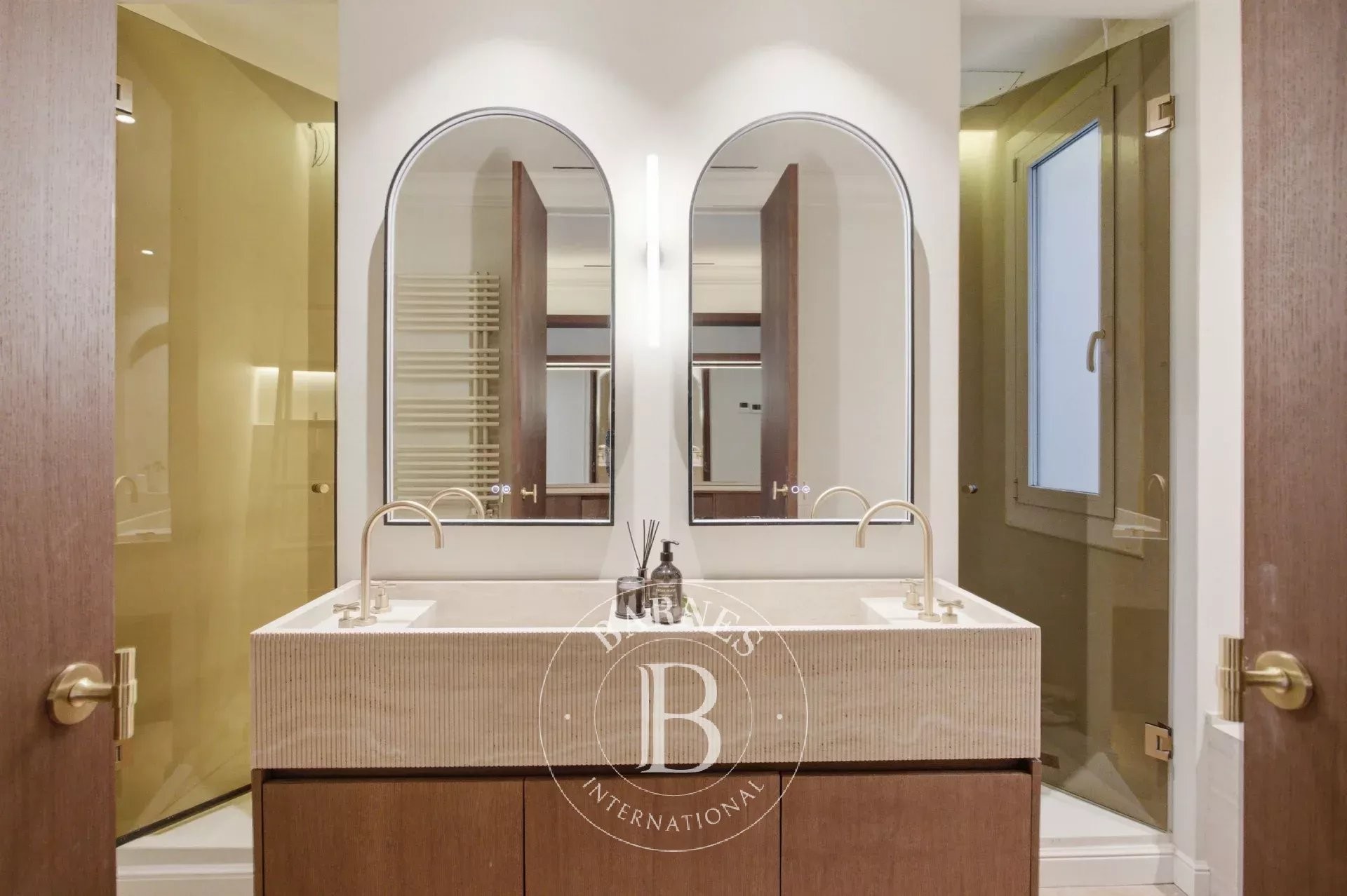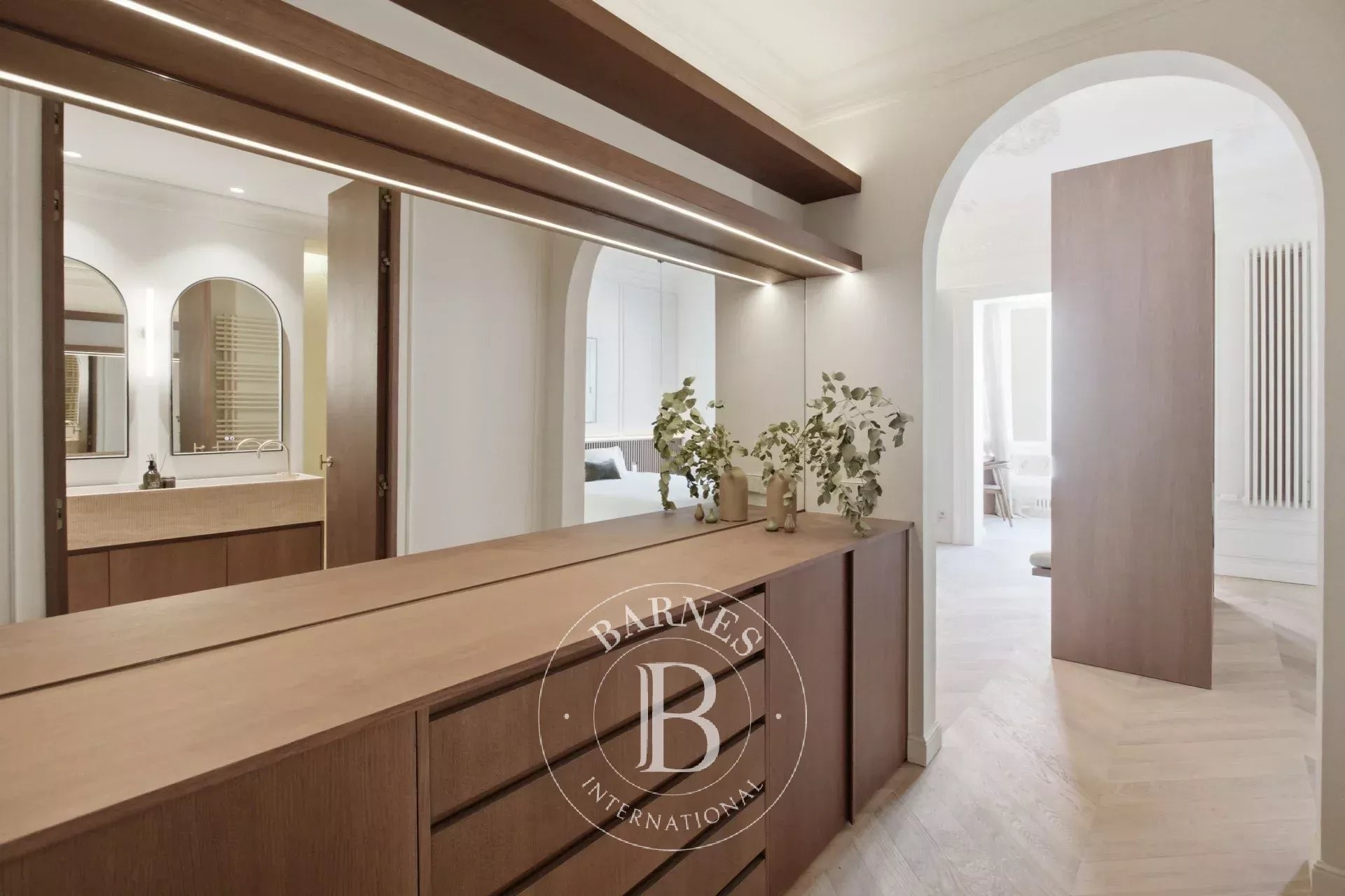 La suite principal és un espai íntim i sofisticat, amb llum natural i motllures originals restaurades. Inclou un vestidor de fusta amb il·luminació integrada. El bany en suite, revestit en travertí i microciment, ofereix banyera, dutxa independent i aixetes de disseny en acabats metàl·lics càlids.
