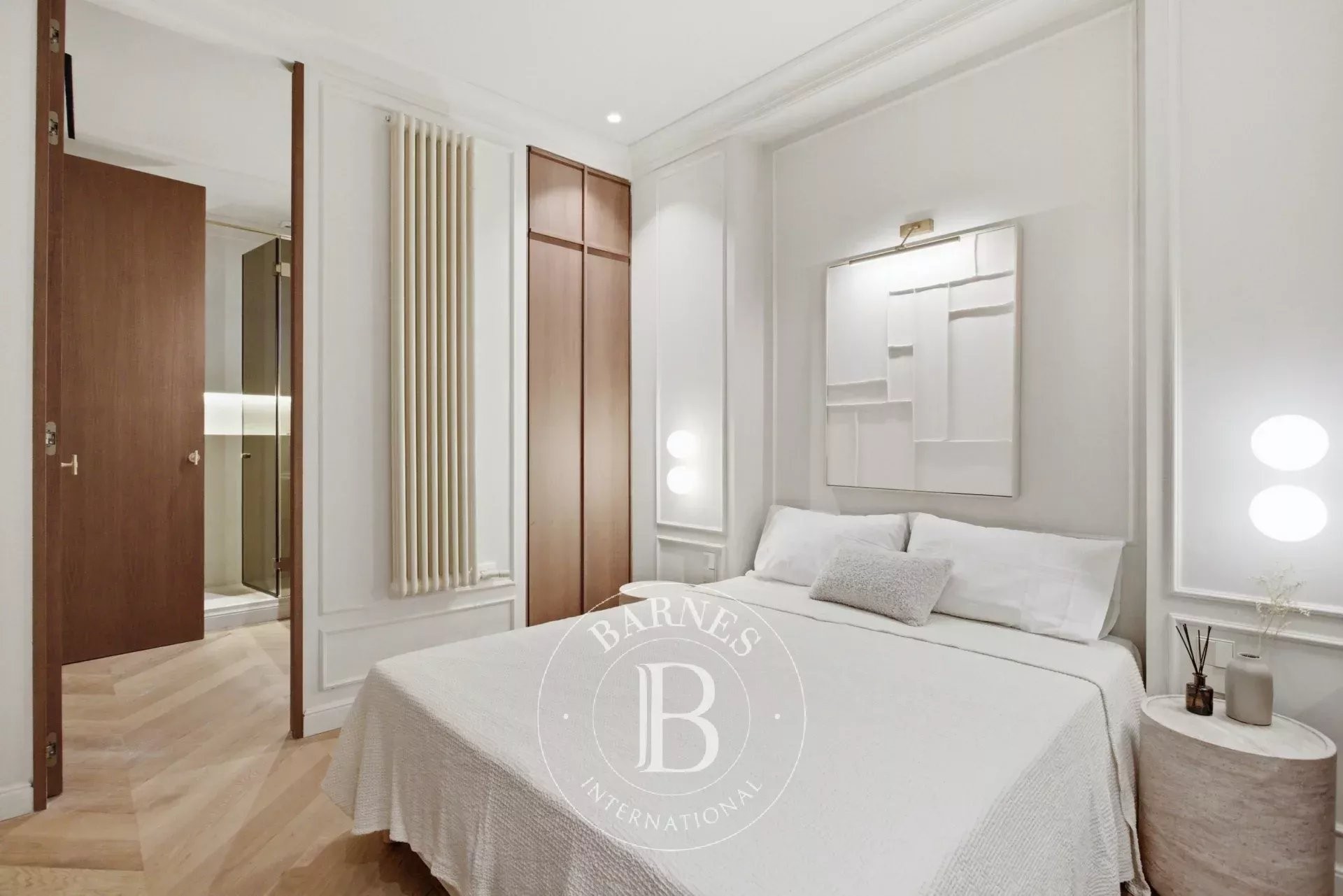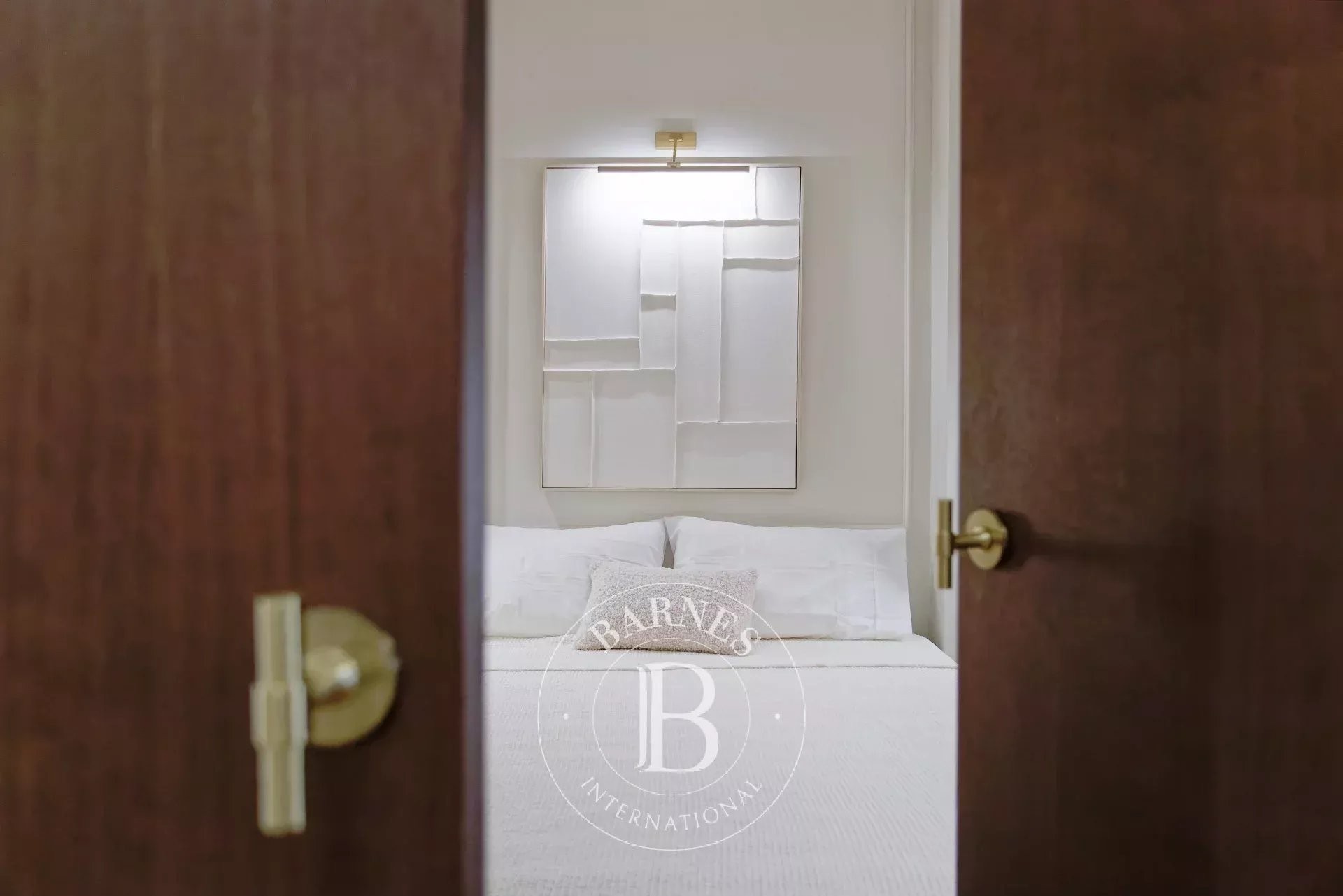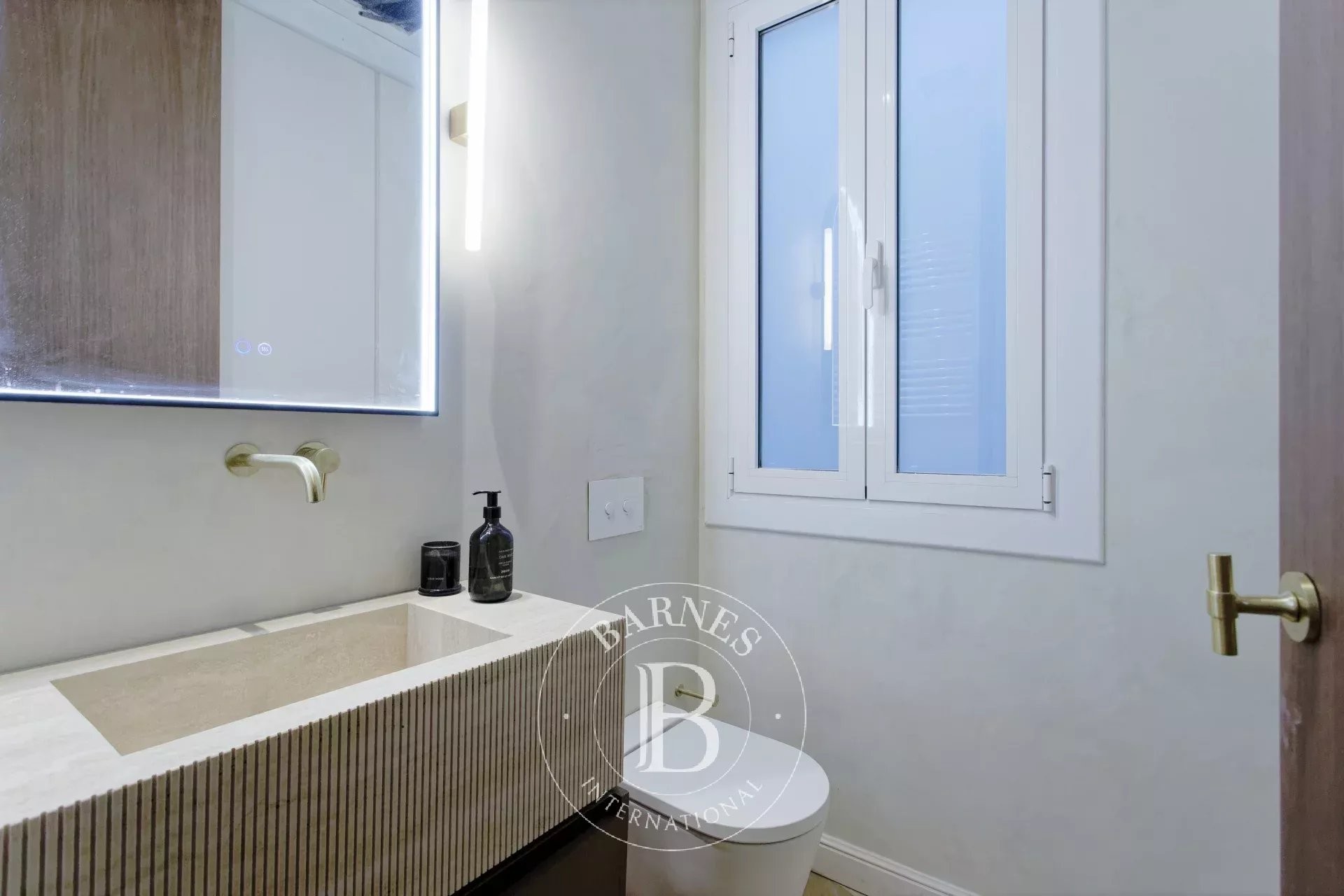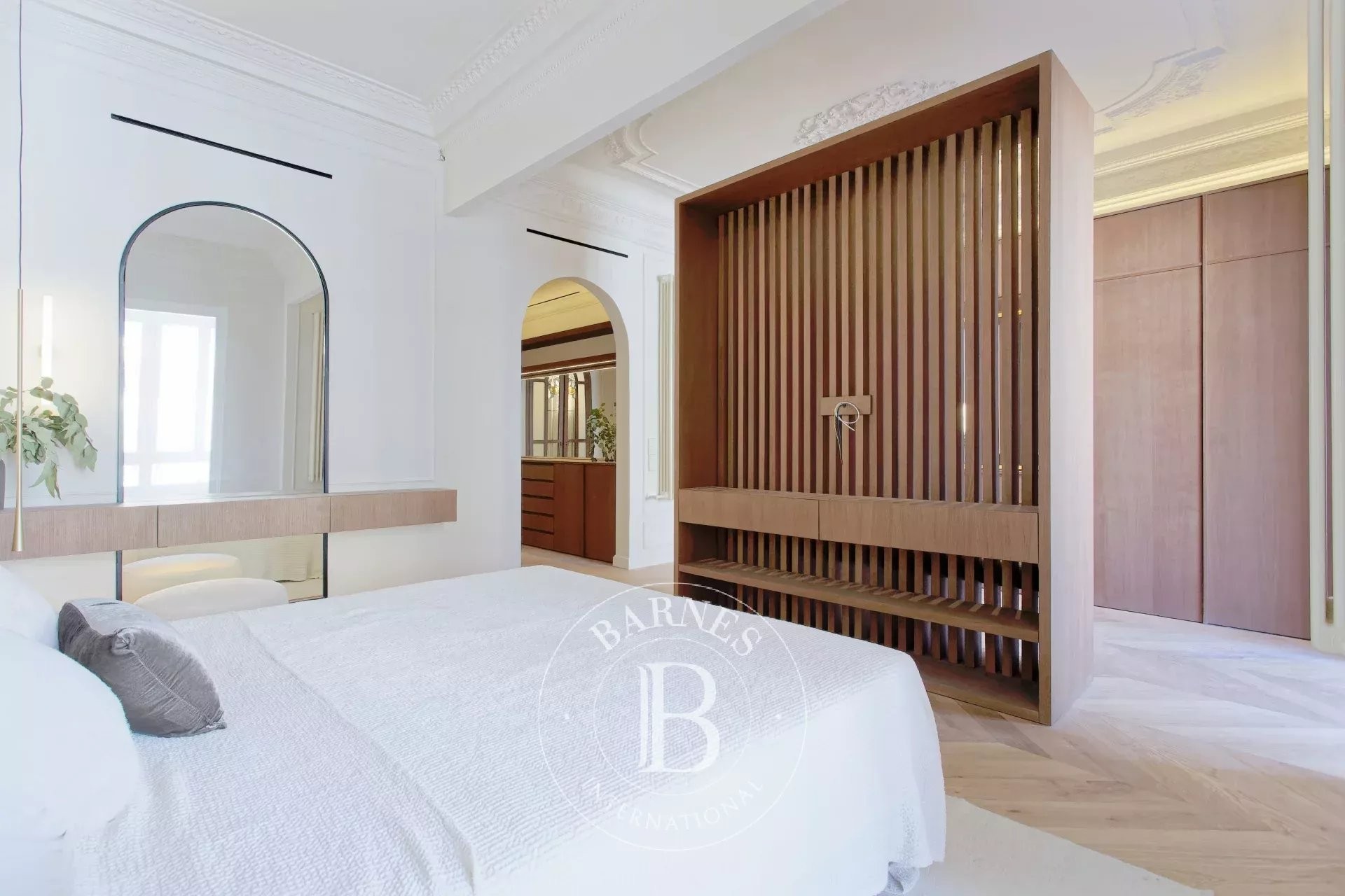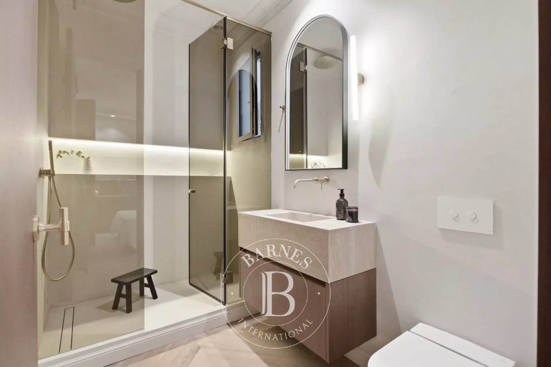 La suite principal és un espai íntim i sofisticat, amb llum natural i motllures originals restaurades. Inclou un vestidor de fusta amb il·luminació integrada. El bany en suite, revestit en travertí i microciment, ofereix banyera, dutxa independent i aixetes de disseny en acabats metàl·lics càlids.