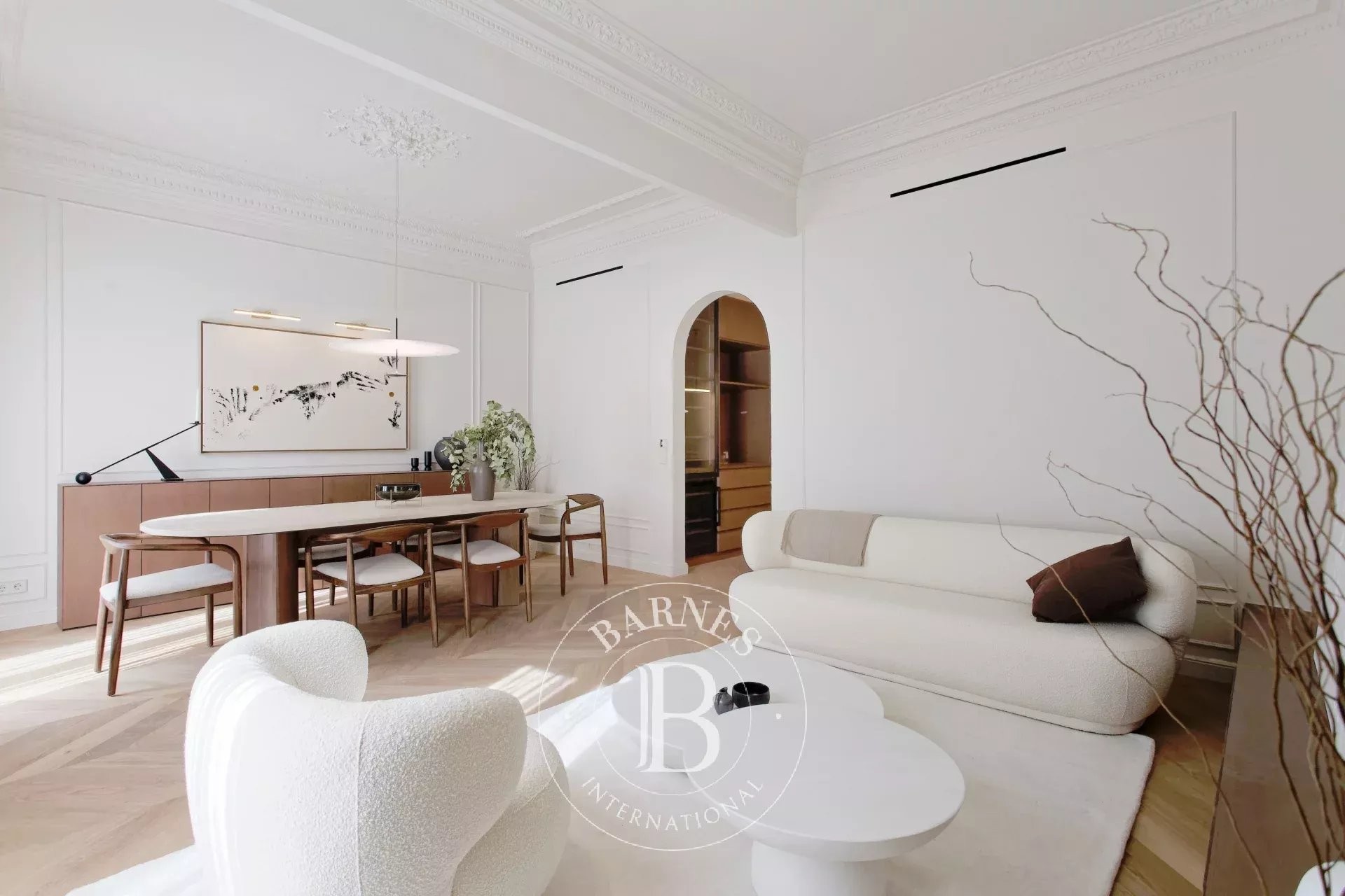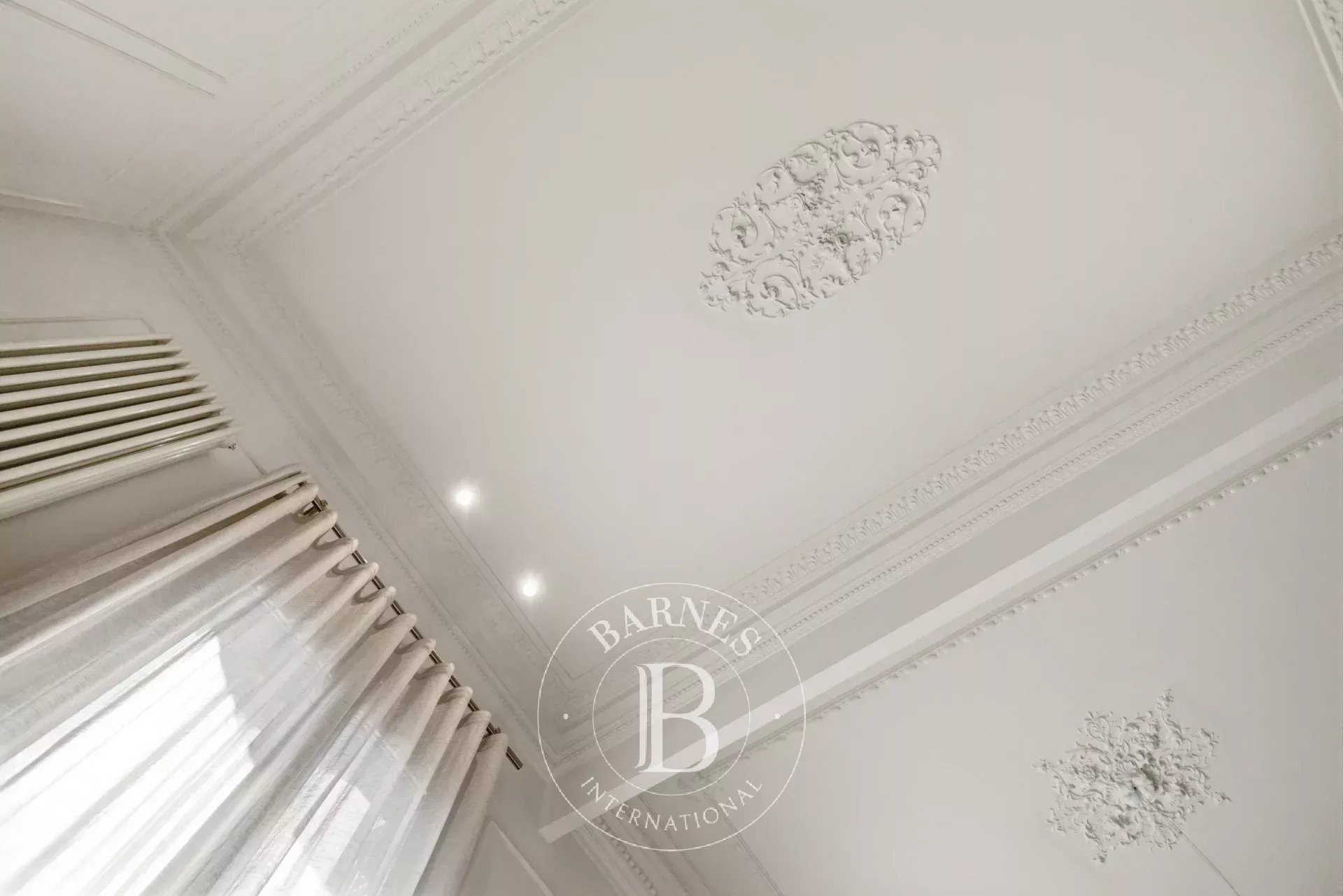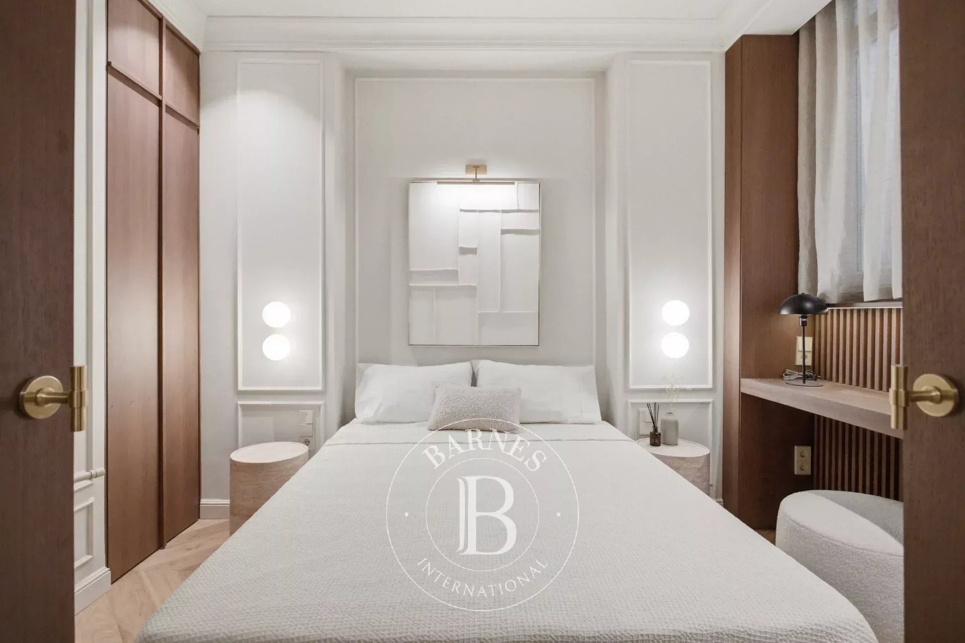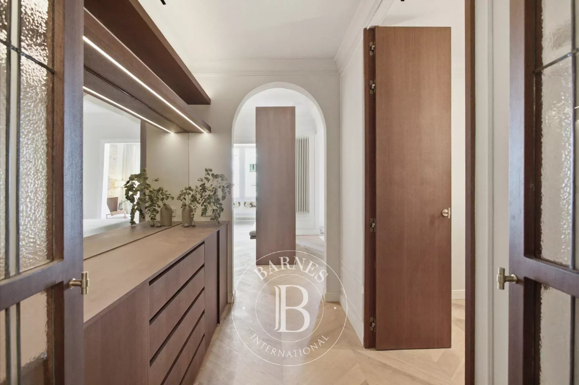 La suite principal és un espai íntim i sofisticat, amb llum natural i motllures originals restaurades. Inclou un vestidor de fusta amb il·luminació integrada. El bany en suite, revestit en travertí i microciment, ofereix banyera, dutxa independent i aixetes de disseny en acabats metàl·lics càlids.