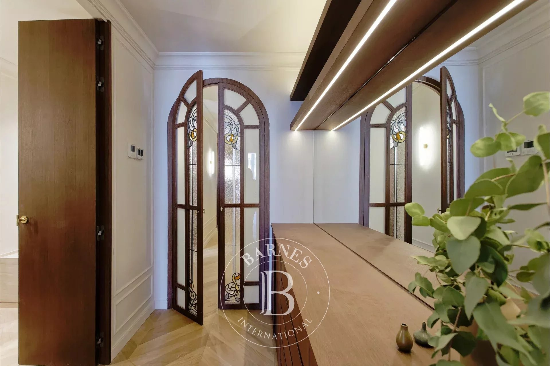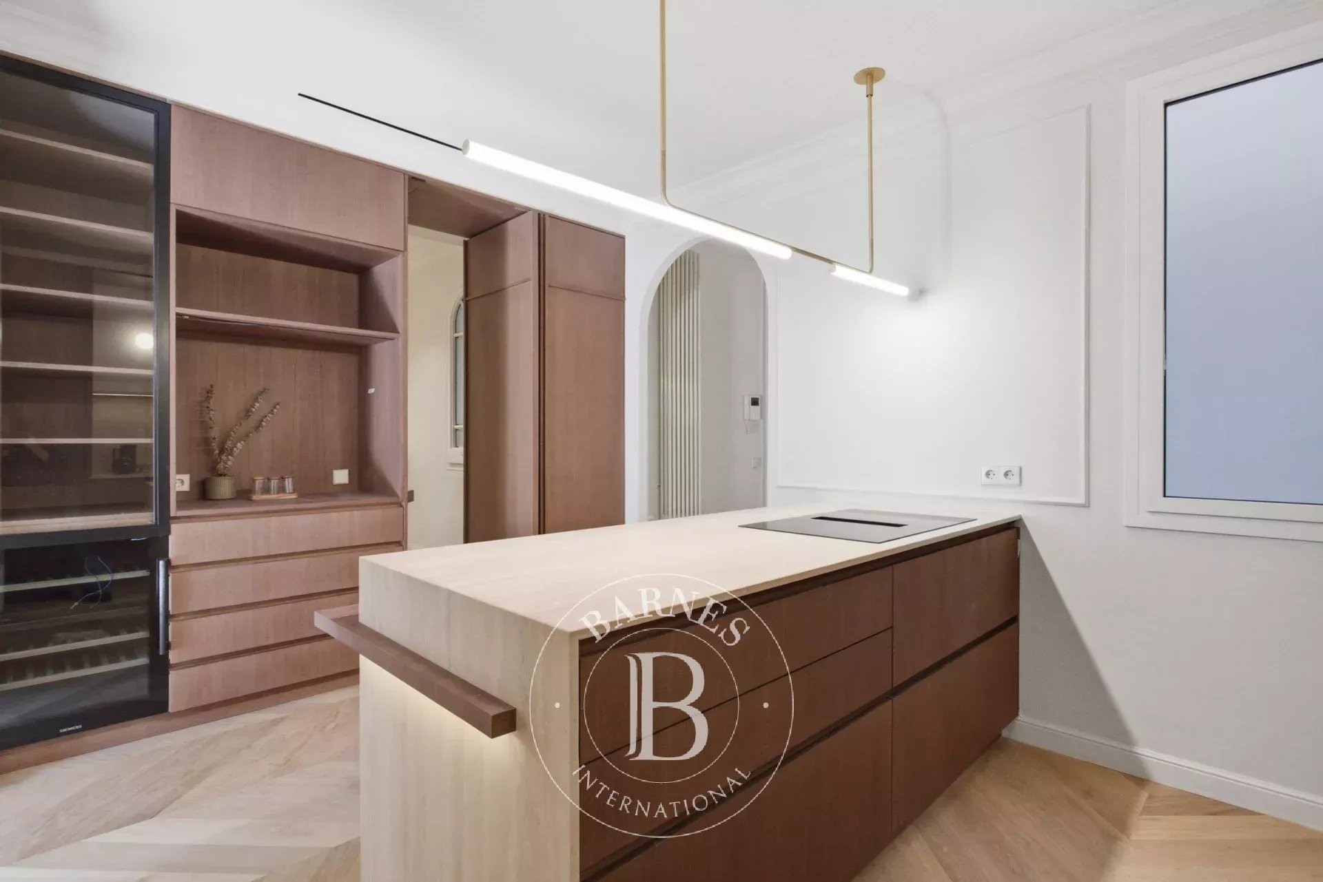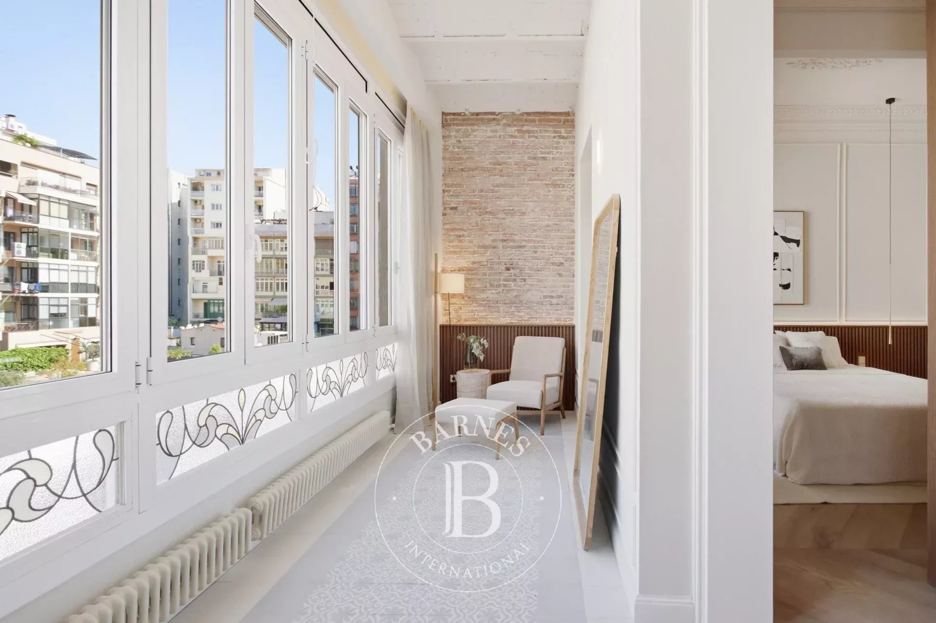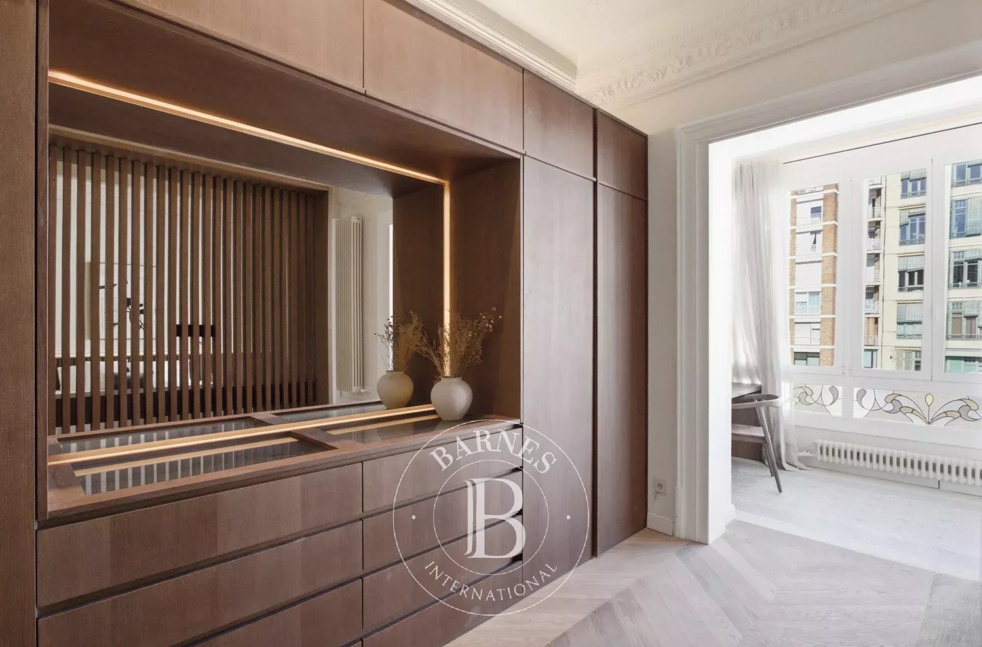 Des de l’entrada, la propietat transmet una elegància atemporal i serena: una finestra modernista restaurada, fusteries de roure fetes a mida i acabats en fusta natural defineixen una identitat arquitectònica coherent que s’estén per tot l’habitatge. Els sostres originals, el parquet de roure natural i la il·luminació de disseny reforcen aquesta sensació d’autenticitat i refinament.