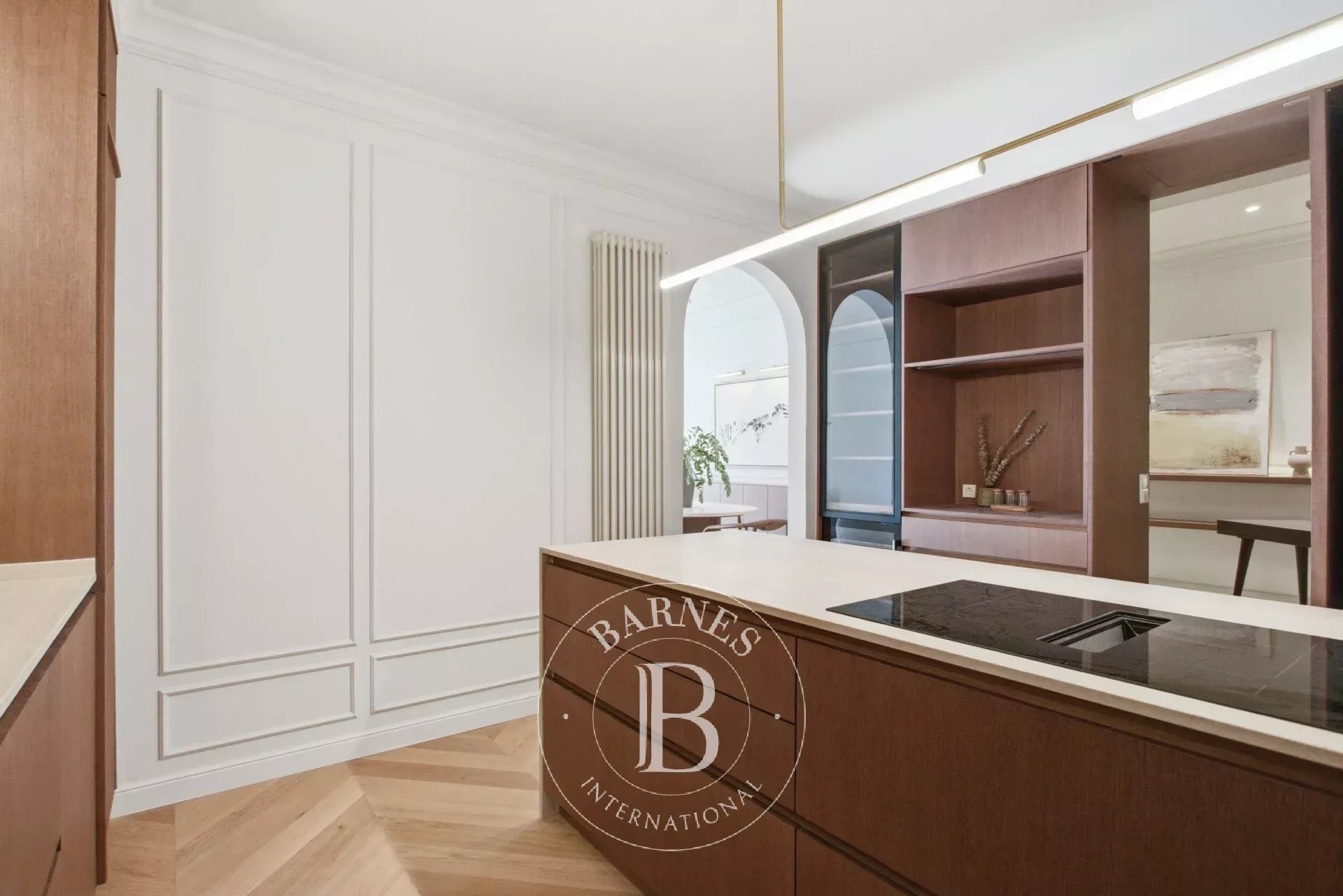 La cuina, separada de la zona de sala i menjador, ha estat concebuda com un espai funcional i estètic alhora. Al cor de l’habitatge, combina disseny elegant i execució impecable. Les superfícies de travertí s’estenen sobre l’illa, els taulells i el frontal, mentre que el parquet de roure en espiga aporta calidesa i continuïtat. Està completament equipada amb electrodomèstics Miele d’alta gamma, incloent frigorífic i rentavaixelles integrats, forn i microones encastats, vinoteca i placa d’inducció amb campana integrada.