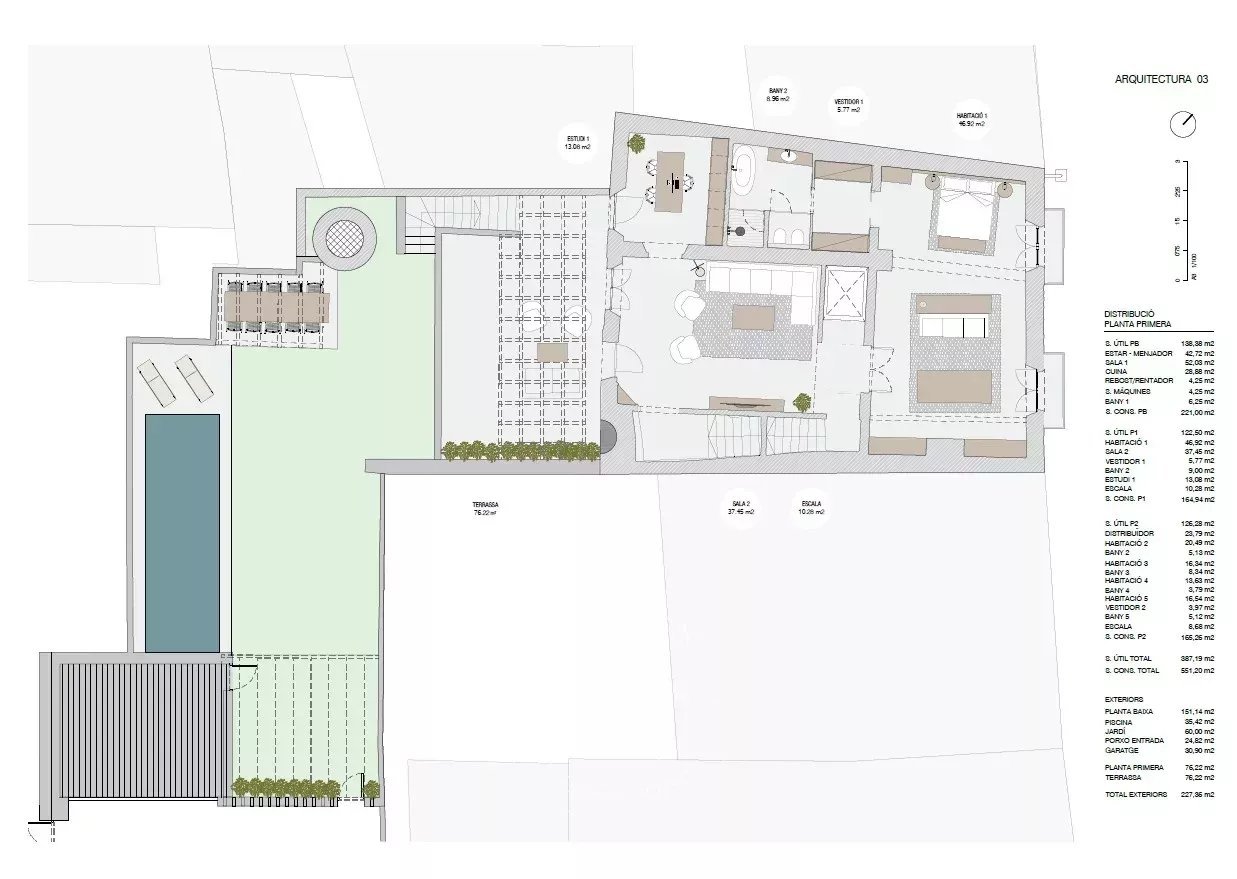 - Primera planta: saló d’hivern, despatx i suite principal amb vestidor i bany.