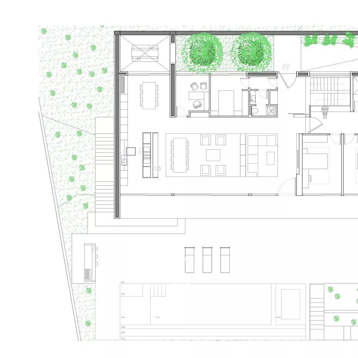 L’eficiència energètica i la qualitat constructiva són pilars essencials del projecte. Amb qualificació energètica classe A, la casa compta amb fusteria exterior amb trencament de pont tèrmic, doble envidrament, producció d’aigua calenta mitjançant energies renovables i il·luminació de baix consum.