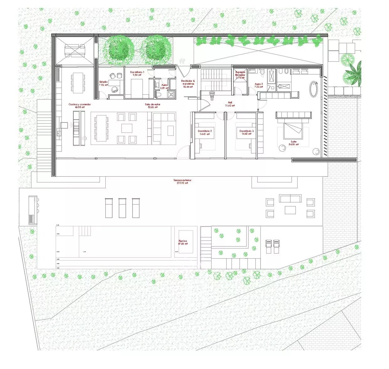El disseny arquitectònic aprofita al màxim l’orientació i la llum natural, reduint el consum energètic i assegurant una temperatura agradable durant tot l’any.