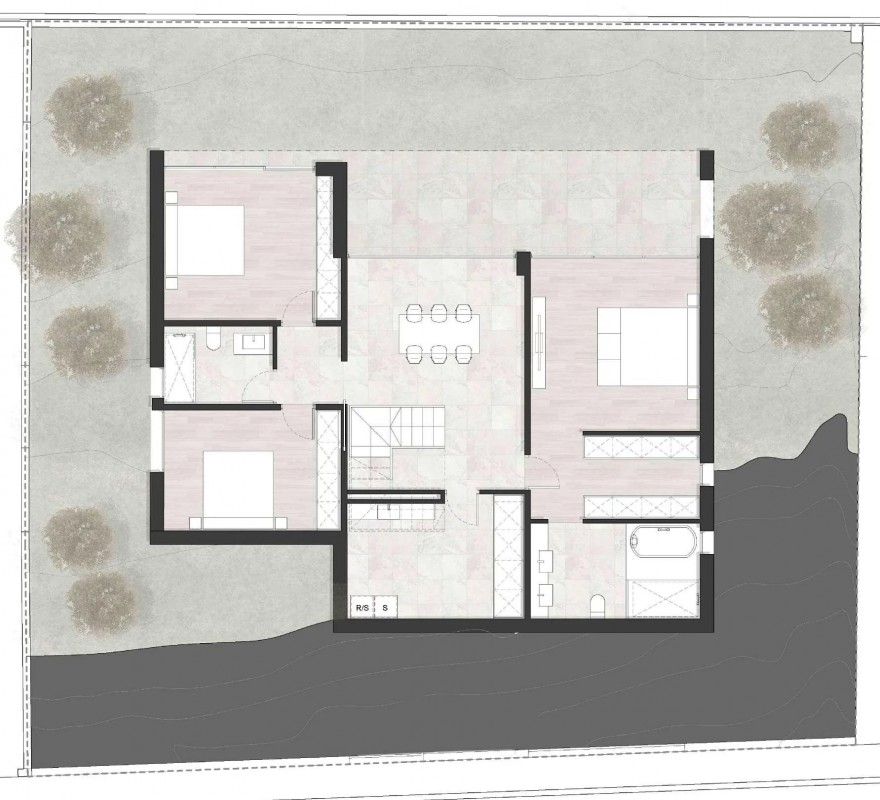 On the first floor is the master bedroom suite with dressing room and bathroom with bathtub, offering an oasis of tranquillity and privacy. You will also find three additional double bedrooms and a full bathroom. There is also a large laundry room with storage space and there is the living room with exit to the porch for summer dinners.