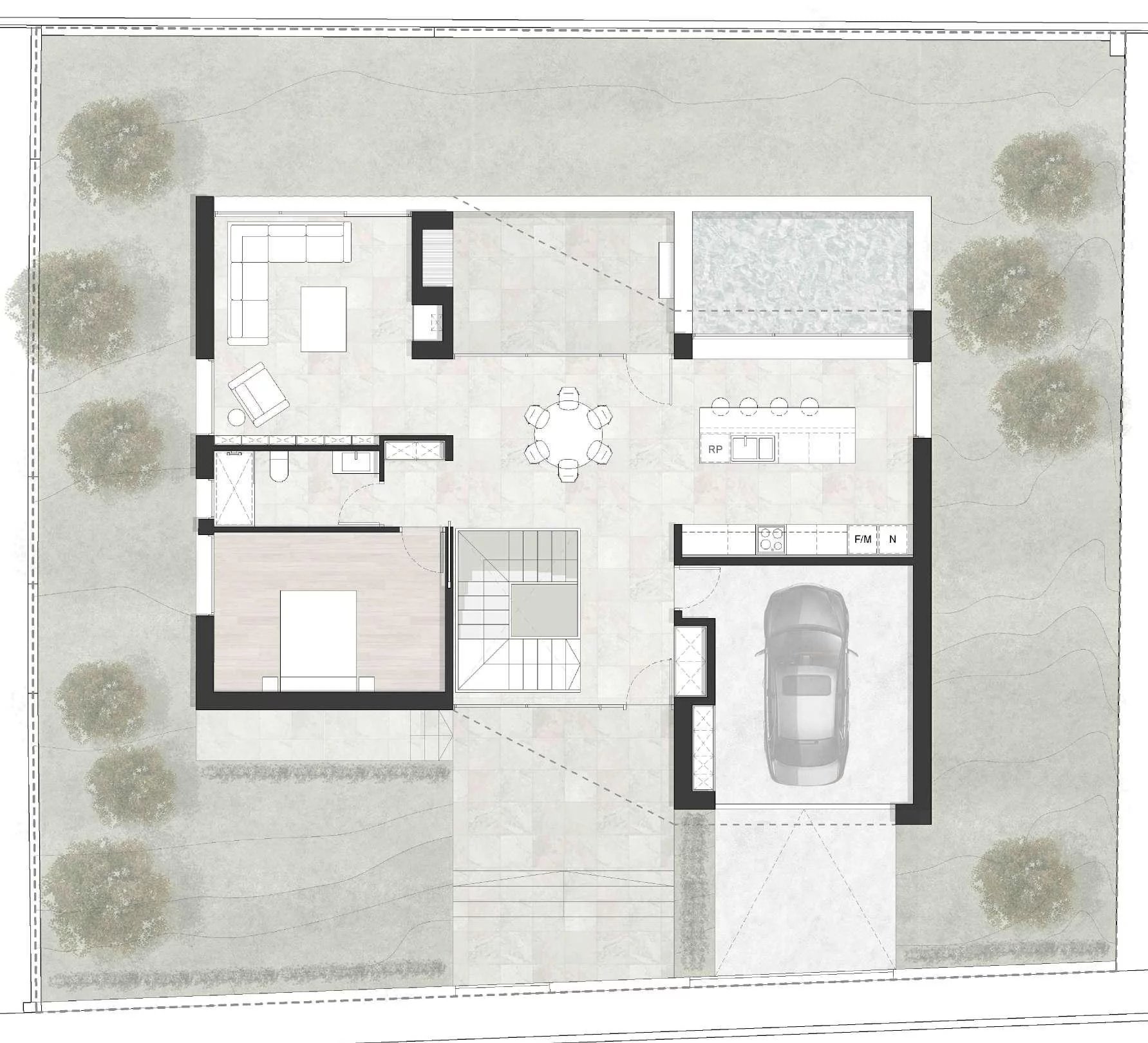 On the ground floor, there is a large entrance hall with a very luminous space. An open-plan kitchen overlooking the pool is perfect for foodies, while the dining room and living room with fireplace are ideal for relaxing and entertaining the whole family. There is also a bedroom with en-suite bathroom on this floor.