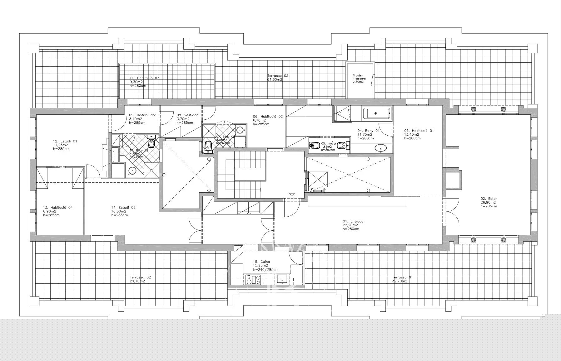 Exclusive penthouse located in an elegant classical building in the upper area of Barcelona, occupying the entire floor and benefiting from a privileged four-sided orientation, ensuring natural light throughout the day and a unique sense of privacy.