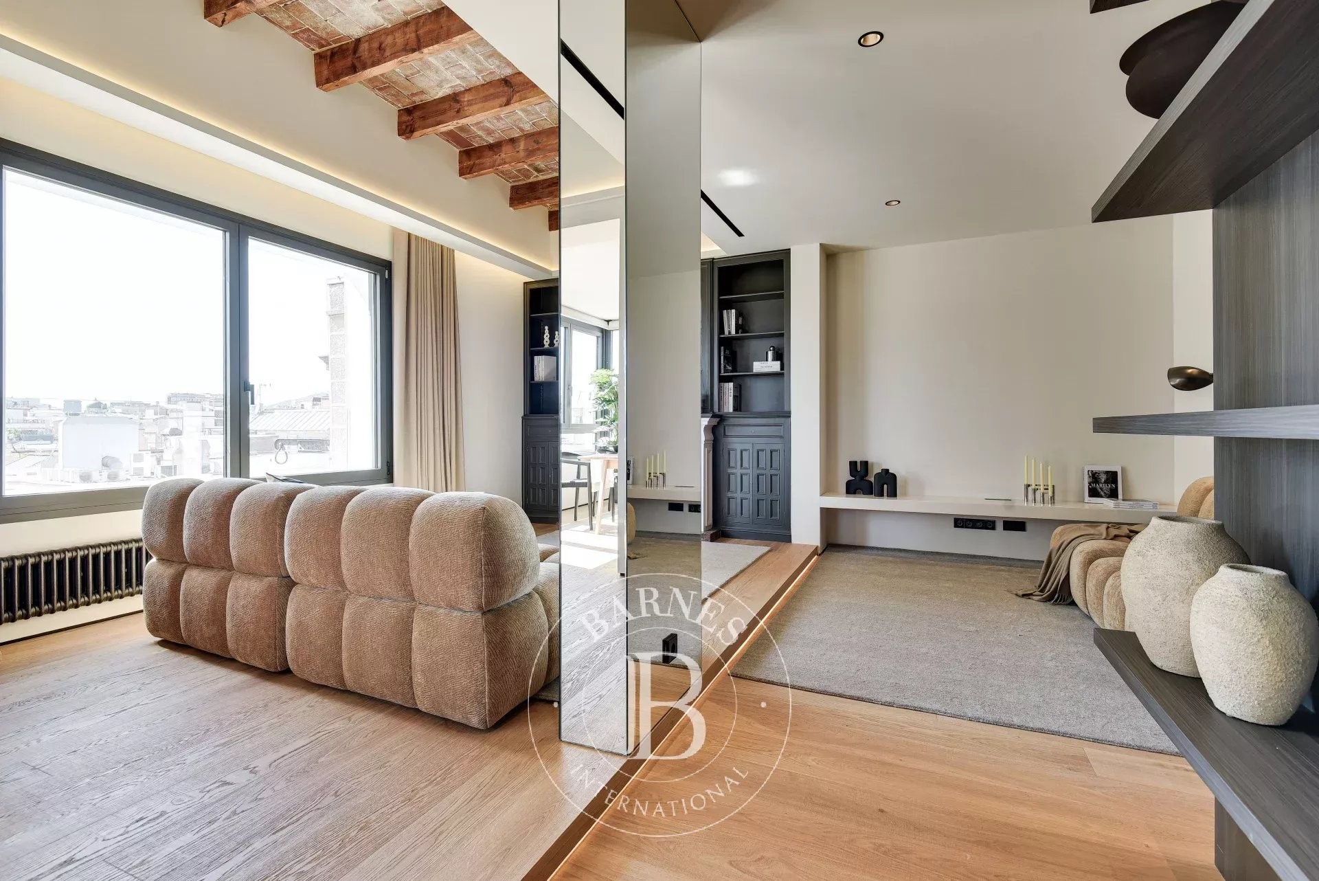 The main living area is a spectacle in itself, featuring large windows that flood the space with natural light and offer captivating views. This spectacular space connects to a magnificent covered terrace, an ideal corner for enjoying the panoramic view of the Catalan city and the splendid modernist architecture that surrounds it, creating an atmosphere that enriches every social or private moment.