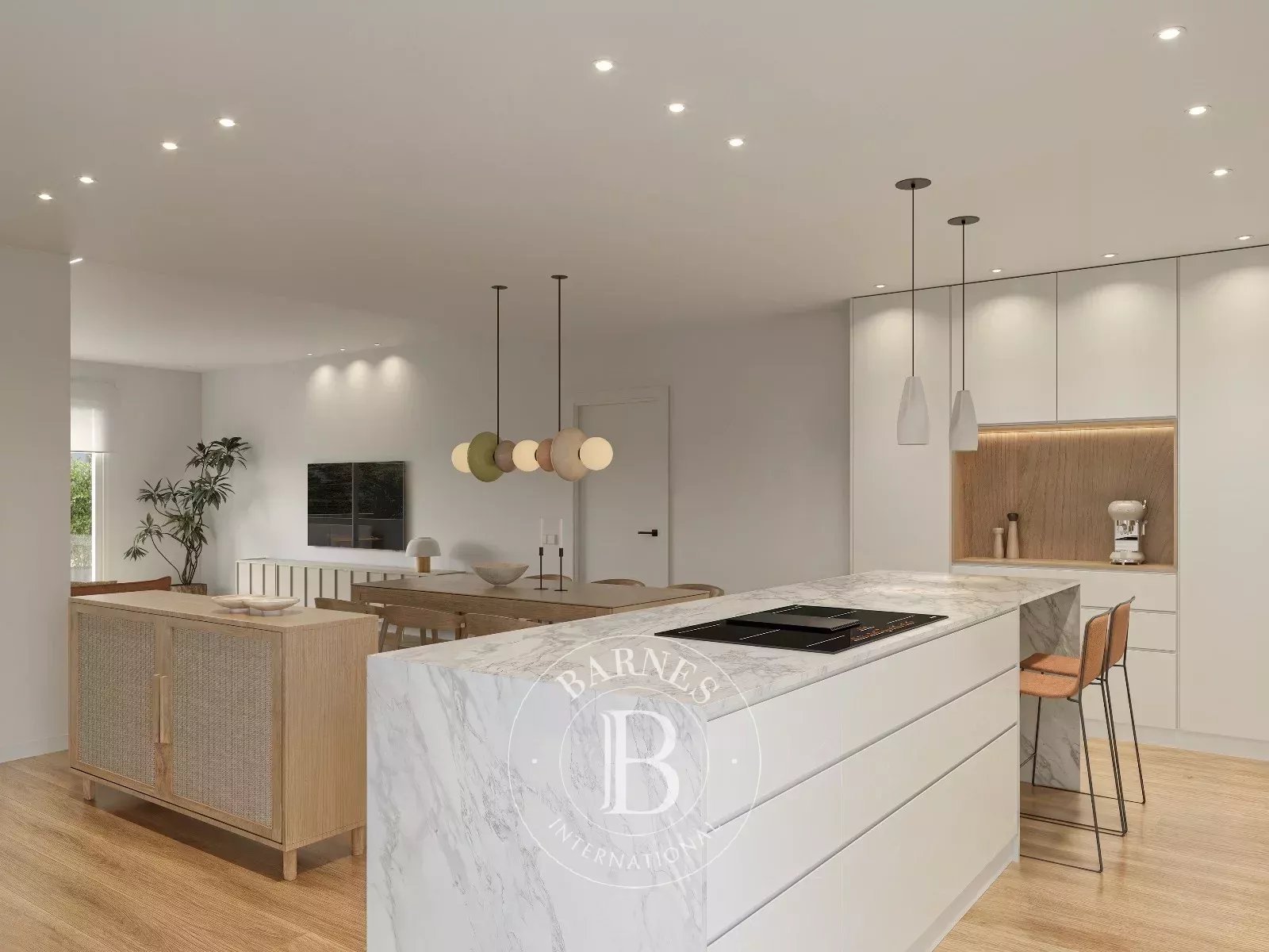 The living areas stand out for their brightness and elegance, with an open-plan layout that seamlessly connects the living room, dining area, and contemporary kitchen, equipped with high-end appliances.