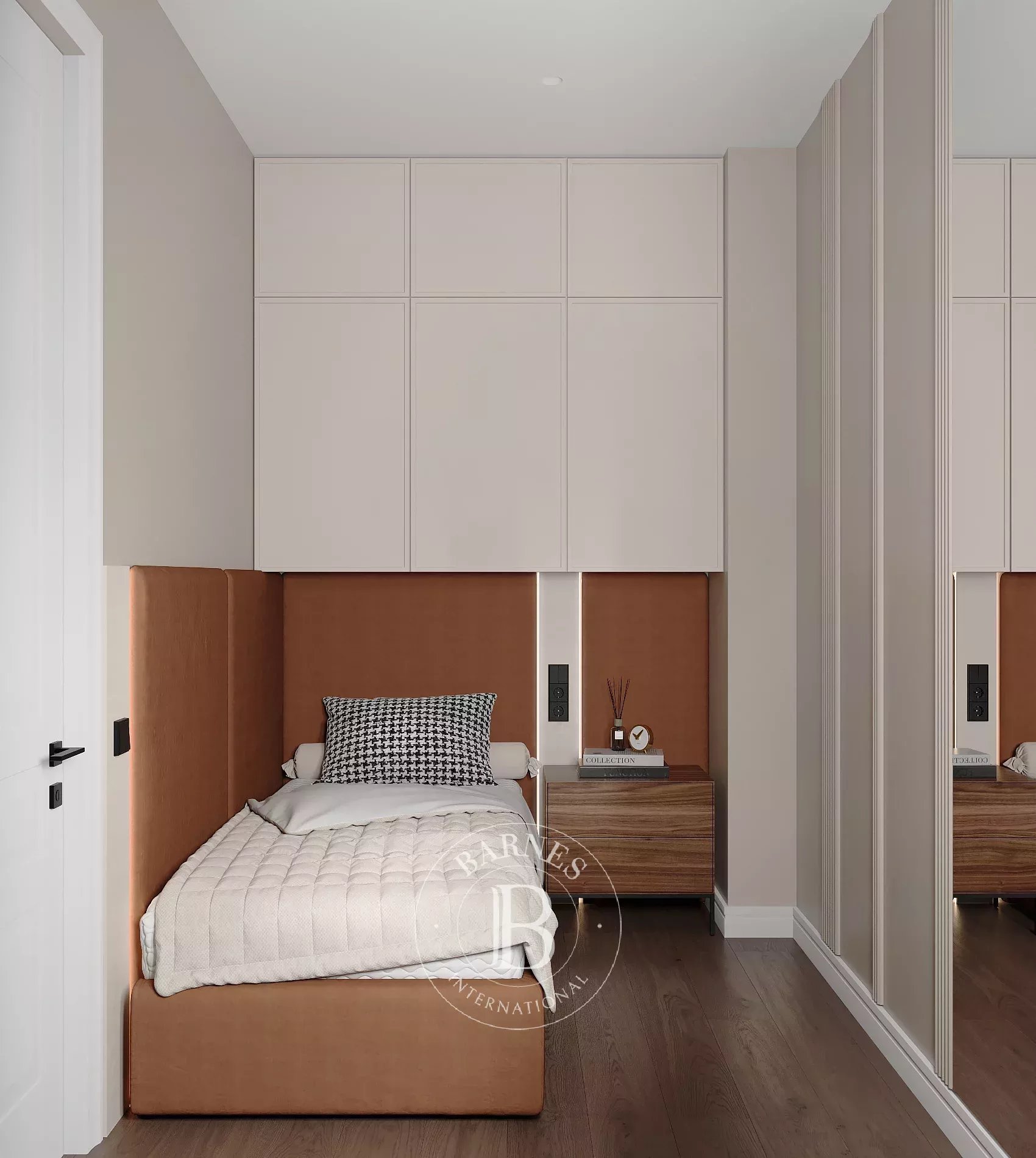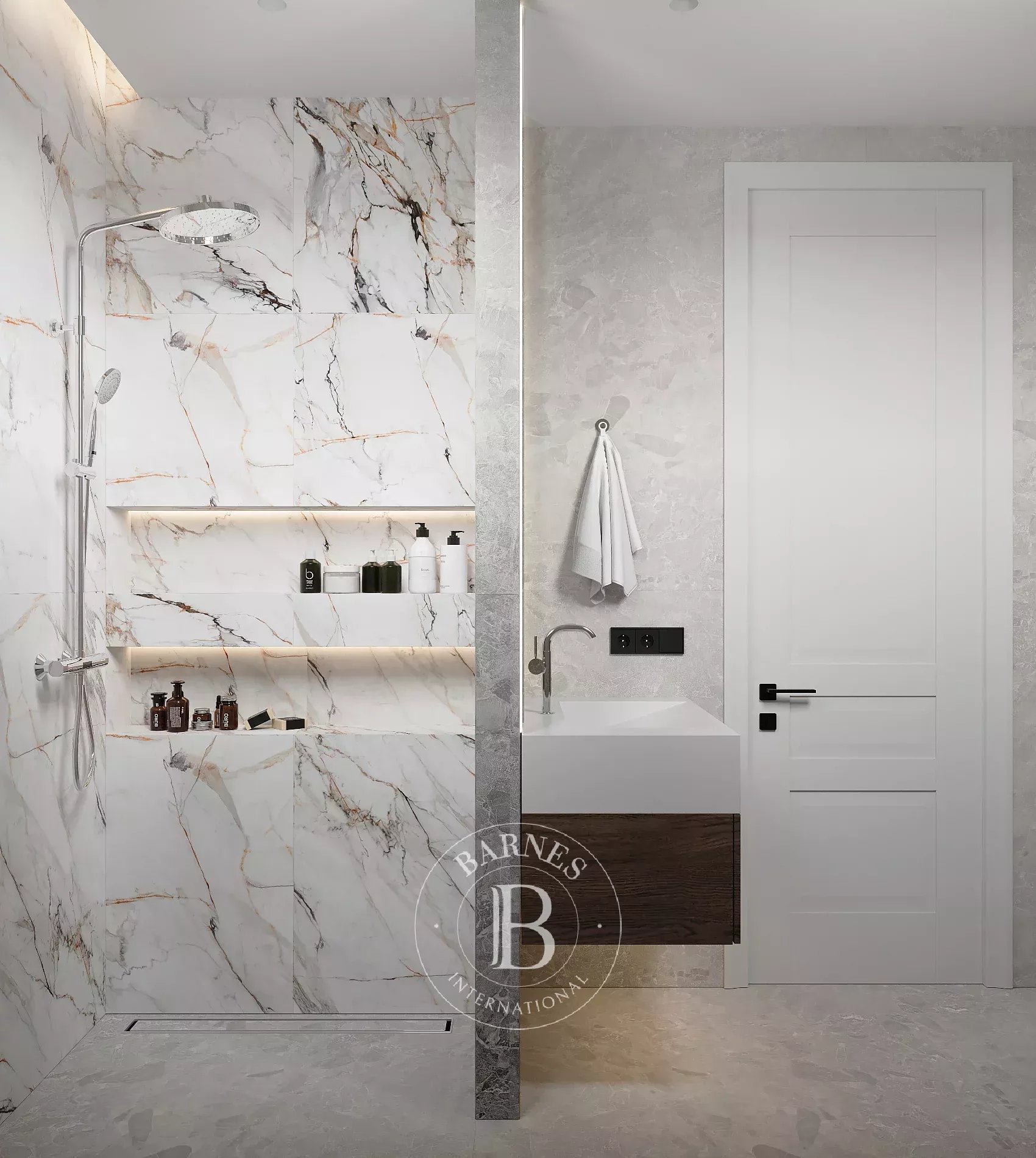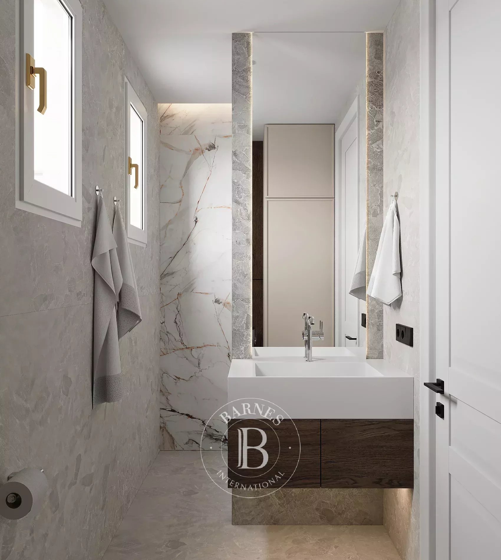 Spanning 166 m², the apartment has been completely renovated. It features four bedrooms — a master suite with a walk-in closet, a second suite with a private bathroom, one double bedroom, and one single bedroom — along with three elegant bathrooms, all equipped with high-quality Italian porcelain finishes and walk-in showers.