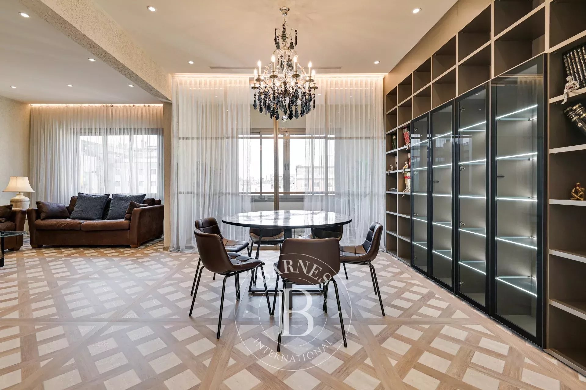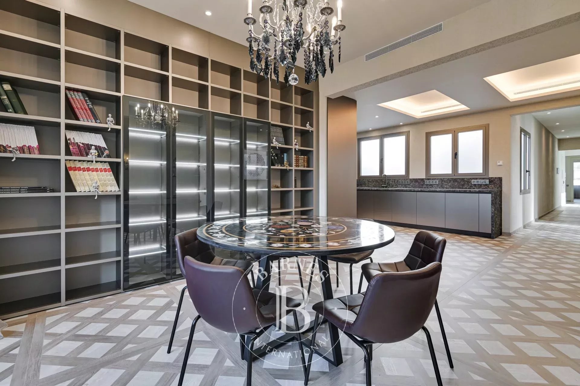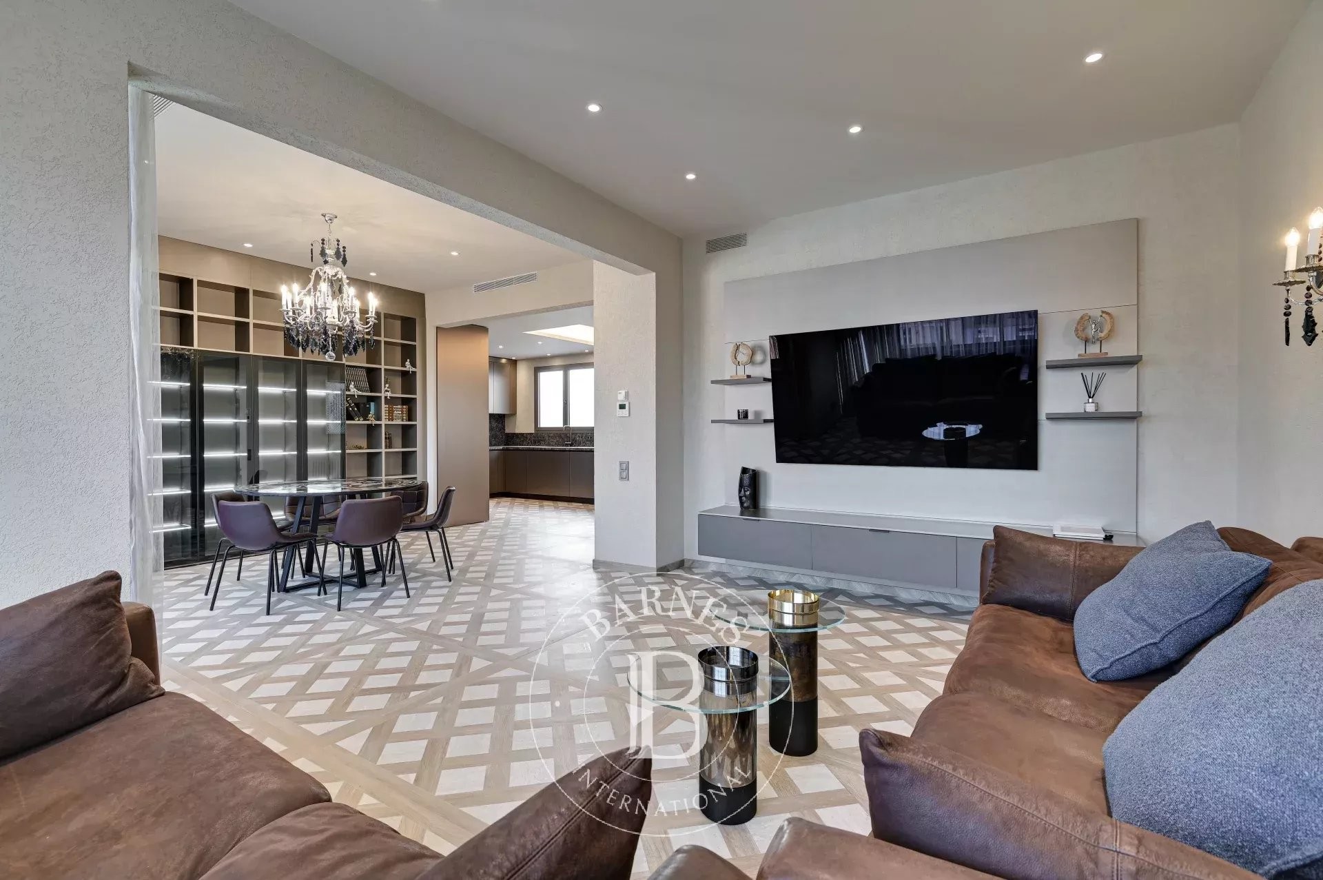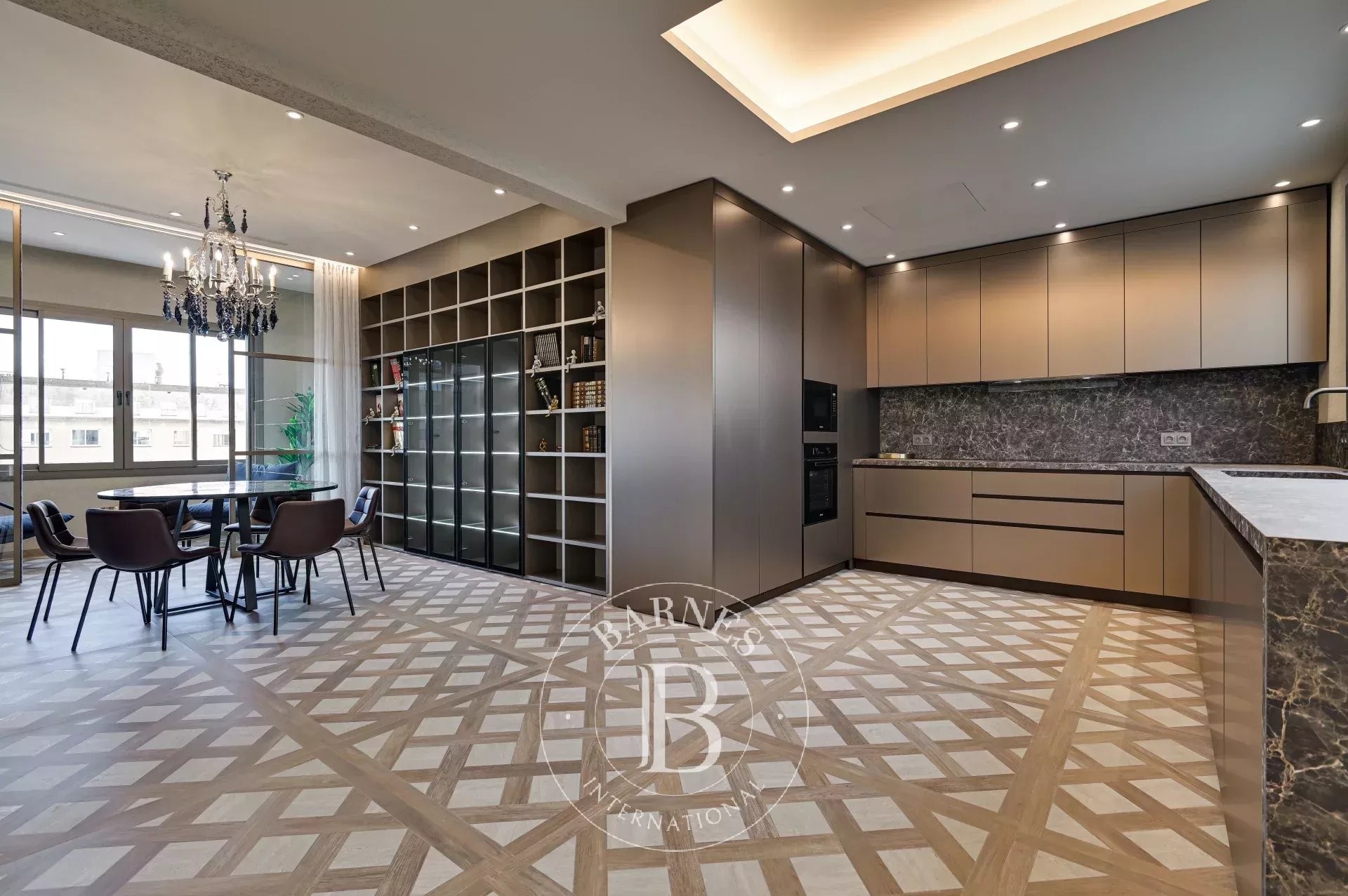 Bathed in natural light, the living-dining room integrates harmoniously with the prestigious TM ITALIA kitchen. Equipped with Miele appliances and high-performance finishes, it combines aesthetics and functionality with absolute precision. The adjacent glazed sun room enhances the sense of space and brightness, creating a warm, refined, and character-filled atmosphere.