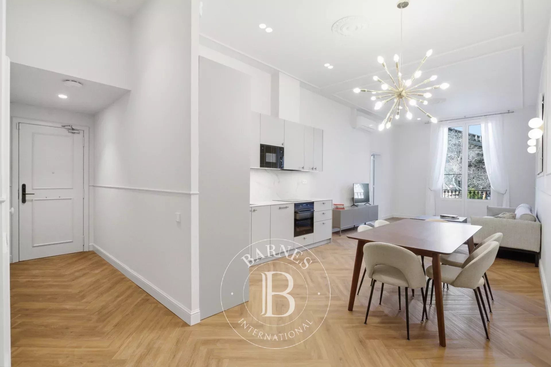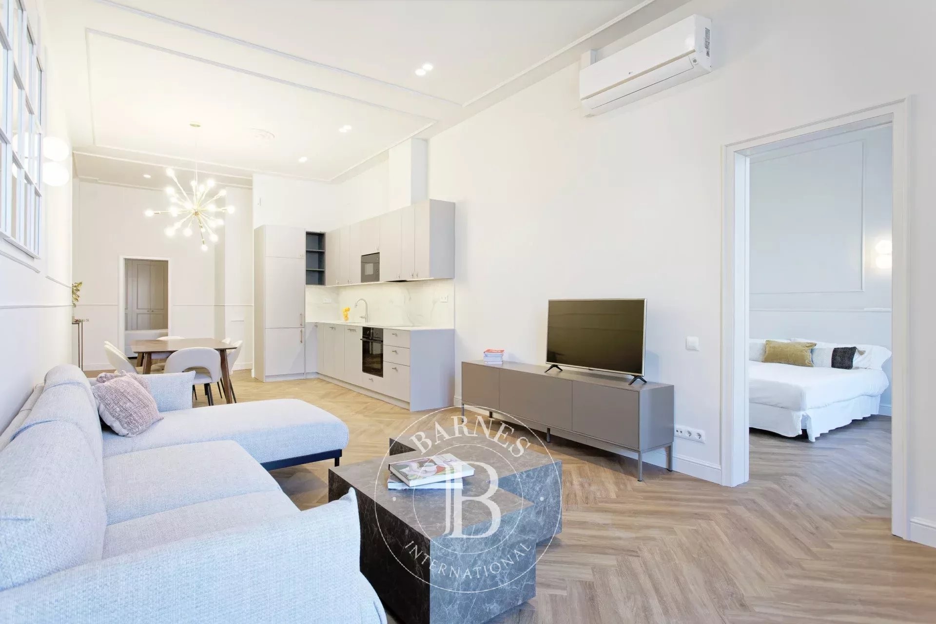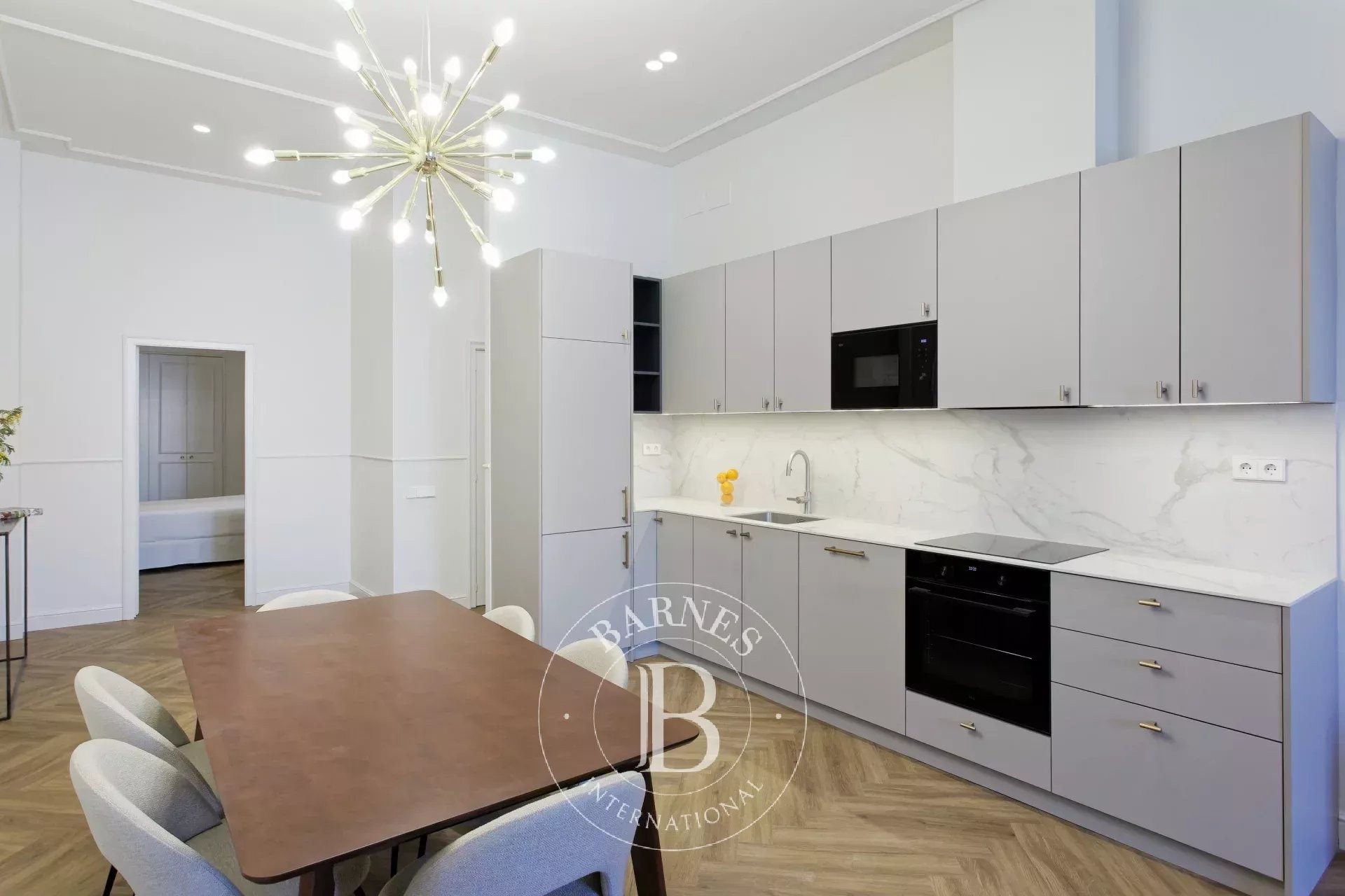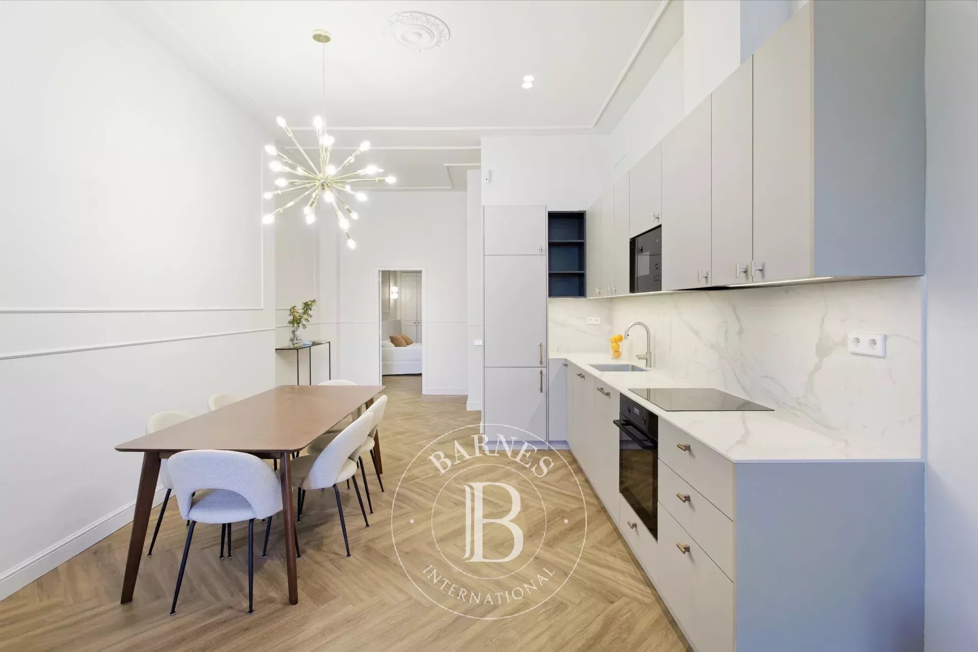 The bright and spacious living-dining room, with a contemporary open-plan kitchen, forms the central hub of the property, combining functionality and elegance in a welcoming and sophisticated atmosphere.