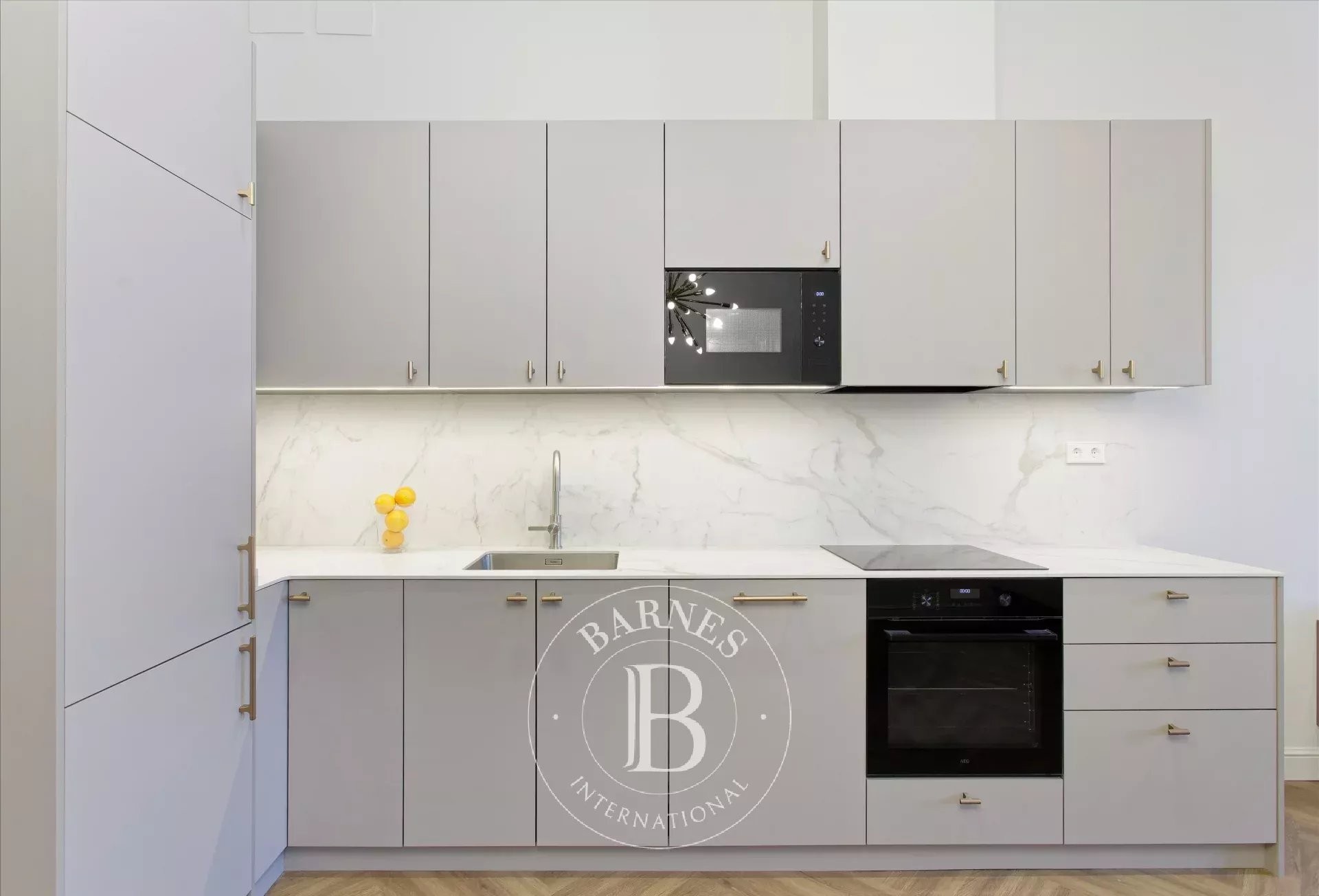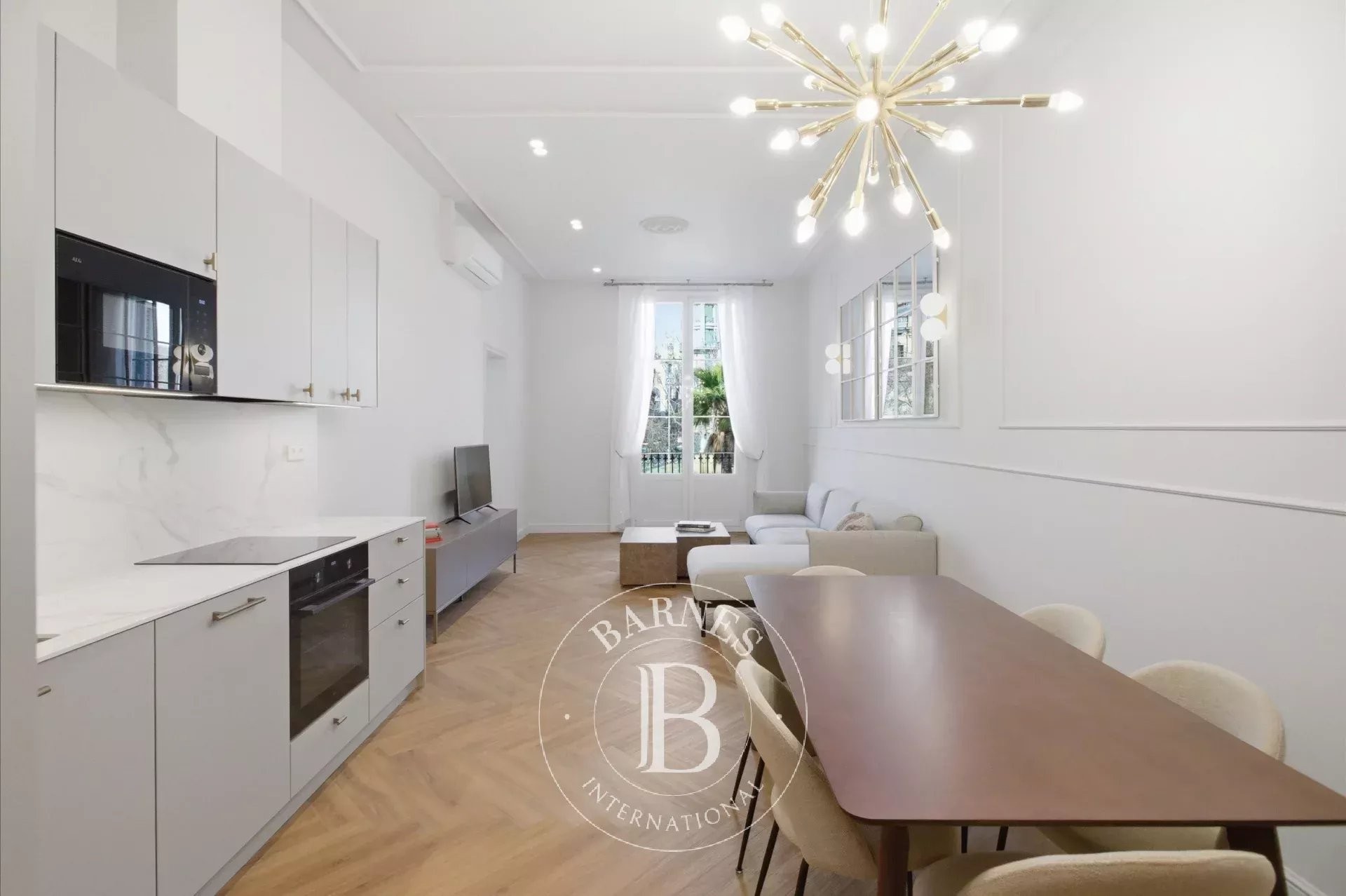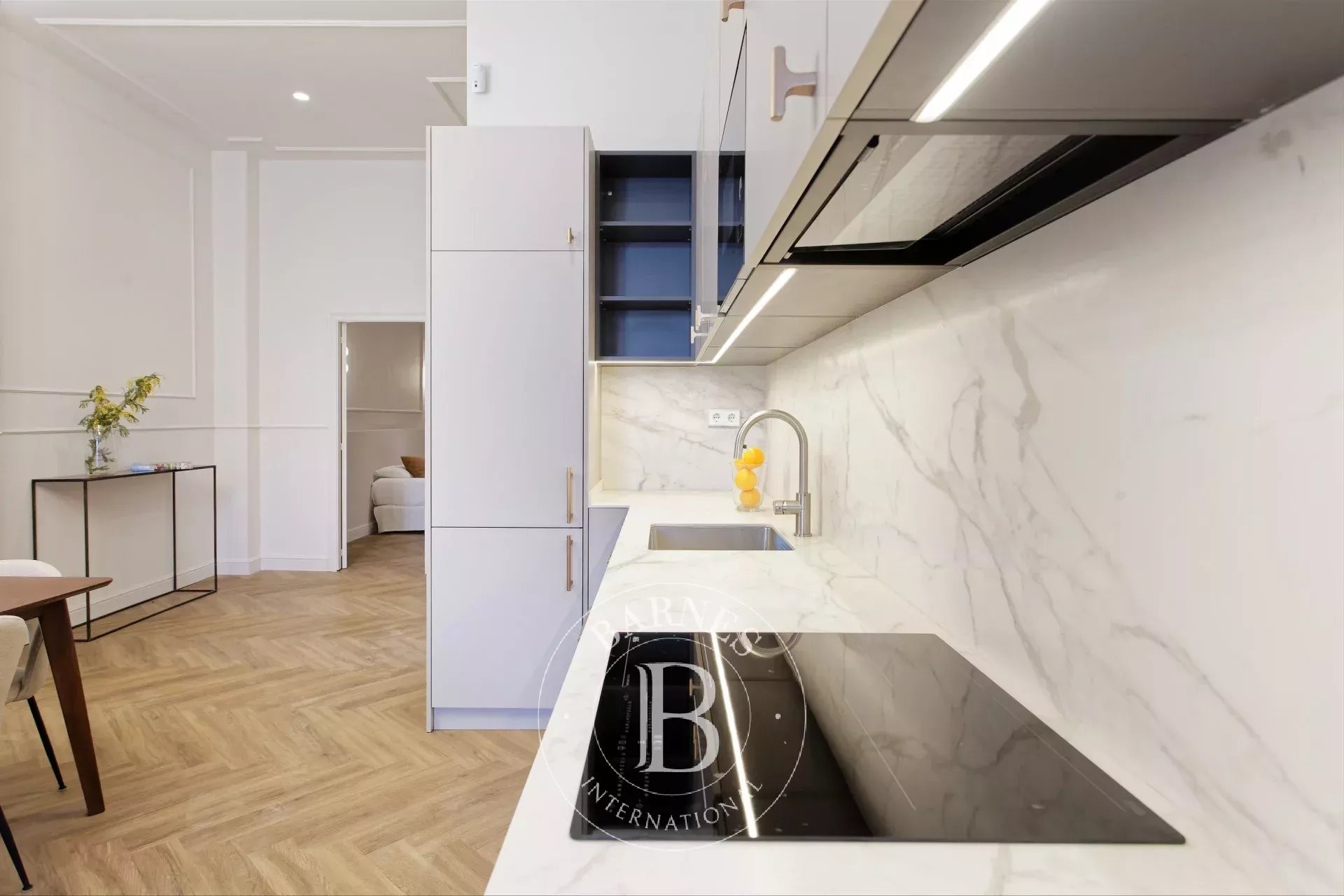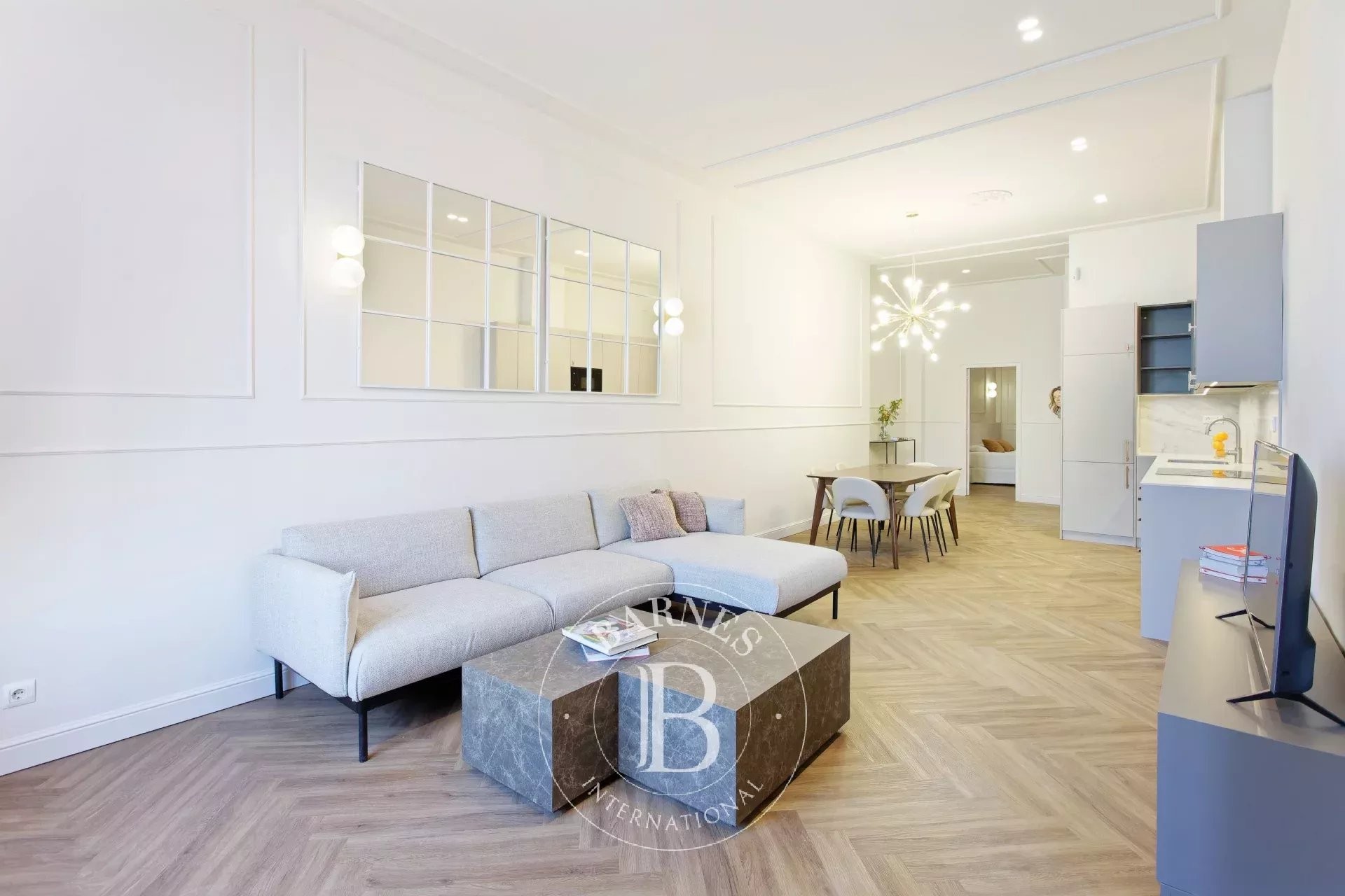 The bright and spacious living-dining room, with a contemporary open-plan kitchen, forms the central hub of the property, combining functionality and elegance in a welcoming and sophisticated atmosphere.