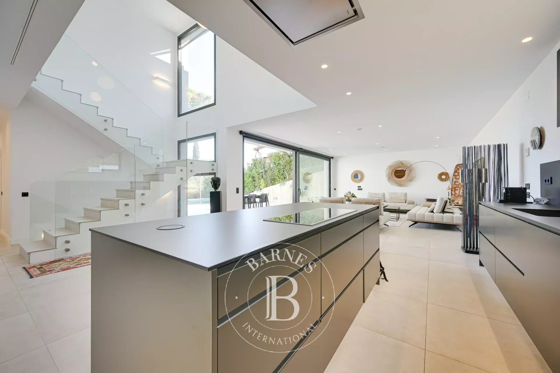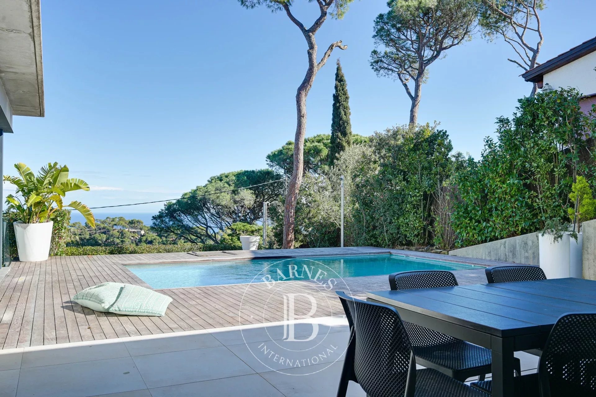 Distributed over three levels connected by a lift, the property offers a functional and comfortable layout. The main floor features a bright living area with living-dining room and fully equipped open-plan kitchen, with direct access to the porch and the swimming pool area surrounded by teak decking. This level also includes two bedrooms with garden access, one of them en-suite with dressing room.