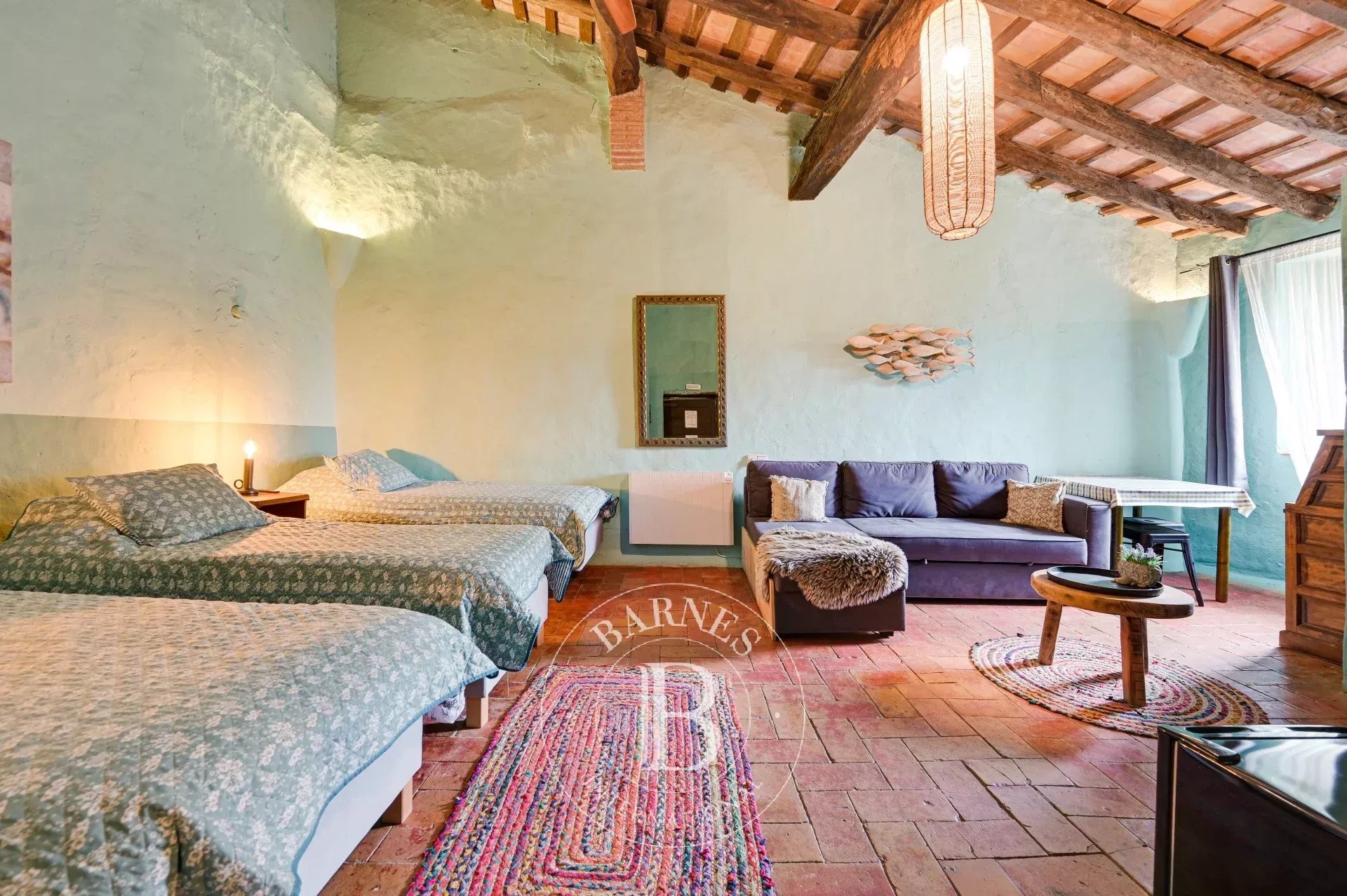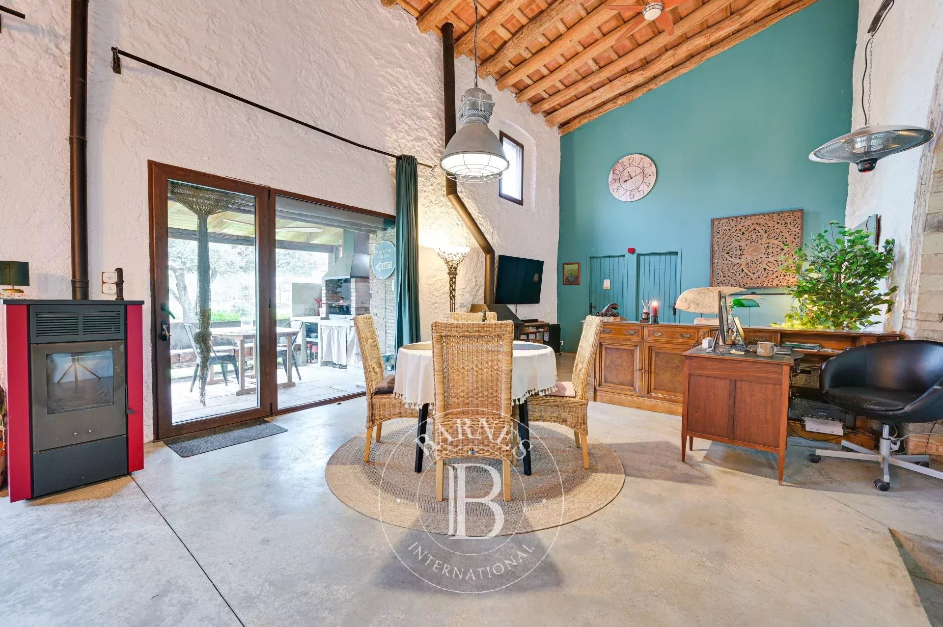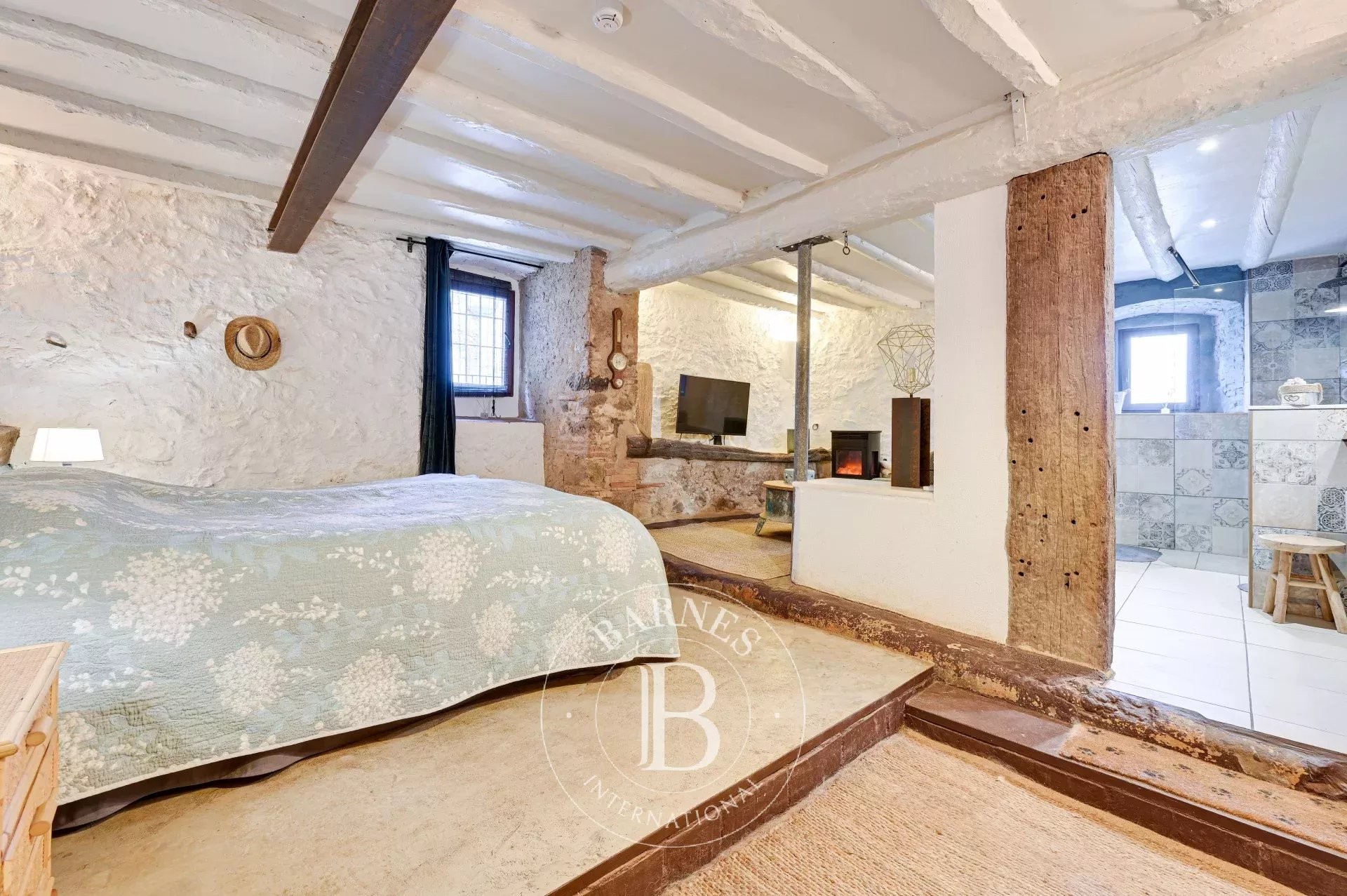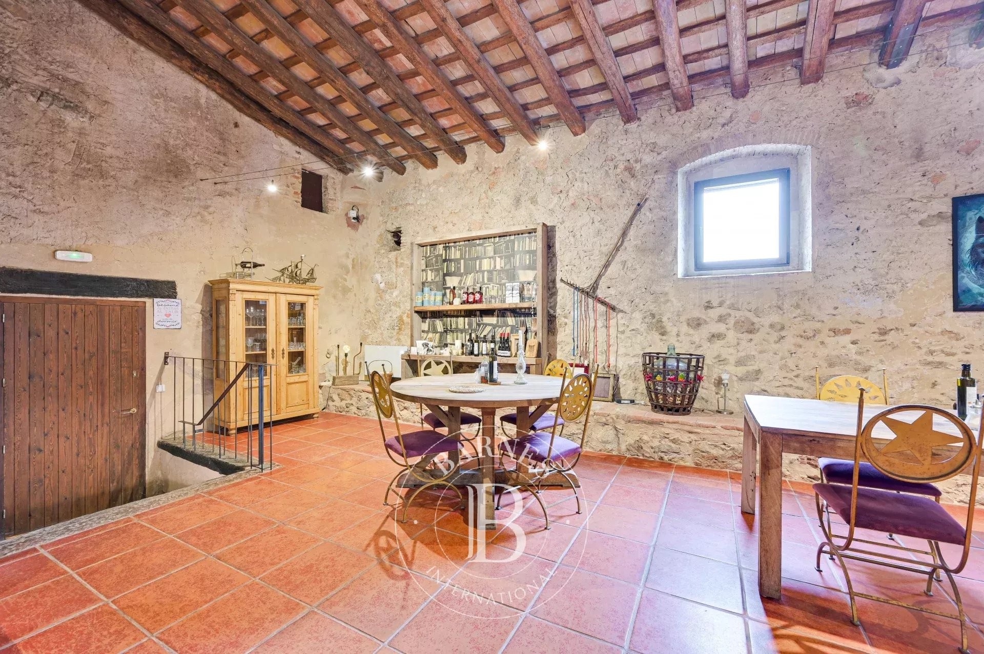 The former barn has been carefully renovated to accommodate a second residence distributed over two floors. It features an open-plan kitchen with central island, a bright living-dining room, a bathroom and guest toilet, two en-suite bedrooms, and a large workshop/garage. Both levels can function independently, offering excellent potential for expansion or complementary uses.