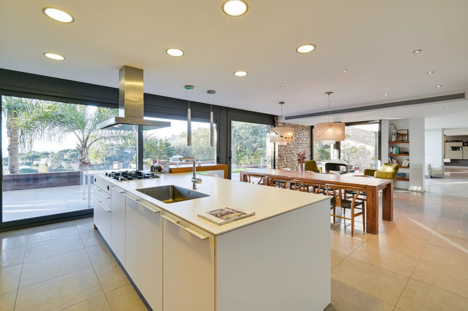The house of 507 m2 built is divided into several floors all of them connected by stairs and lift, on the floor at garden and pool level we find a large dining room with open kitchen where a fireplace of avant-garde design gives an added value of warmth to those family gatherings or with friends. On this same floor and also with access to the terrace we will enjoy a lounge - cinema or music room for those moments of relaxation and with sea views.