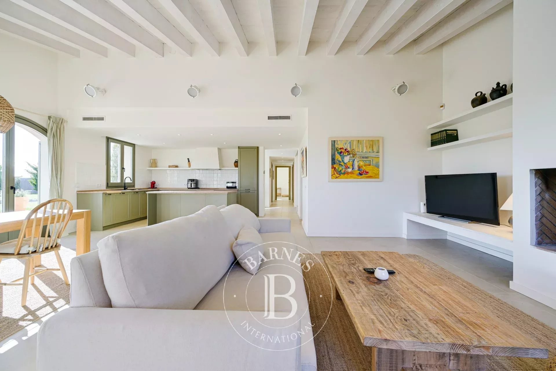 The main residence, together with an annex building, offers a total built area of approximately 374 sqm. The house is arranged in spacious, light-filled interiors, with a south-facing orientation and open views over the landscape, creating a constant connection with the outdoors.