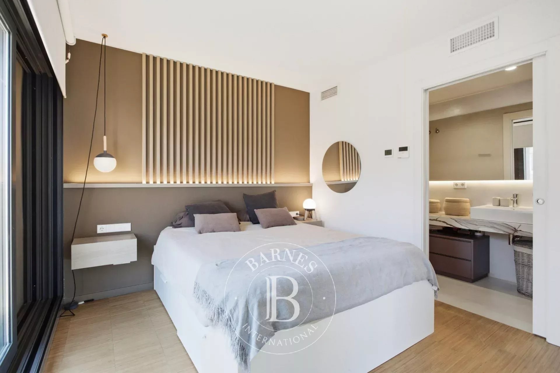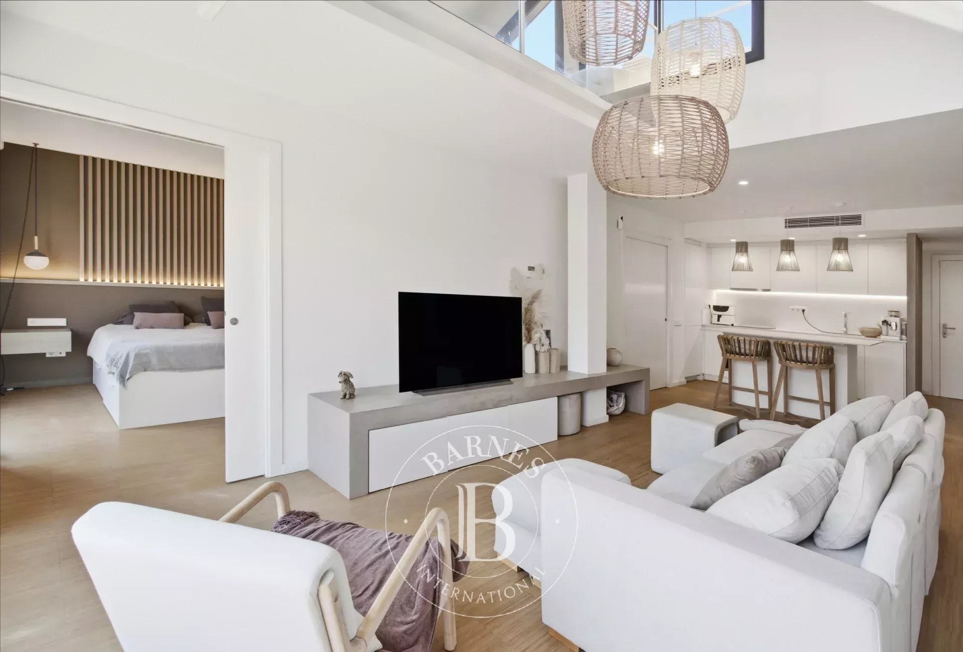 Desde la entrada, su arquitectura moderna y los amplios volúmenes destacan por su luminosidad excepcional: los ventanales de doble altura y el mobiliario a medida crean un interior chic, funcional y acogedor. La planta principal ofrece un espacio de vida abierto que integra salón, comedor y cocina abierta, ideal para recibir en un ambiente cálido y agradable. Dos suites principales con baño privado completan esta planta, garantizando el máximo confort.