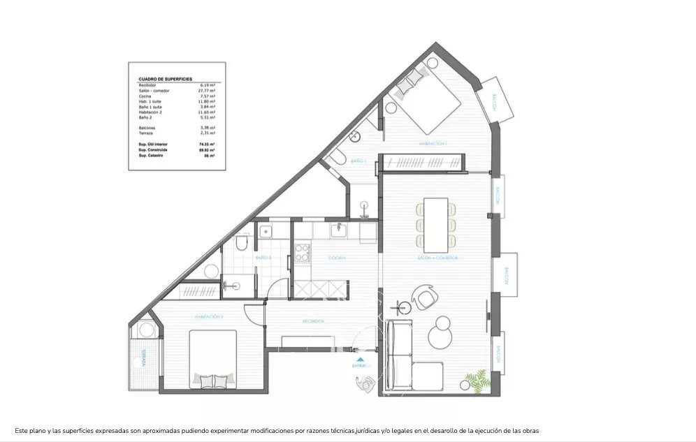 La vivienda dispone de dos amplios dormitorios dobles, ambos con acceso directo a una terraza privada y a un balcón, así como dos baños completos cuidadosamente acabados. Se vende completamente amueblada, con mobiliario de alta calidad que complementa su diseño y permite entrar a vivir de inmediato.