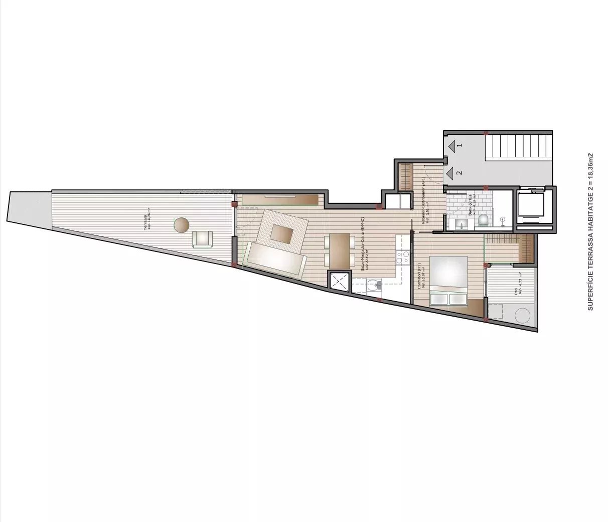 La vivienda dispone de una terraza privada de 18 m², un valor añadido que amplía el espacio habitable y permite disfrutar del aire libre en un entorno urbano tranquilo. El salón-comedor con cocina abierta, totalmente equipada, se abre a la terraza, proporcionando una excelente entrada de luz natural y una agradable continuidad entre interior y exterior.
