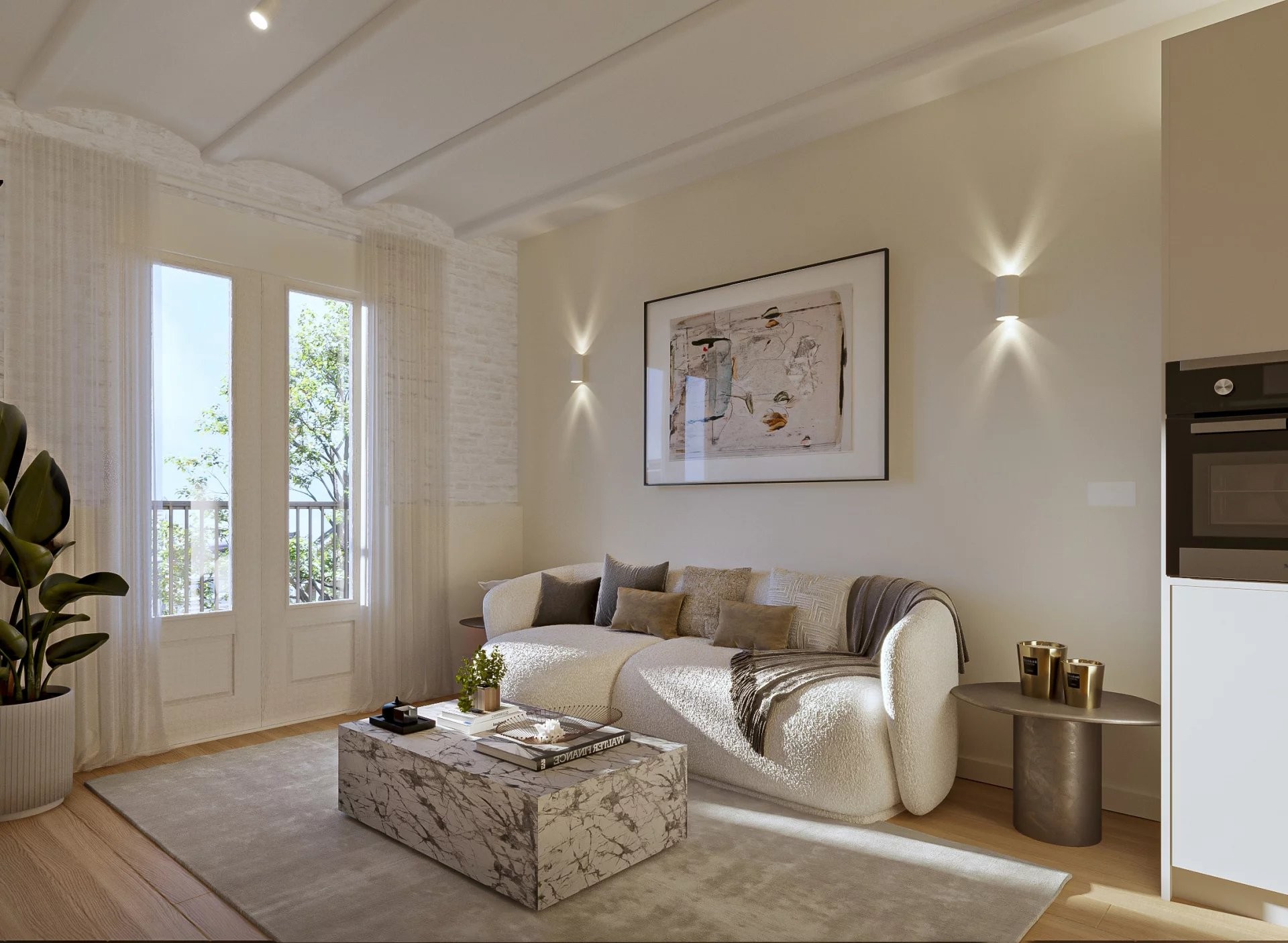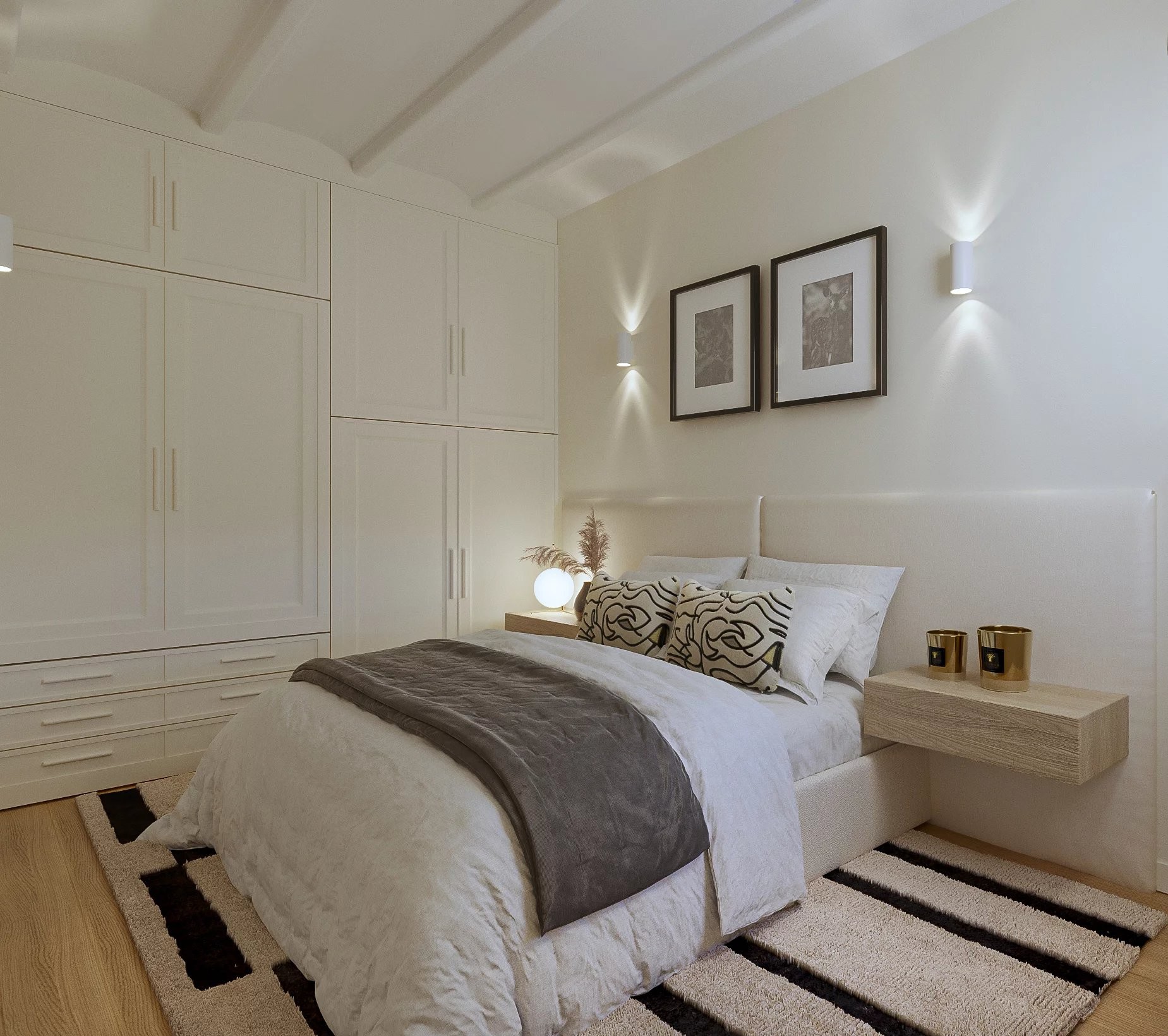 La vivienda ofrece una distribución cómoda y bien resuelta,con dos dormitorios dobles y dos baños, uno de ellos en suite. La reforma ha sabido conservar elementos originales como los techos de bóveda catalana, cuidadosamente restaurados, que aportan carácter y autenticidad al espacio. Estos conviven de forma natural con suelos de madera natural y microcemento, creando un equilibrio sobrio entre tradición y diseño contemporáneo. Los armarios empotrados, integrados de manera discreta, optimizan el almacenamiento sin alterar la armonía del conjunto.