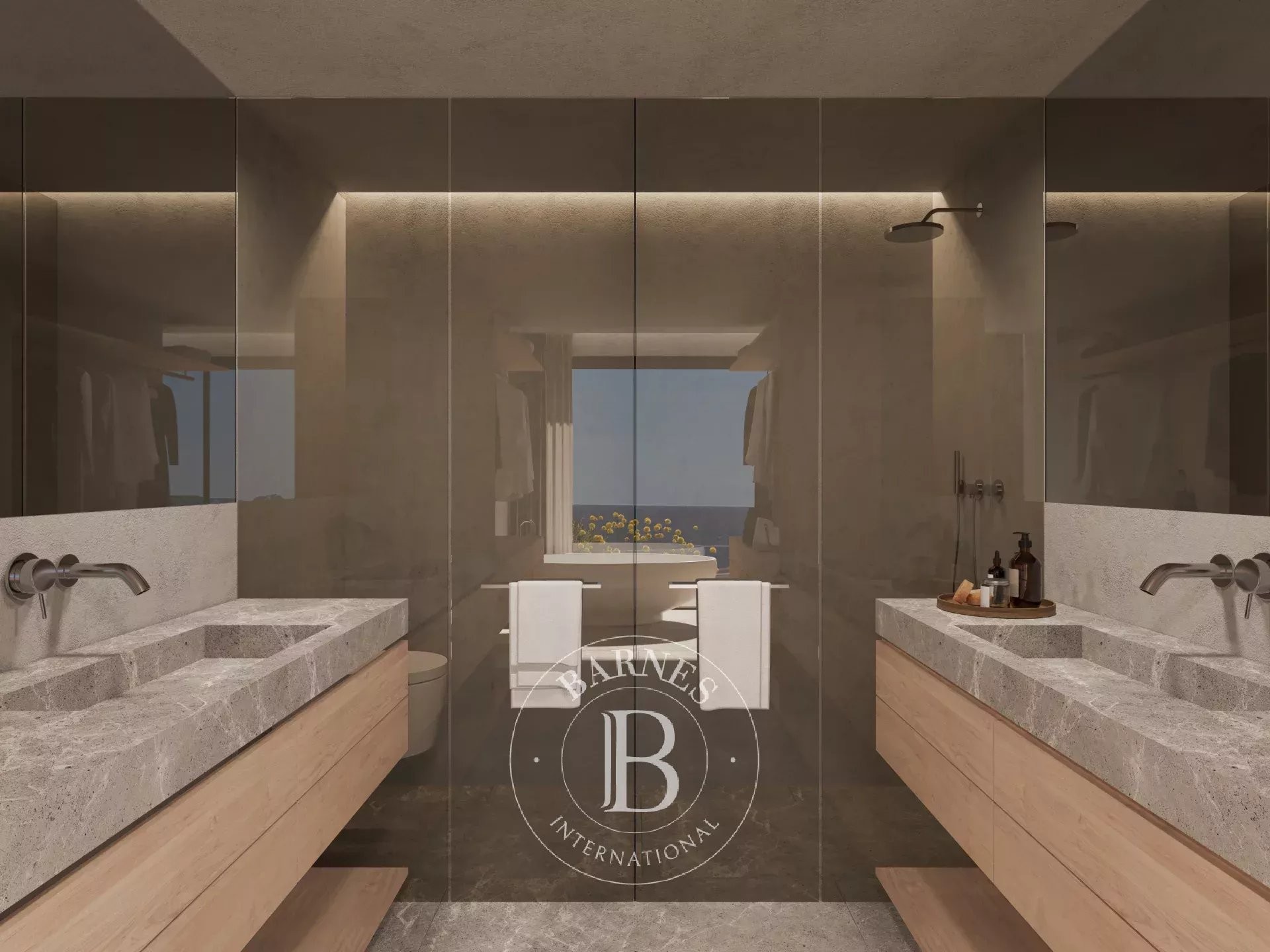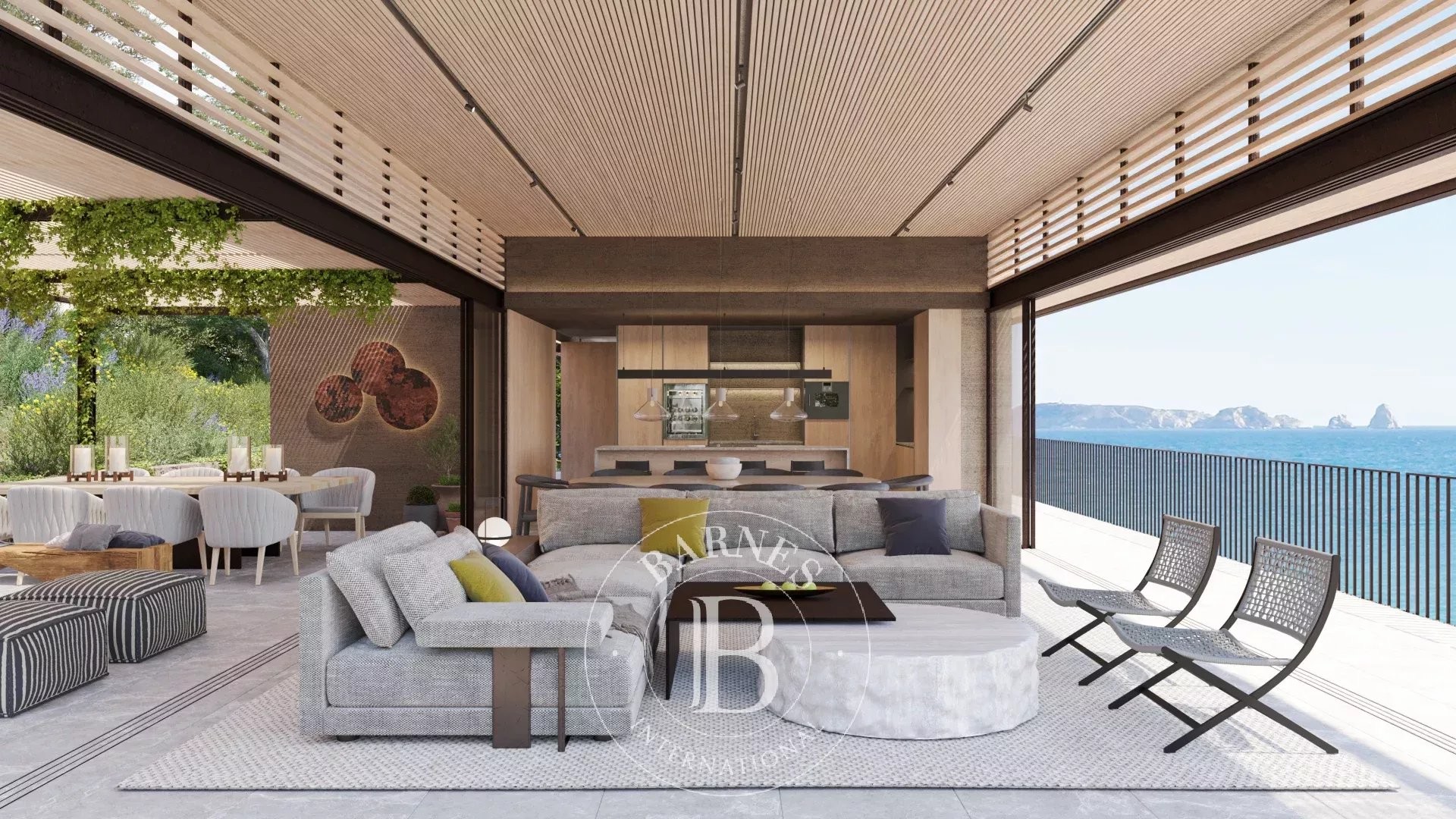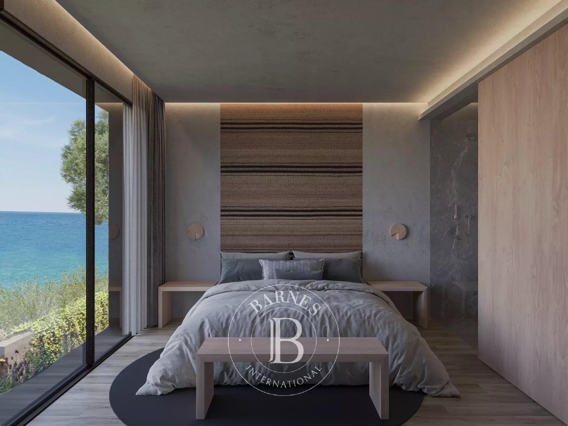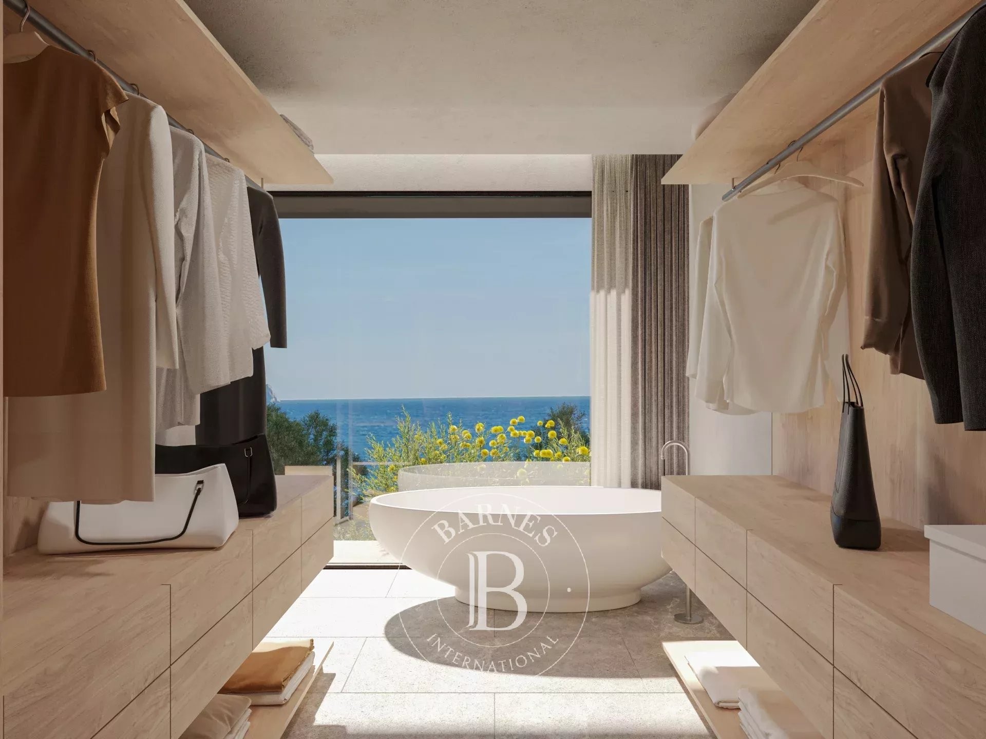 La primera planta alberga cuatro dormitorios dobles en suite con vestidor, todos con vistas al mar, además de una sala familiar. La planta superior acoge la zona de día con un amplio salón-comedor y cocina abierta, grandes ventanales que conectan con la terraza y el jardín, piscina infinita y zona chill-out con fire pit. En este nivel se encuentra también la segunda master suite, con terraza privada y máxima privacidad.