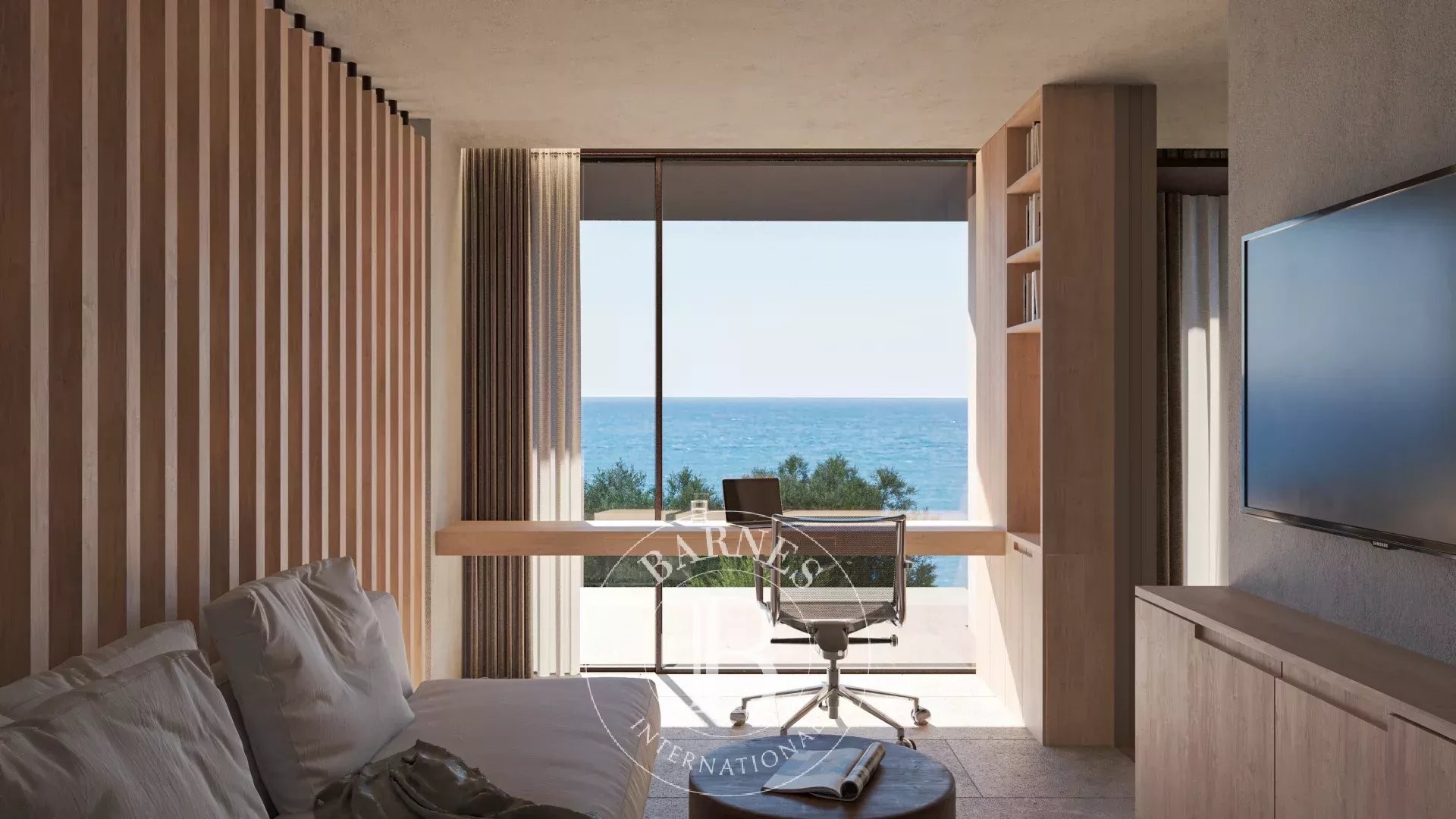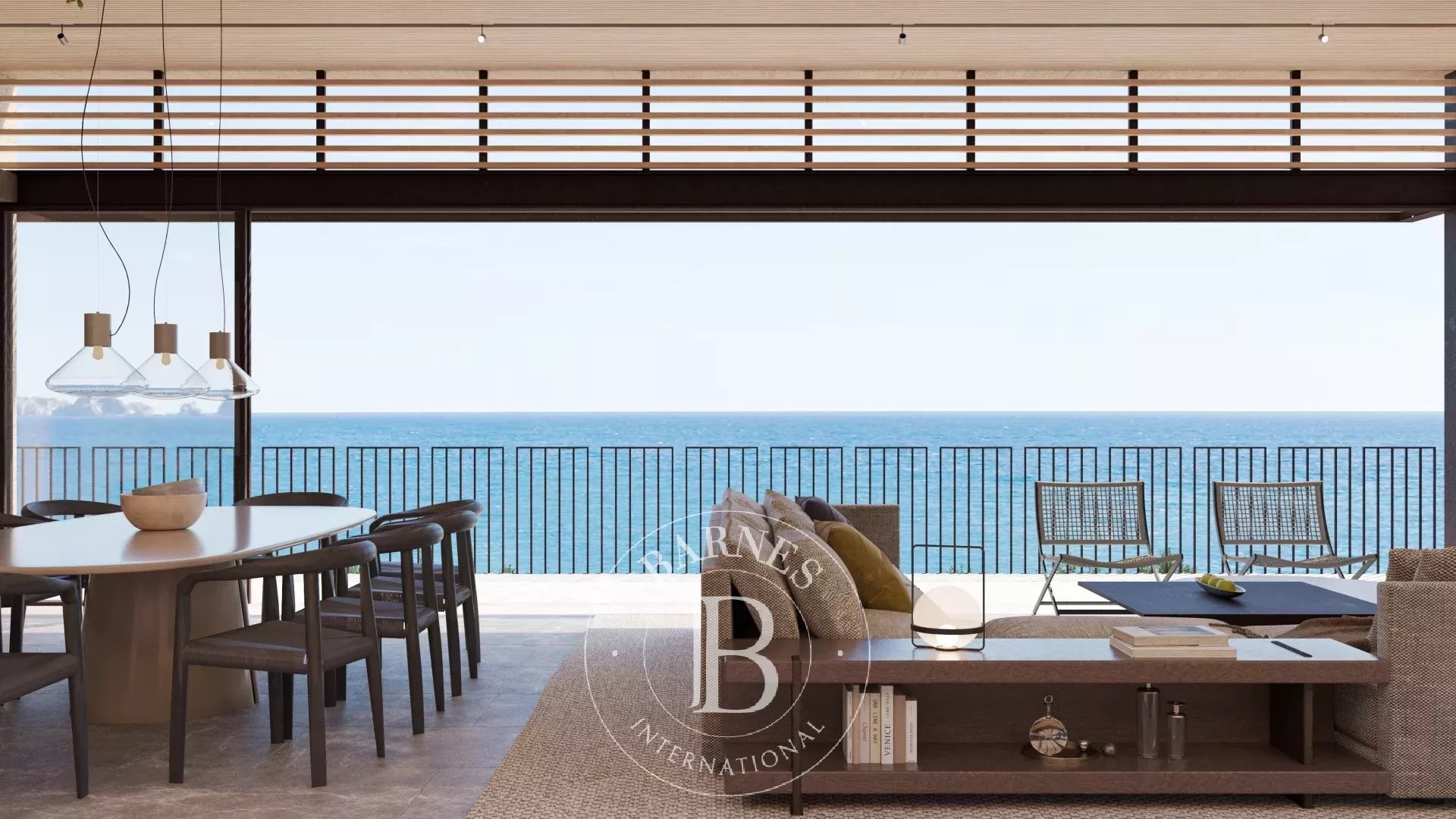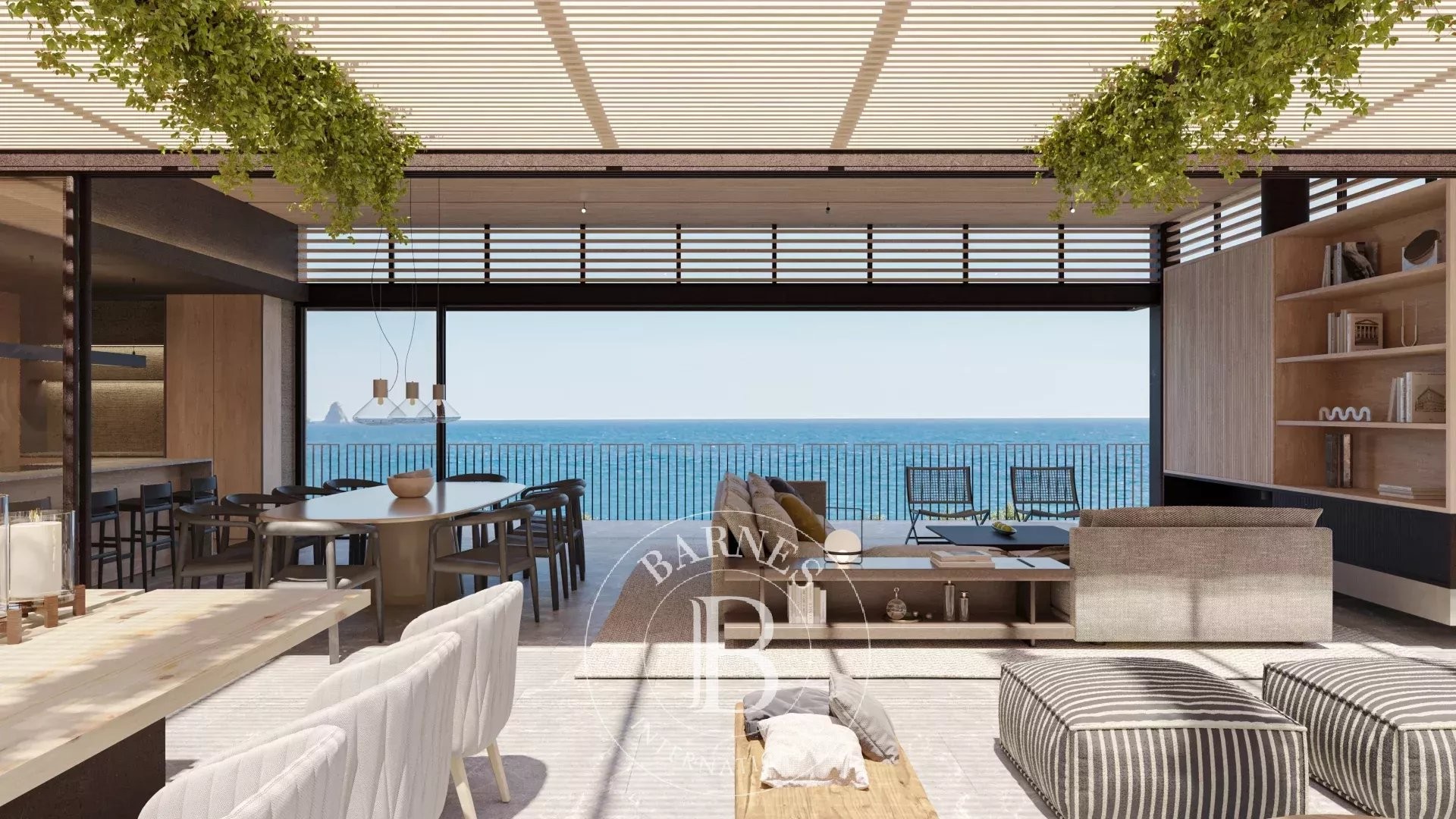 La primera planta alberga cuatro dormitorios dobles en suite con vestidor, todos con vistas al mar, además de una sala familiar. La planta superior acoge la zona de día con un amplio salón-comedor y cocina abierta, grandes ventanales que conectan con la terraza y el jardín, piscina infinita y zona chill-out con fire pit. En este nivel se encuentra también la segunda master suite, con terraza privada y máxima privacidad.