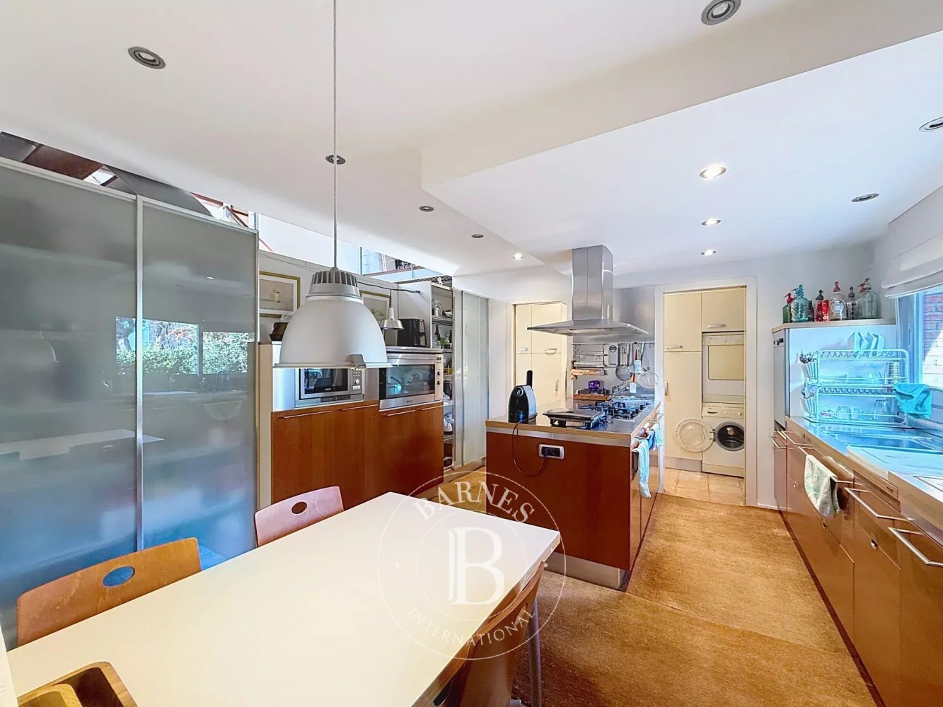 La planta principal acoge un gran salón-comedor con chimenea y salida directa al jardín, donde la vegetación, la madera y el sonido del agua invitan al descanso. La cocina office, amplia y práctica, se conecta con una zona de lavado independiente y un aseo de cortesía.
