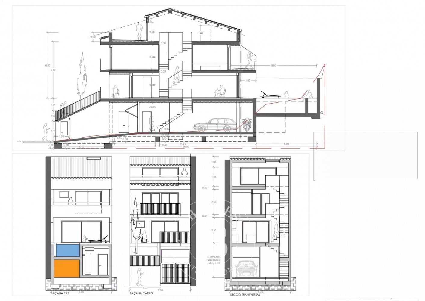 El garaje privado tiene capacidad para tres coches o bien dos vehículos y varias motos, además de un área de almacenaje. Desde esta planta, existe la posibilidad de instalar un ascensor que conecte todas las alturas de la vivienda, desde el aparcamiento hasta la planta superior, aportando un plus de comodidad y accesibilidad.
