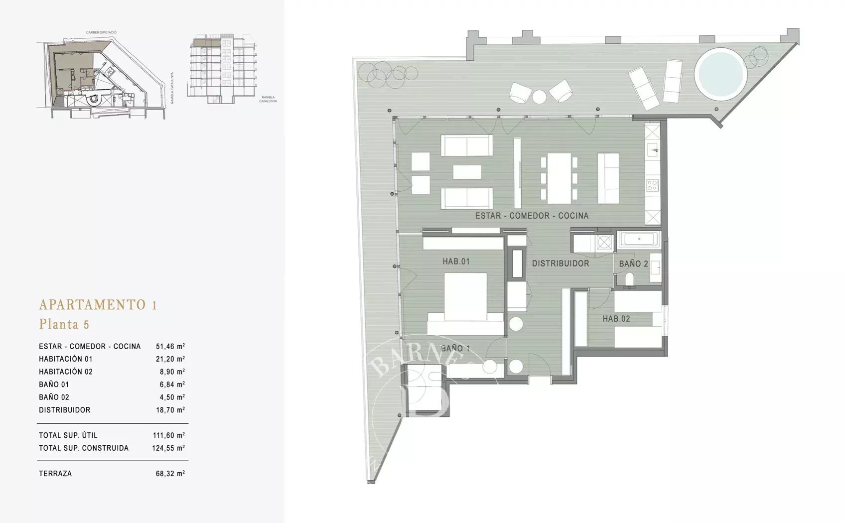 Ce superbe penthouse neuf se situe en plein cœur de la Rambla Catalunya, l’une des avenues les plus emblématiques et prisées de Barcelone.