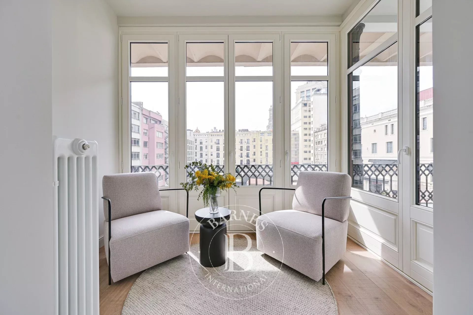Un élégant salon-salle à manger donnant sur Pau Claris, associé à une cuisine ouverte, crée un espace de vie lumineux et convivial, conçu pour profiter de la vie urbaine avec style.