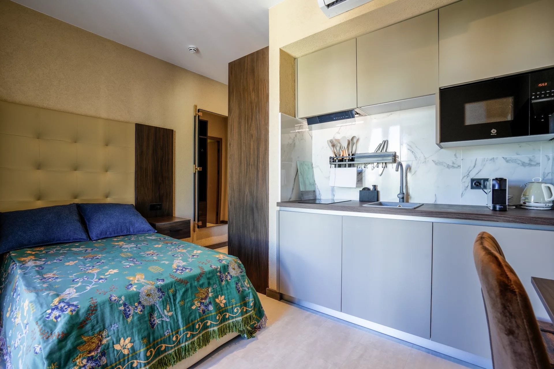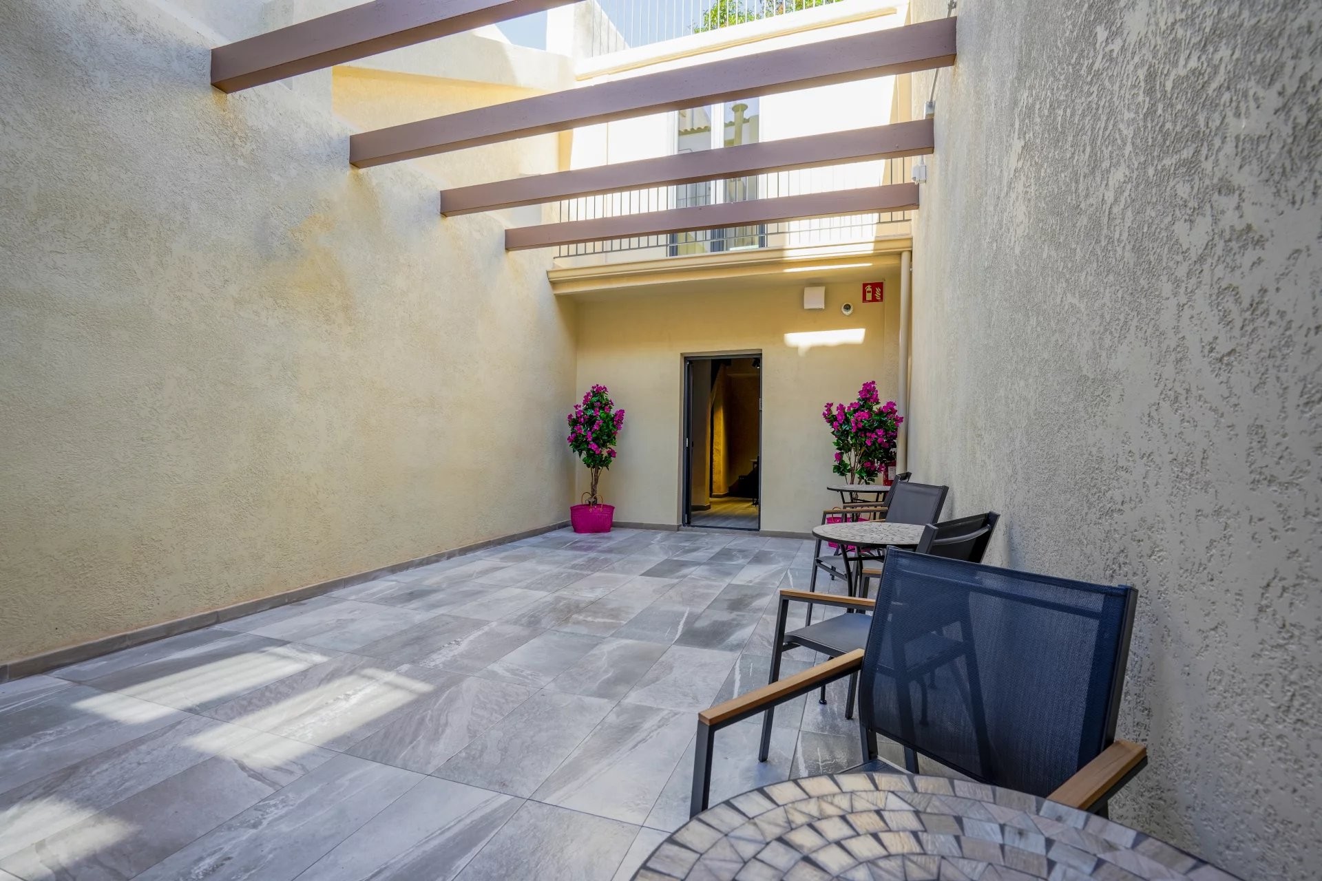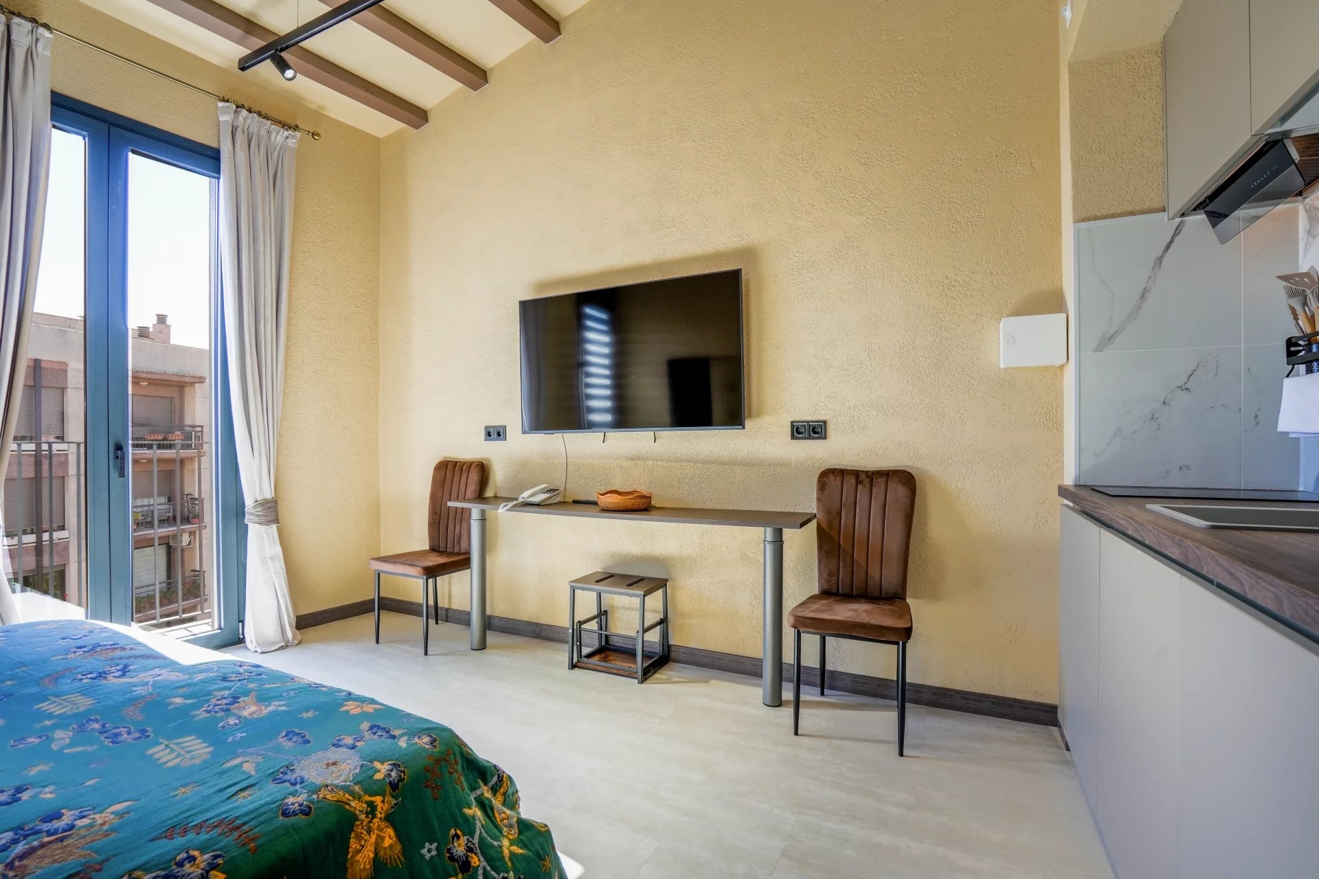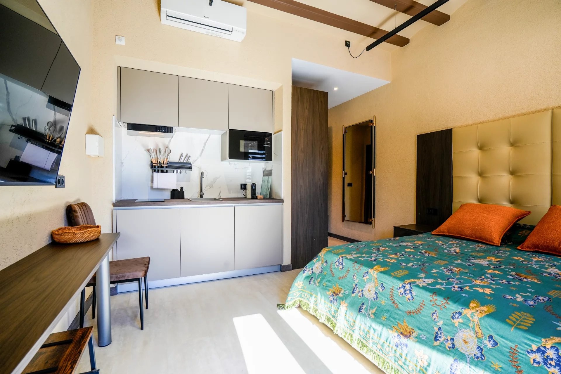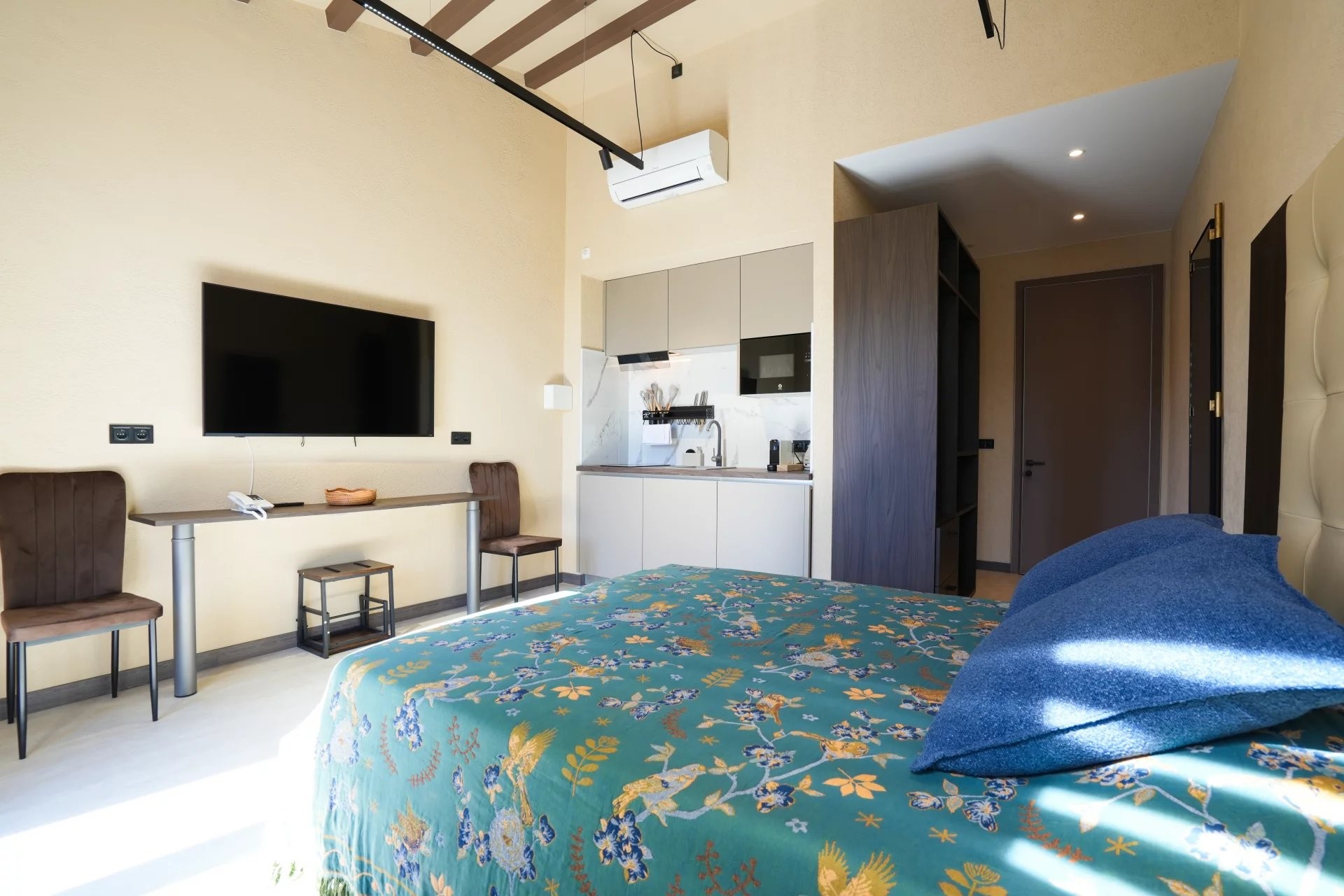 Le bâtiment principal comprend six studios élégamment aménagés, pensés pour maximiser confort et fonctionnalité tout en conservant une esthétique chaleureuse et élégante. Complétant l’ensemble, une maison indépendante s’organise autour d’un charmant patio privé, créant un espace paisible et intime qui renforce l’expérience des clients.