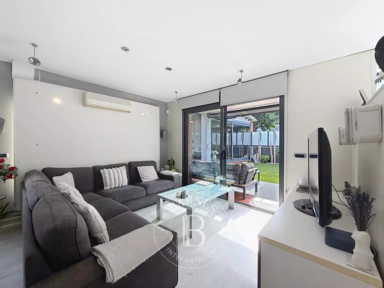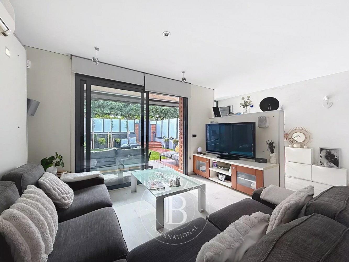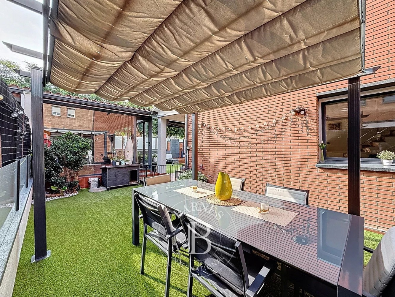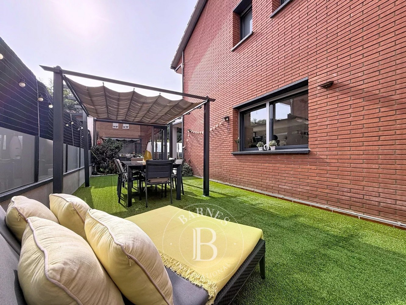 Depuis le salon, on accède à l’extérieur où se trouve un espace chill-out couvert, parfait pour les dîners d’été, ainsi qu’une piscine privée entourée de gazon artificiel de dernière génération, apportant une touche moderne et pratique à l’ensemble.